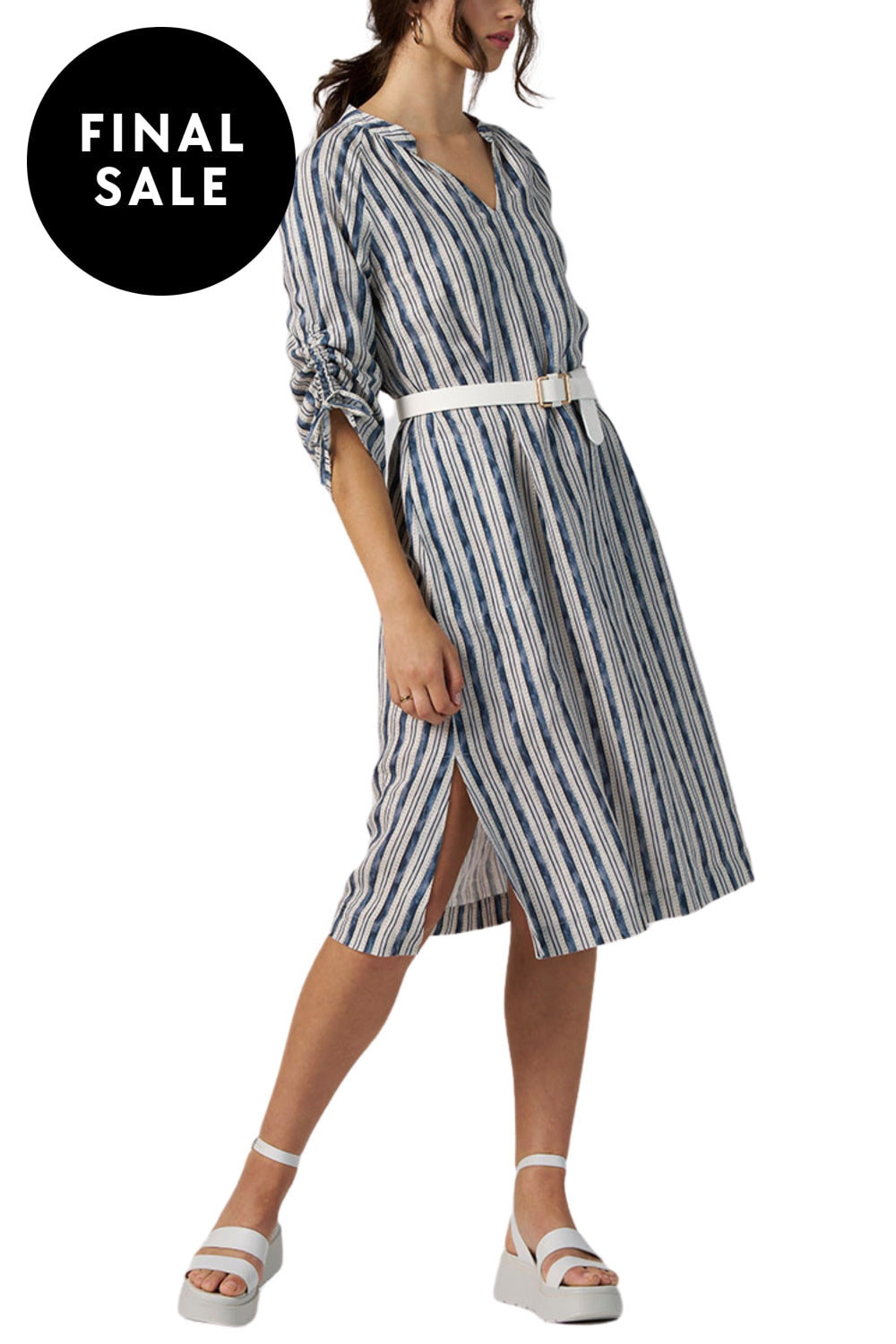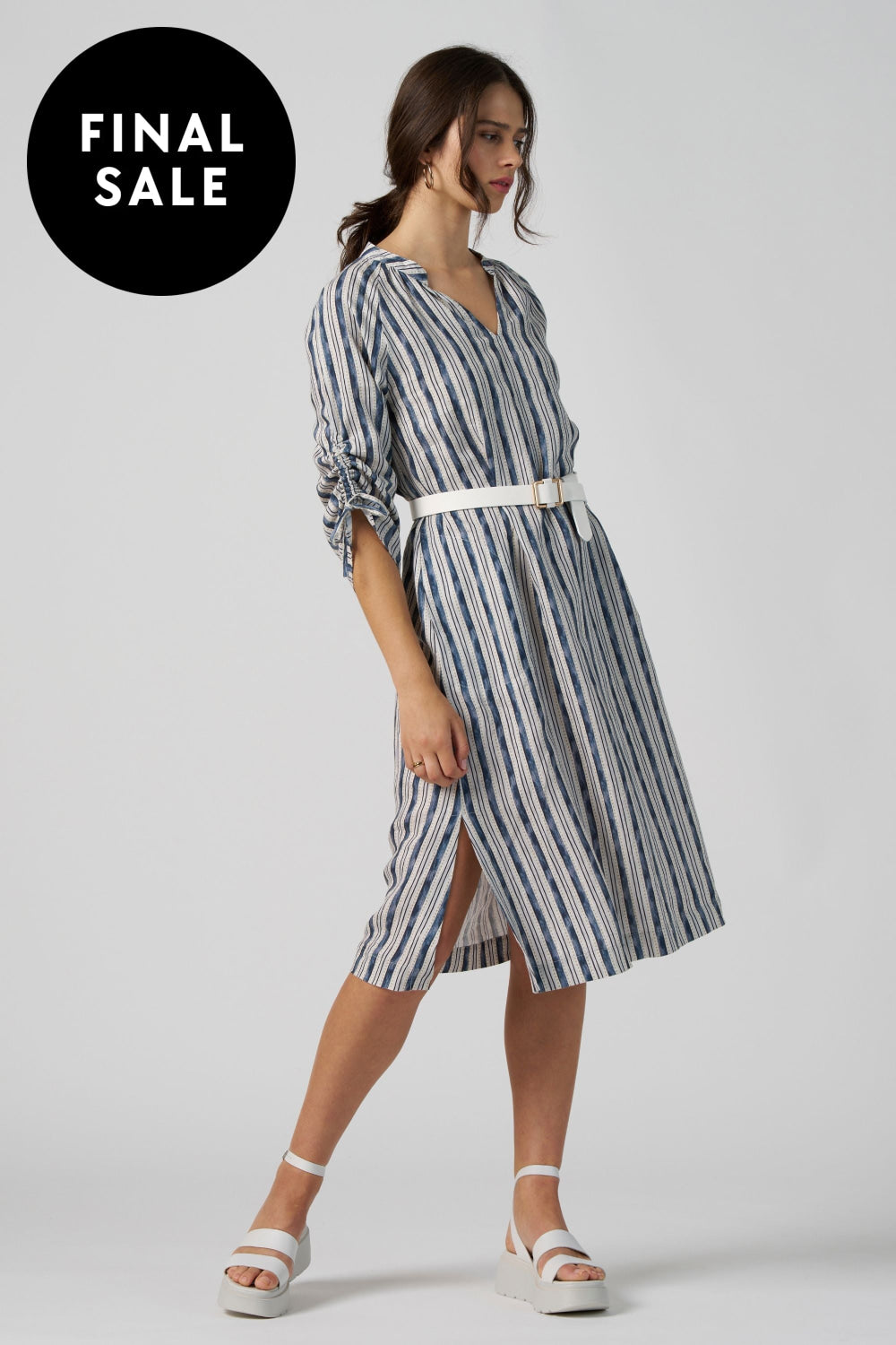 This A-line midi dress embodies sophistication with its graceful V-neckline and adaptable 3/4 sleeves that can be ruched and tied for a refined look. Featuring discreet stitched side pockets and elegant side splits, it offers both practicality and luxury to elevate your wardrobe.