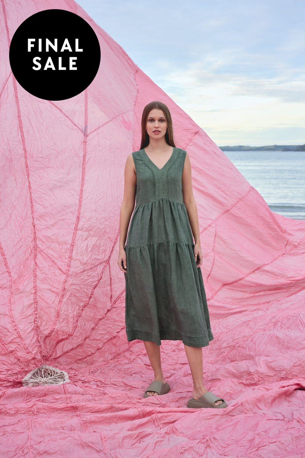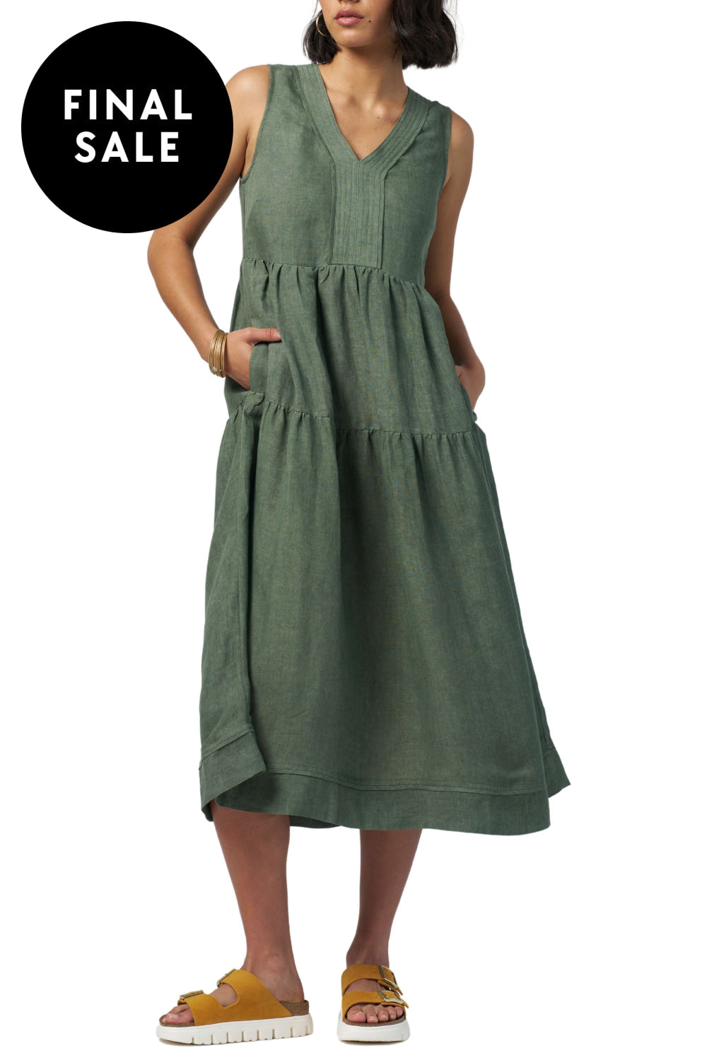 Sleeveless dress with a V-neckline and side pockets. Featuring top stitching detail around neckline, placket, and self binding at hemline seam.