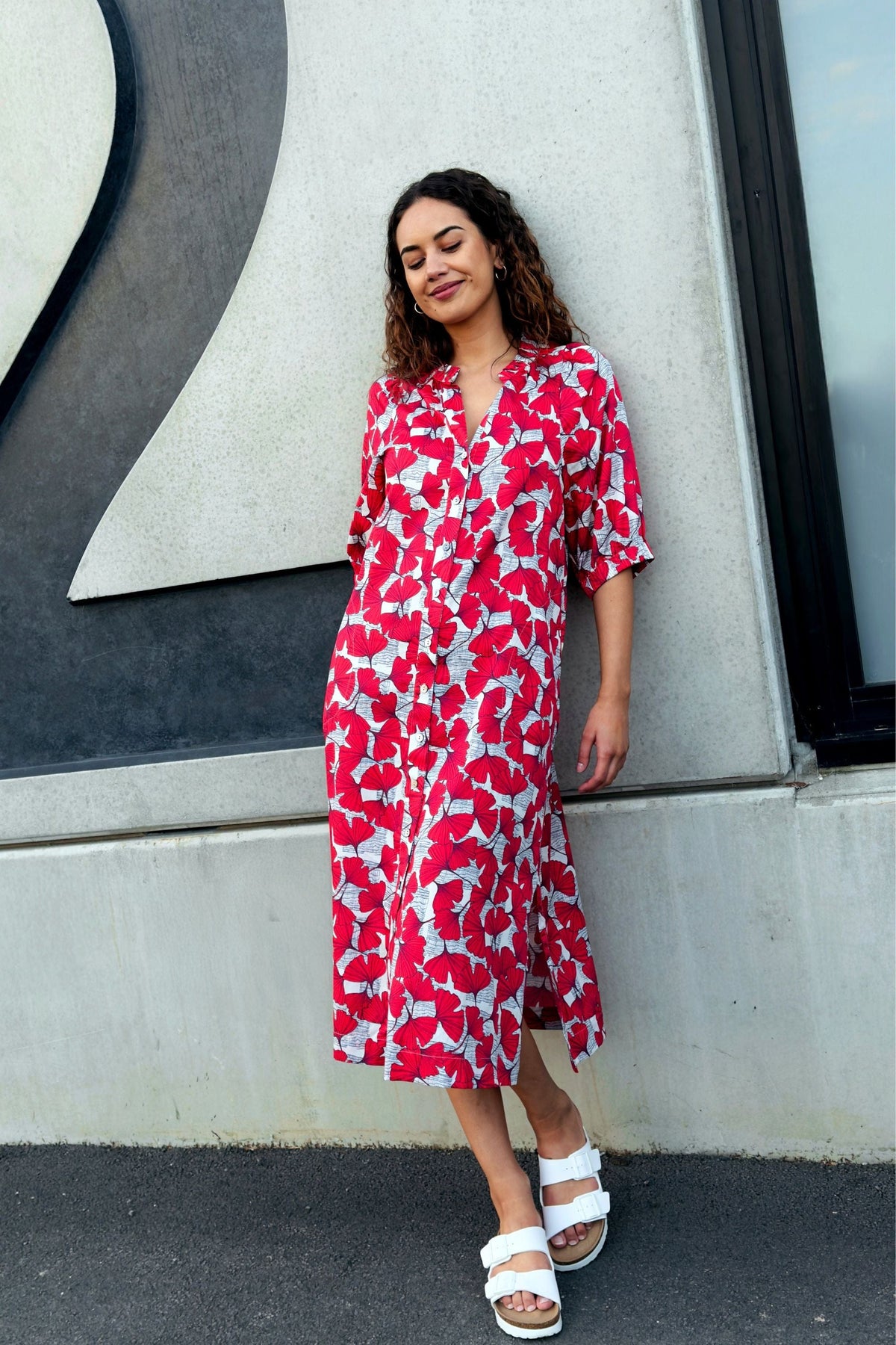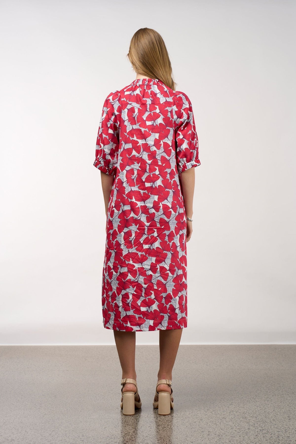 • A printed, button-through dress, with a soft gathered neck band.