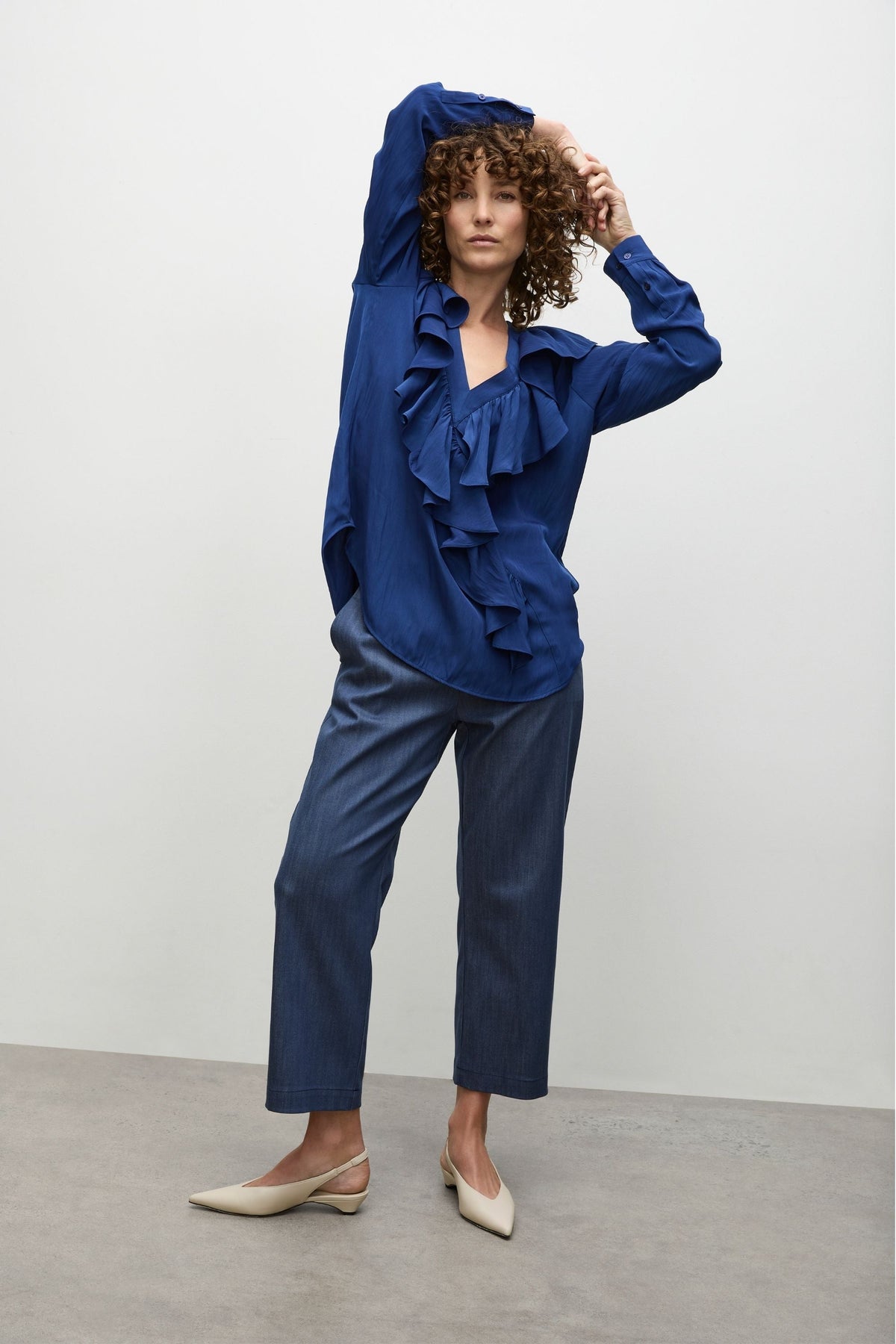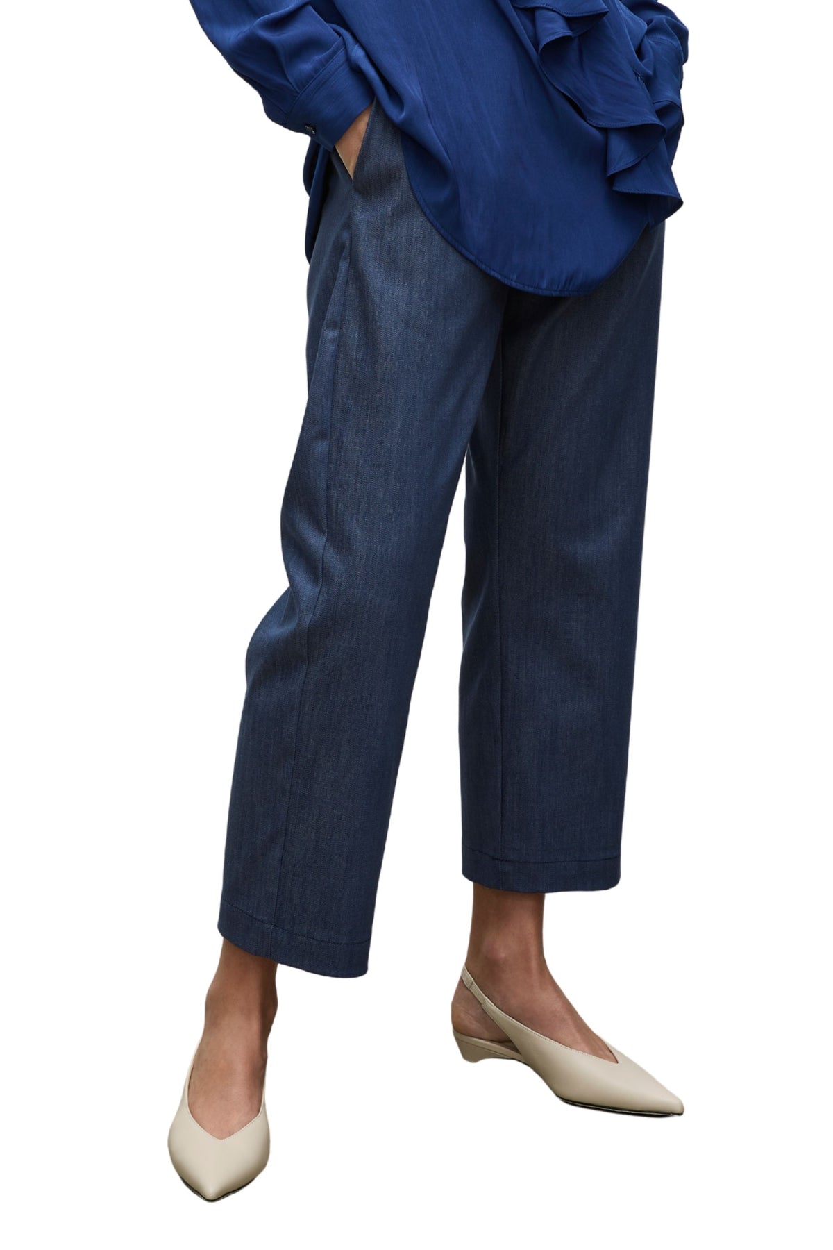 Discover Mela Purdie's Soft Stretch Denim fabric, characterised by its super 4-way Stretch & Memory. The Tapered Flat Pant is a fitted silhouette with purposeful comfort.