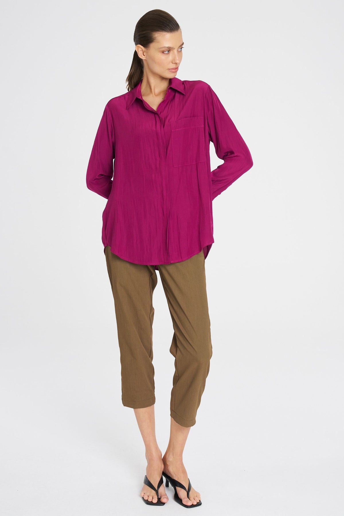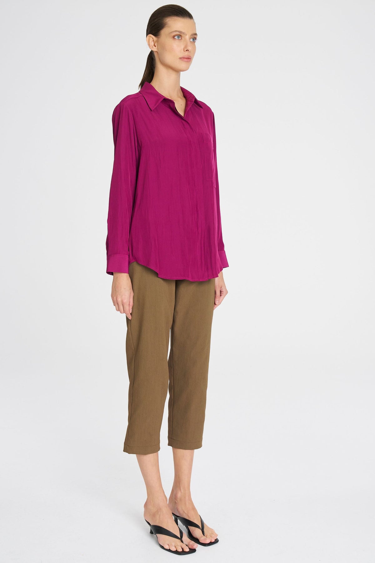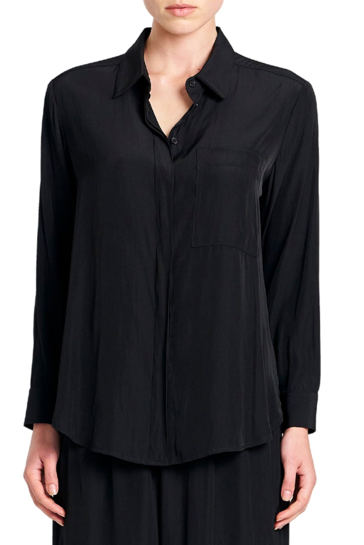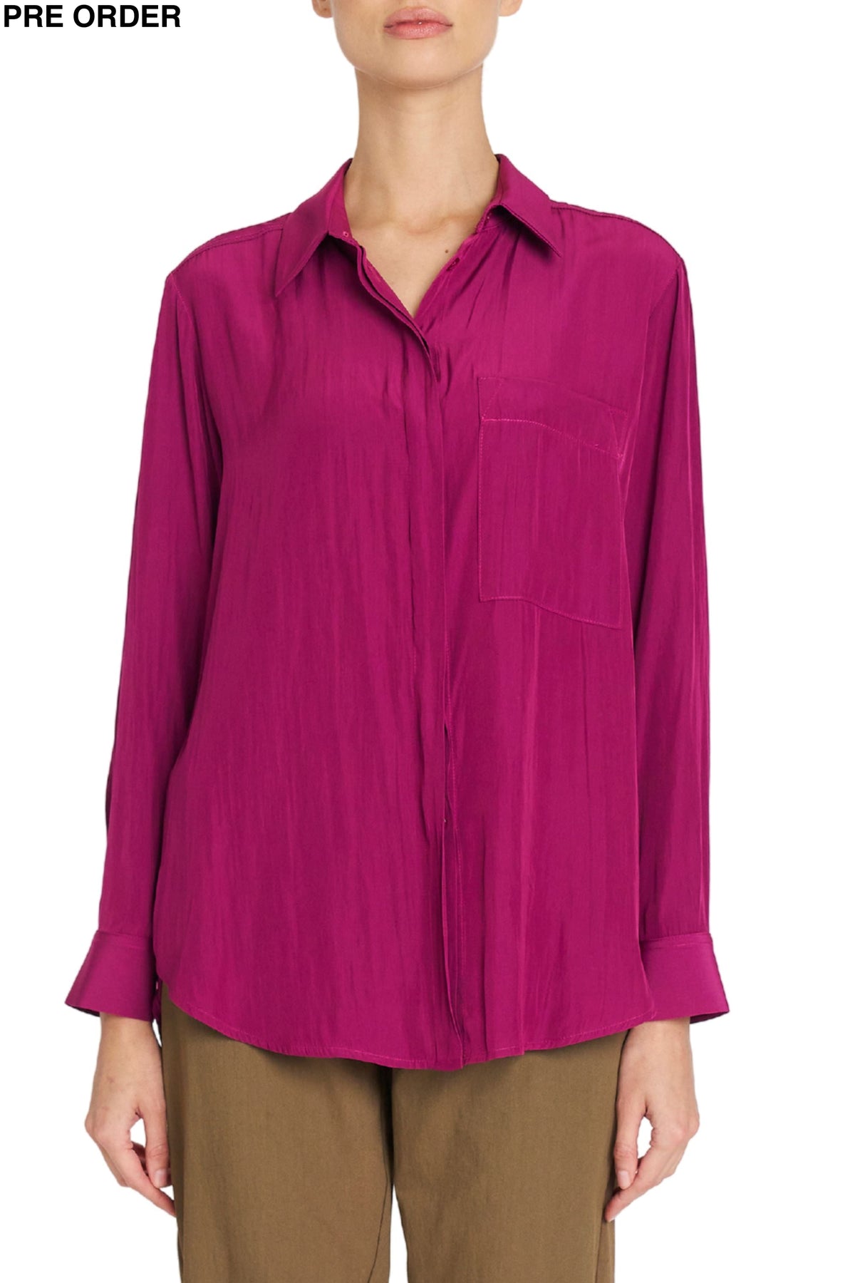 Made from Mela Purdie's exclusive Mache fabrication, the Single Pocket Shirt is based on the shape of the much loved Soft Pocket Shirt. Cut for a slightly loose fit that is comfortable and figure-flattering, this style features a single soft patch pocket, shirt collar, concealed button placket, and full-length sleeves. Wear tucked in with a skirt, or loose over slim pants.