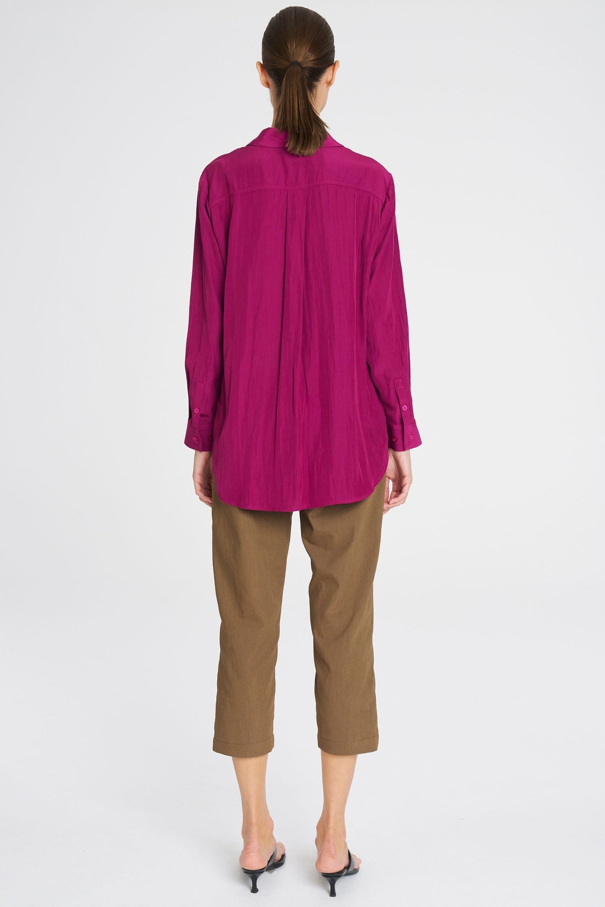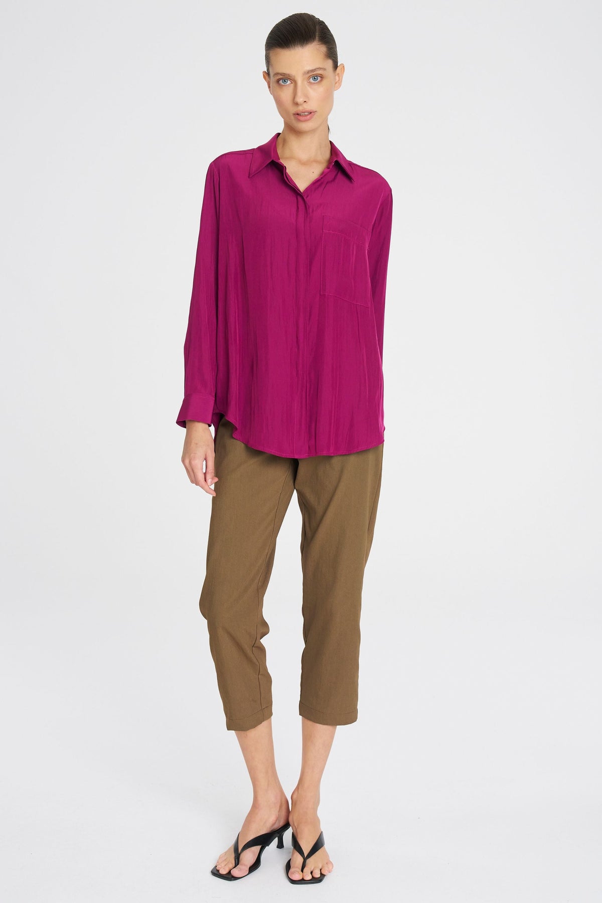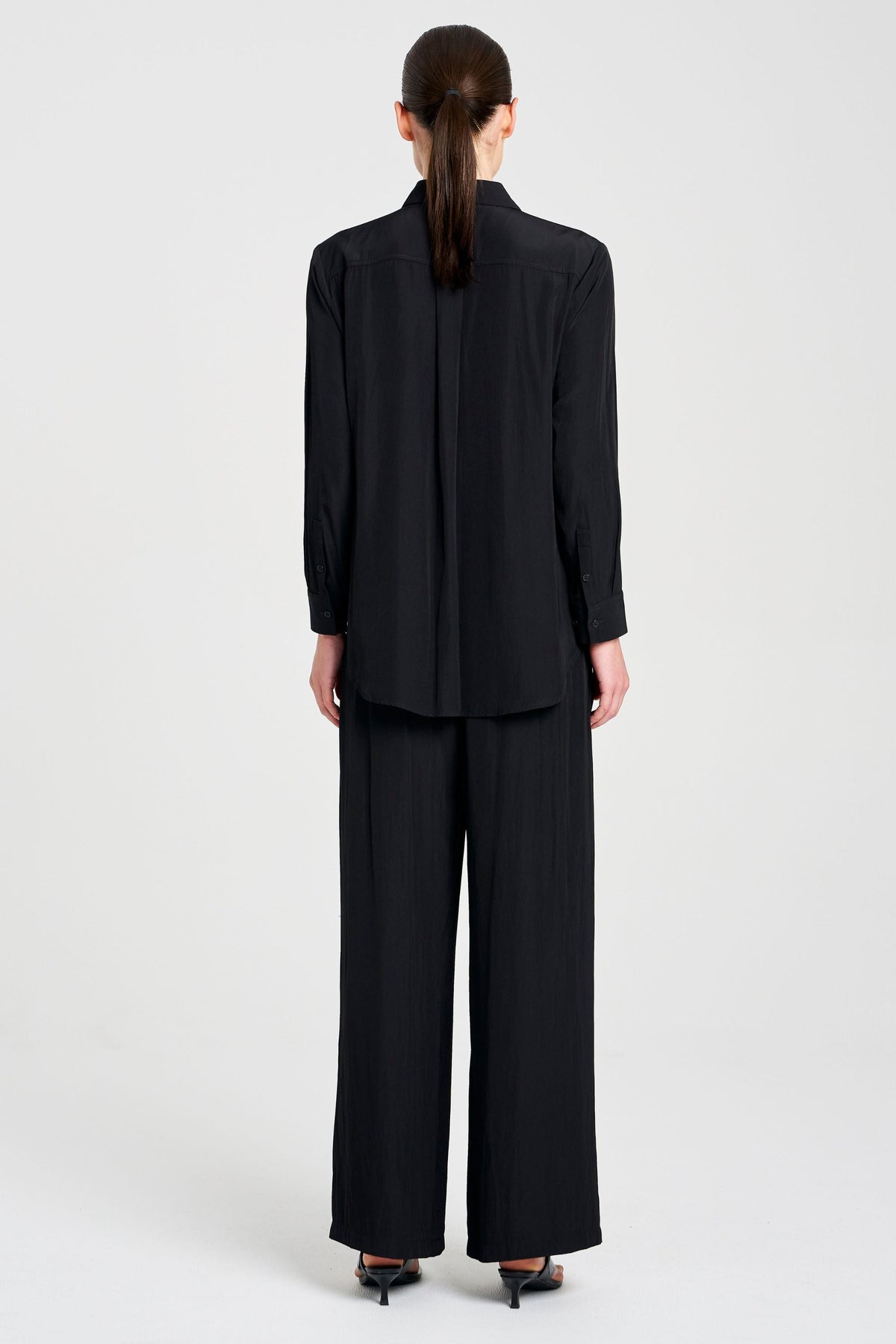 Made from Mela Purdie's exclusive Mache fabrication, the Single Pocket Shirt is based on the shape of the much loved Soft Pocket Shirt. Cut for a slightly loose fit that is comfortable and figure-flattering, this style features a single soft patch pocket, shirt collar, concealed button placket, and full-length sleeves. Wear tucked in with a skirt, or loose over slim pants.