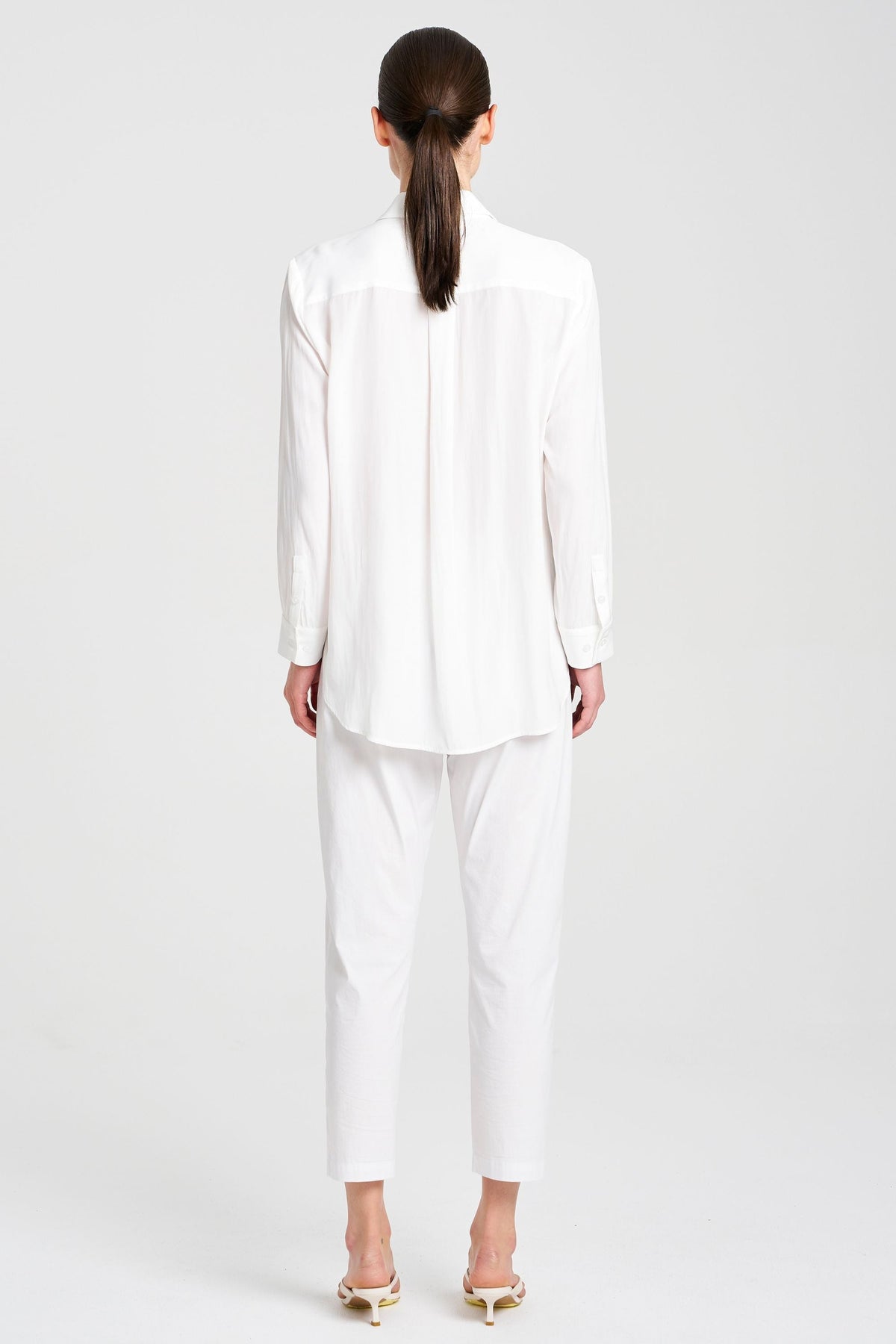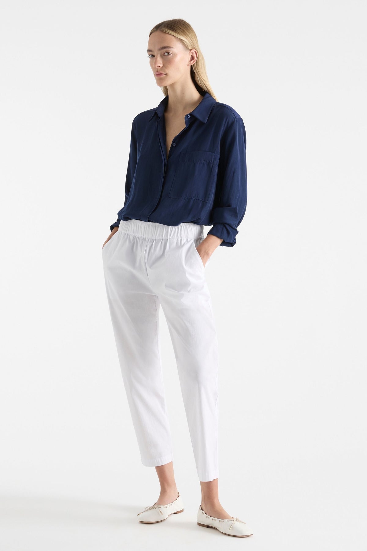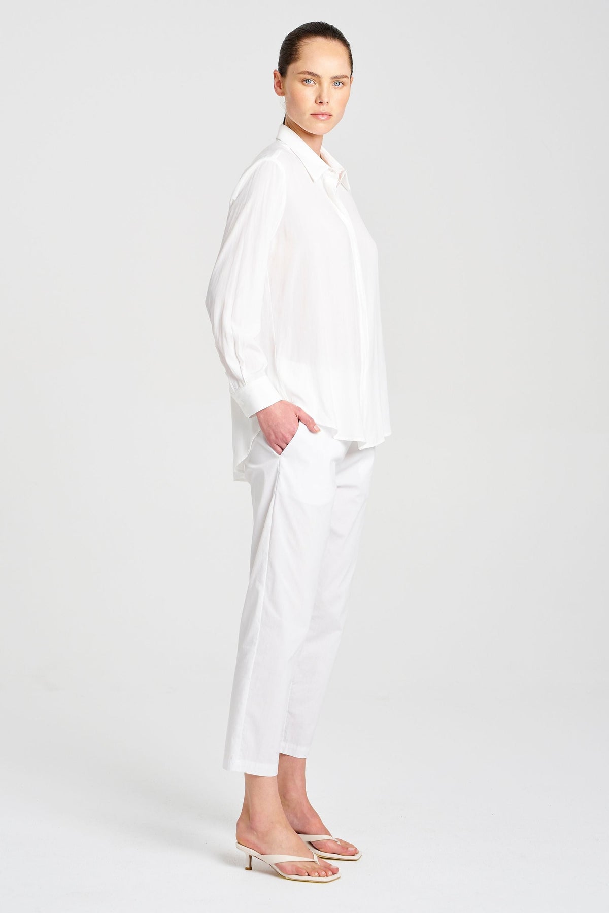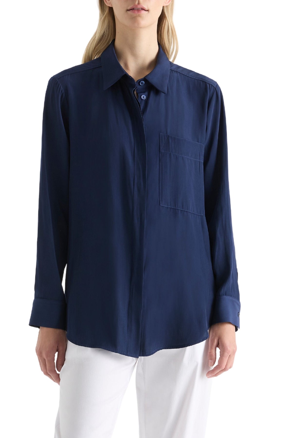 Made from Mela Purdie's exclusive Mache fabrication, the Single Pocket Shirt is based on the shape of the much loved Soft Pocket Shirt. Cut for a slightly loose fit that is comfortable and figure-flattering, this style features a single soft patch pocket, shirt collar, concealed button placket, and full-length sleeves. Wear tucked in with a skirt, or loose over slim pants.