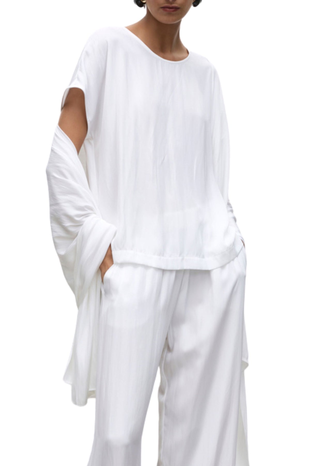 The Cap Shell from Mela Purdie features a cap sleeves, round neckline and a relaxed shape silhouette. Crafted from 100% technical polyester, Mache offers a full bodied, high fashion look that combines style and comfort in a user-friendly fabrication, that is machine washable and ideal for travel.