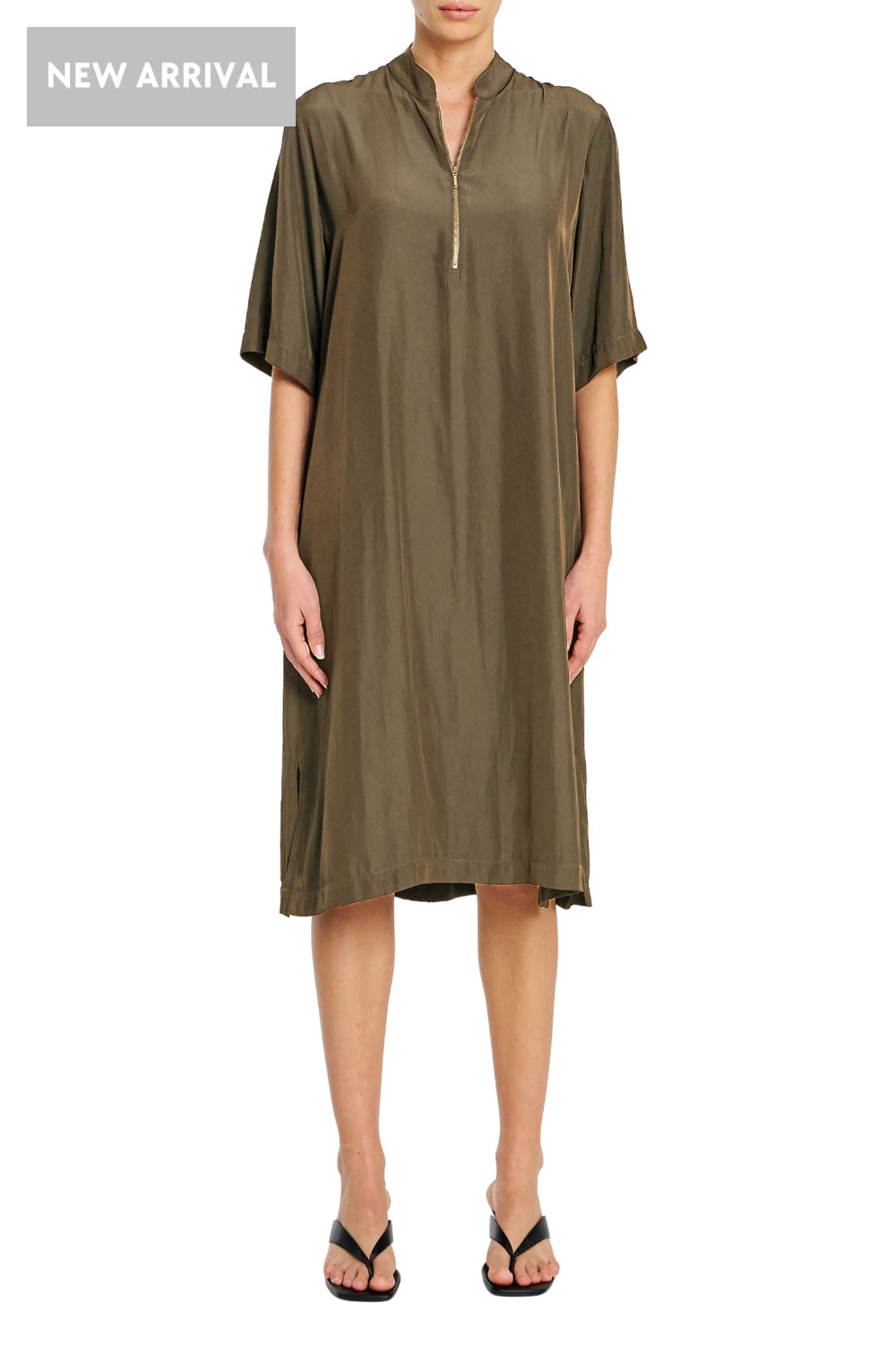 Crafted from Mela Purdie's Mache, featuring a relaxed fluidity & smooth lustre surface. The Zip Plaza Dress featuring a half front zip and crisp stand collar in a mid length this is an easy to wear staple for your capsule wardrobe.