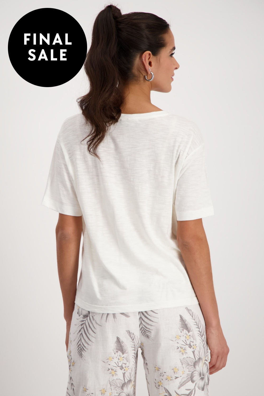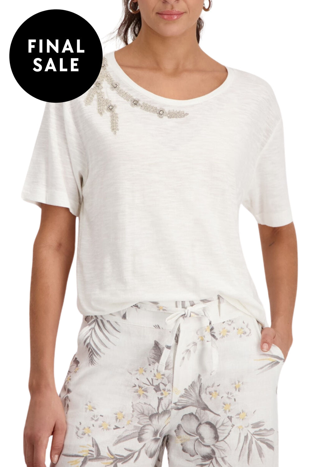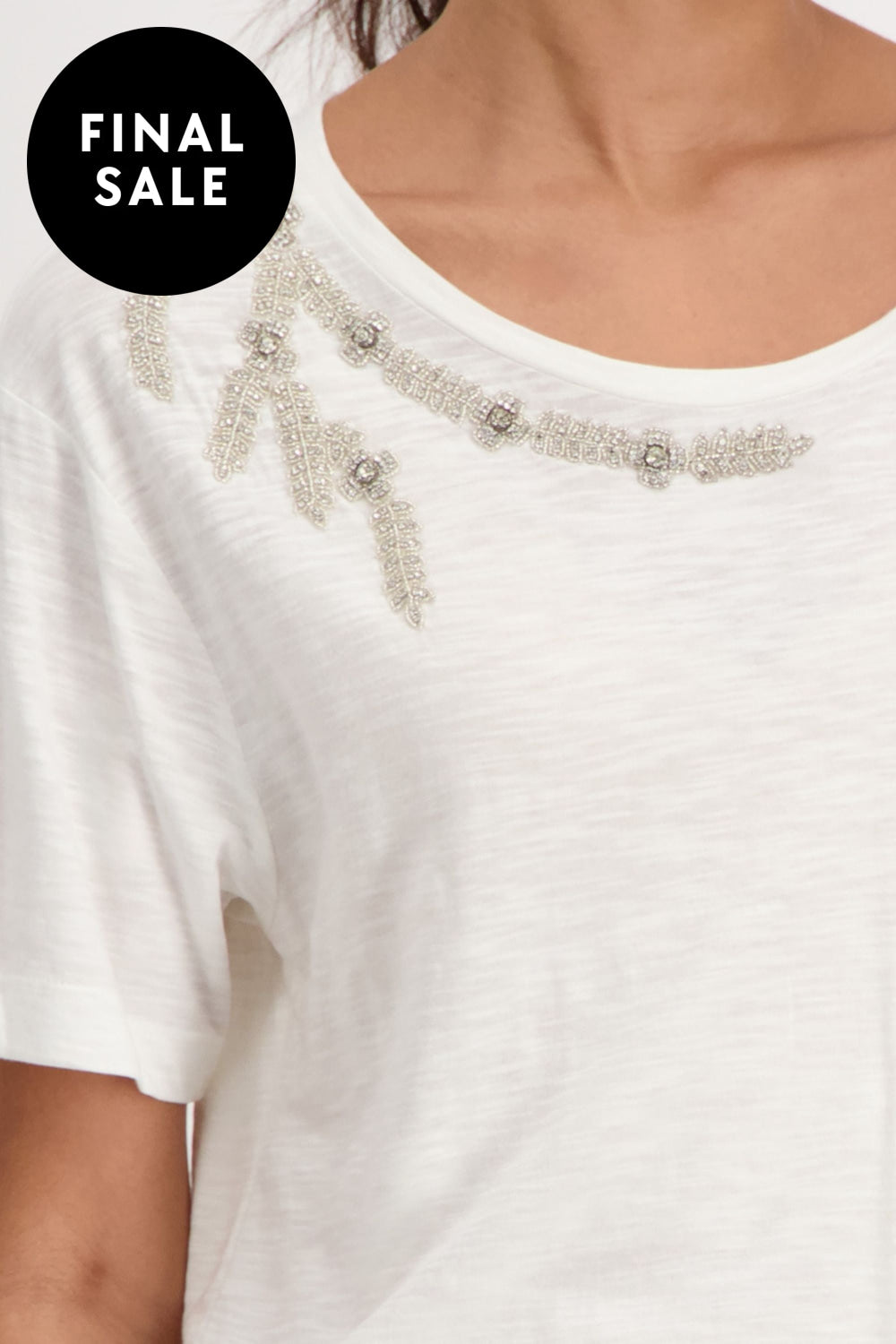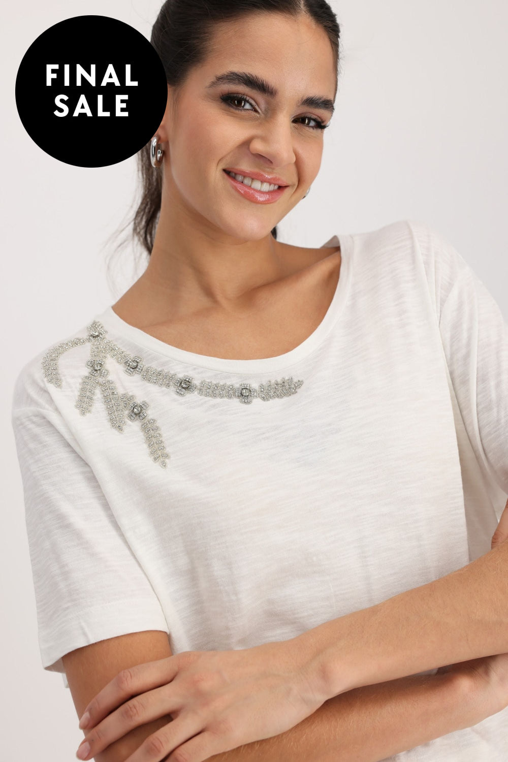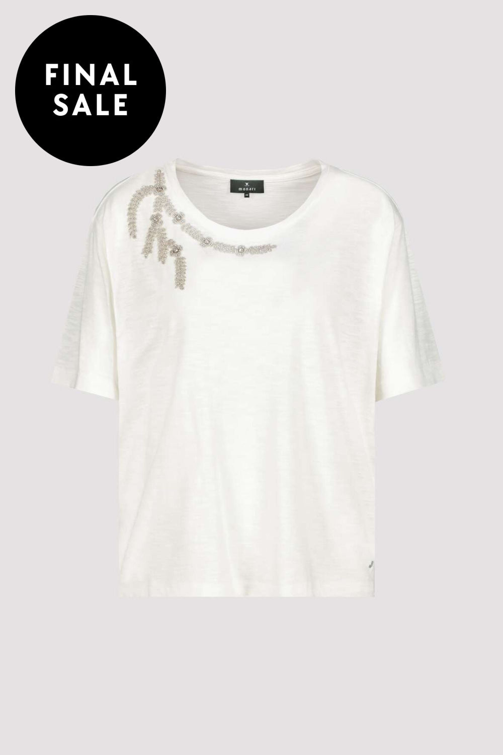 The T-shirt made of cotton and viscose impresses with its application of sparkling gemstones. A perfect party look!