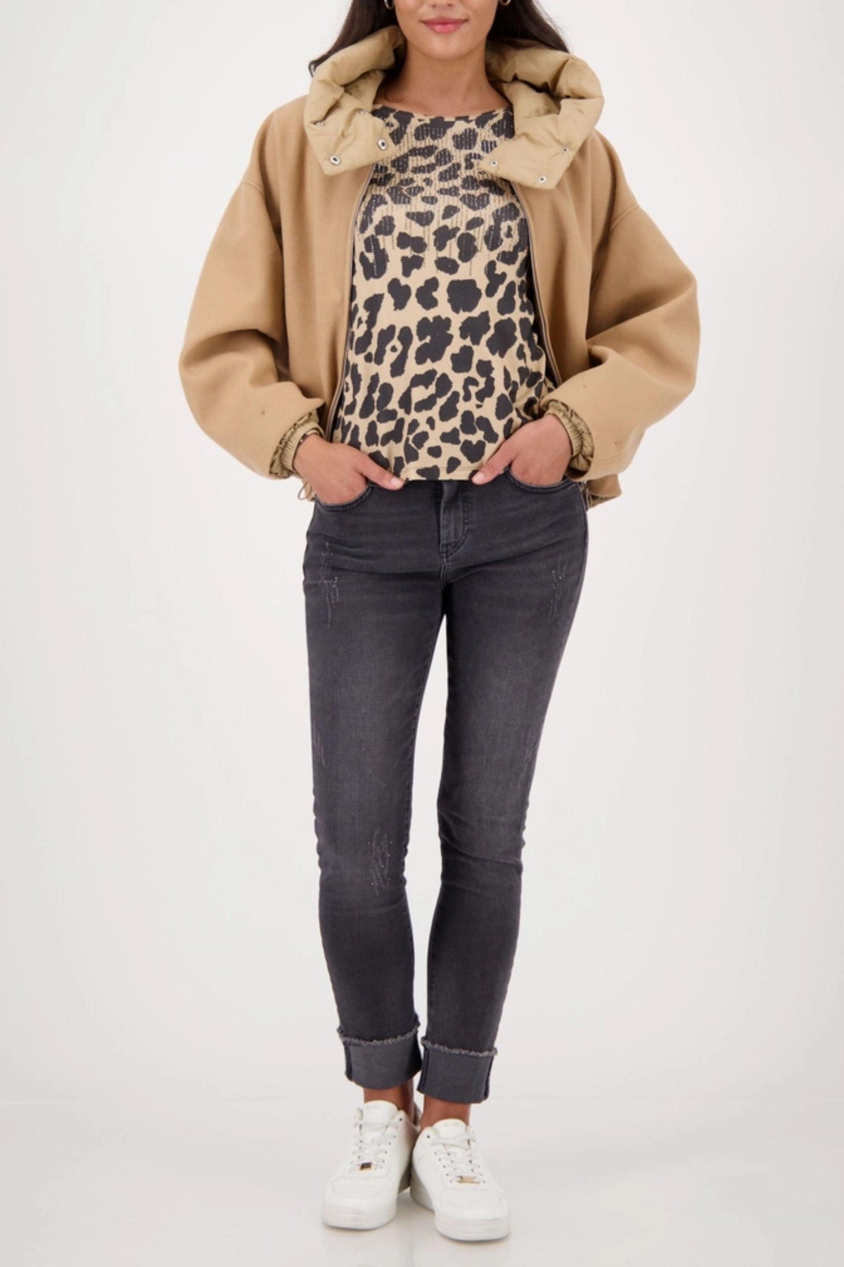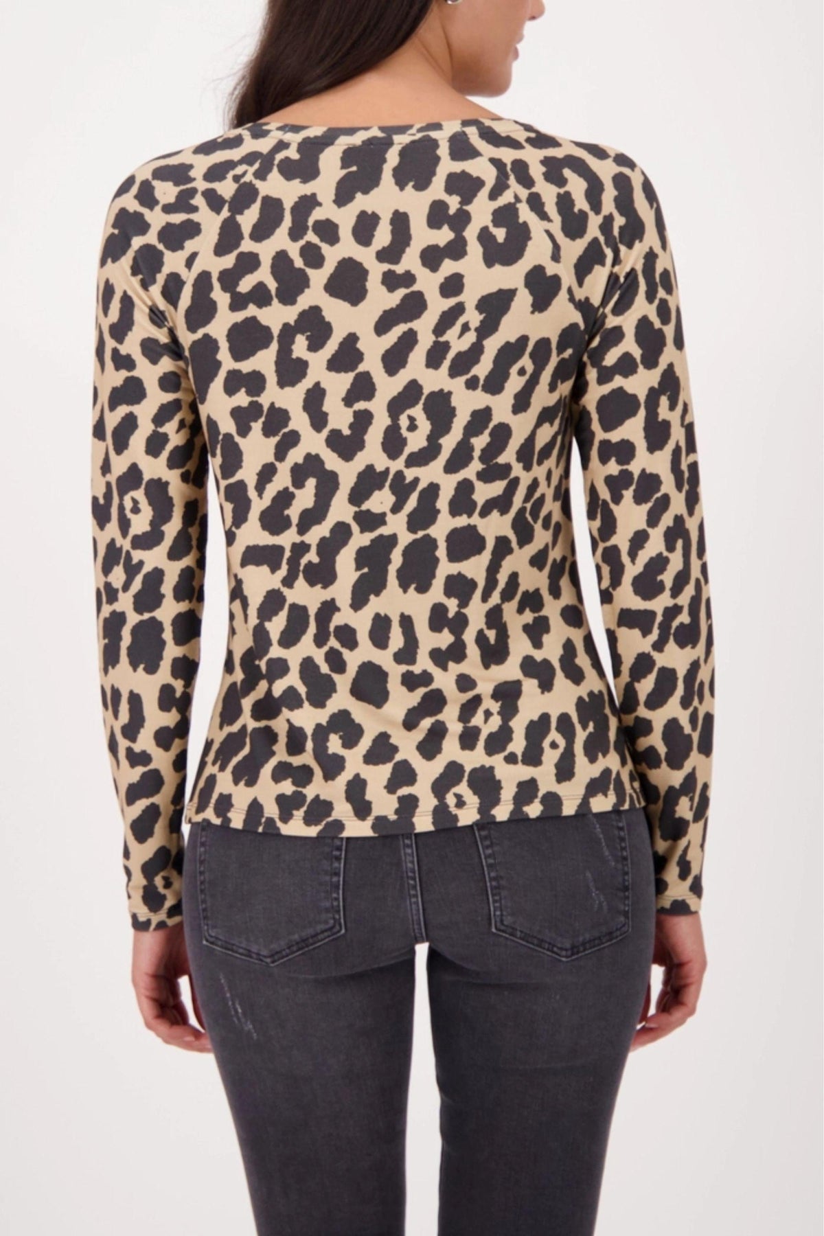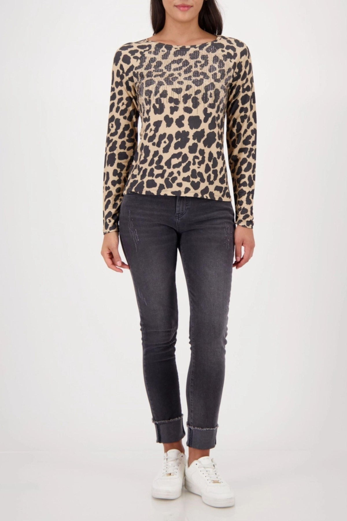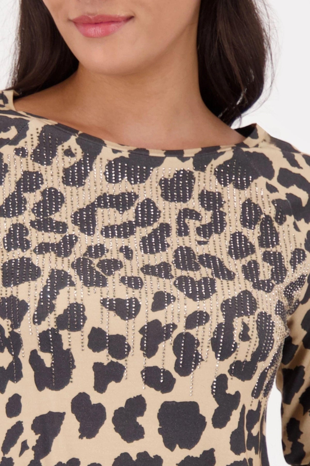 Experience stylish elegance with our long-sleeved leopard print shirt made of flowing viscose adorned with sparkling rhinestones.