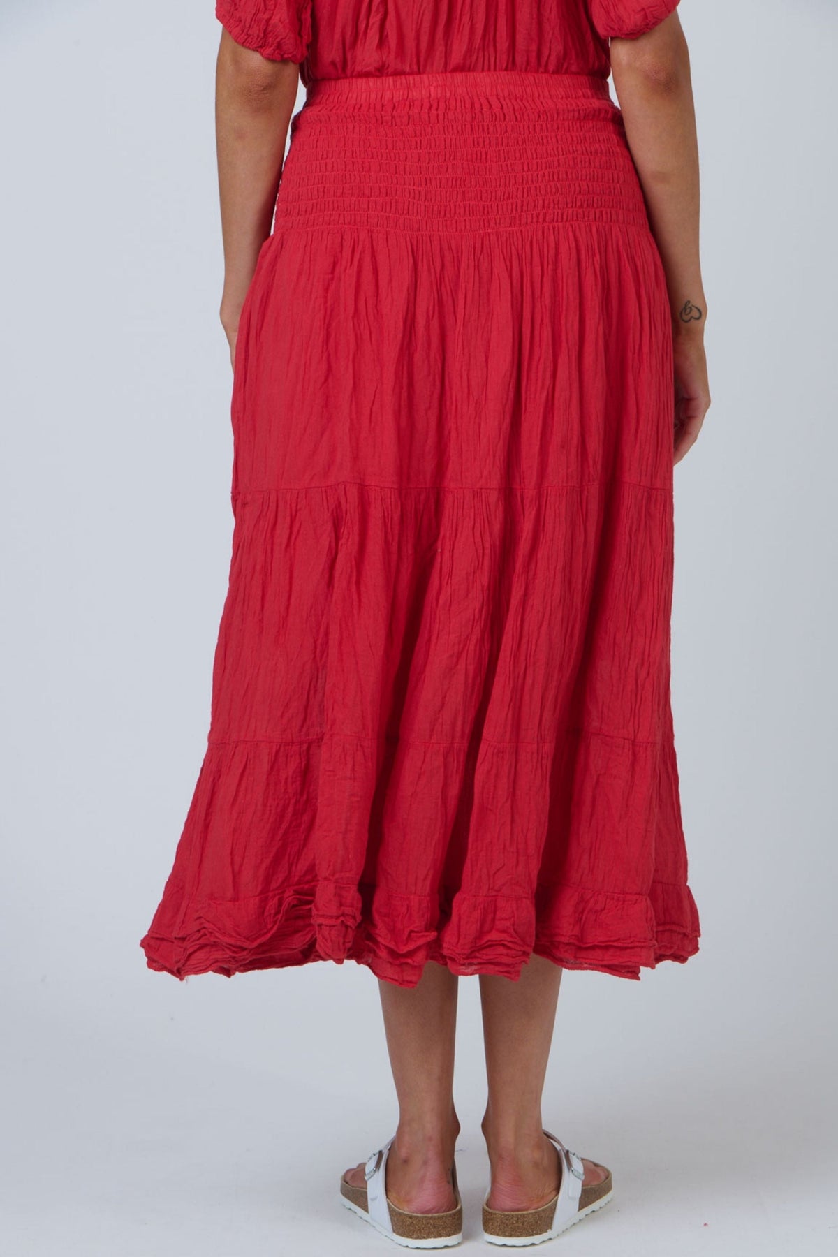 Indulge in the luxury of the Cotton Skirt from Namastai. Made from premium, crinkle cotton, this fun summer skirt is designed with tiered layers for a sophisticated touch. Experience the cool and breezy comfort while staying stylish this season.