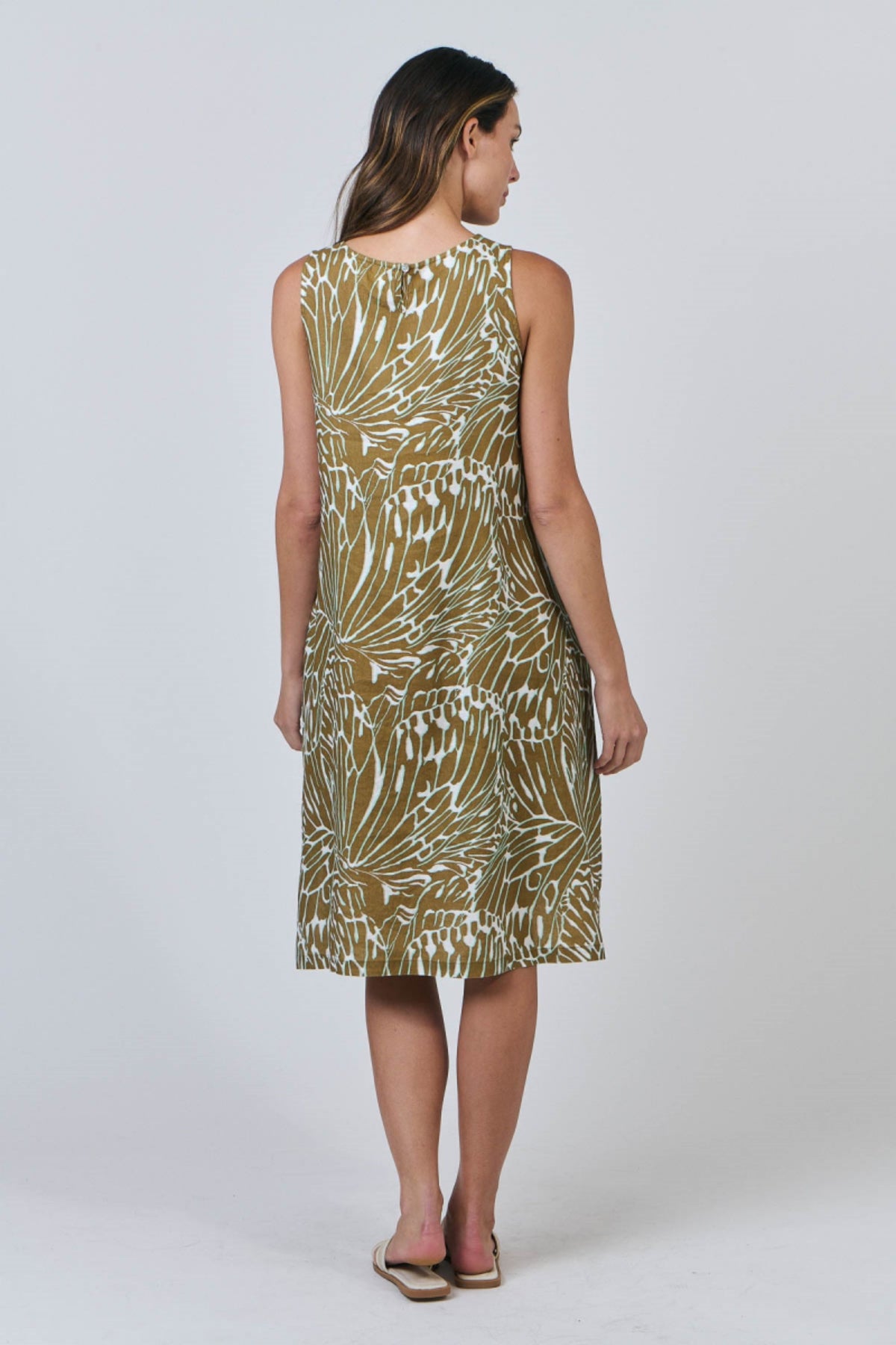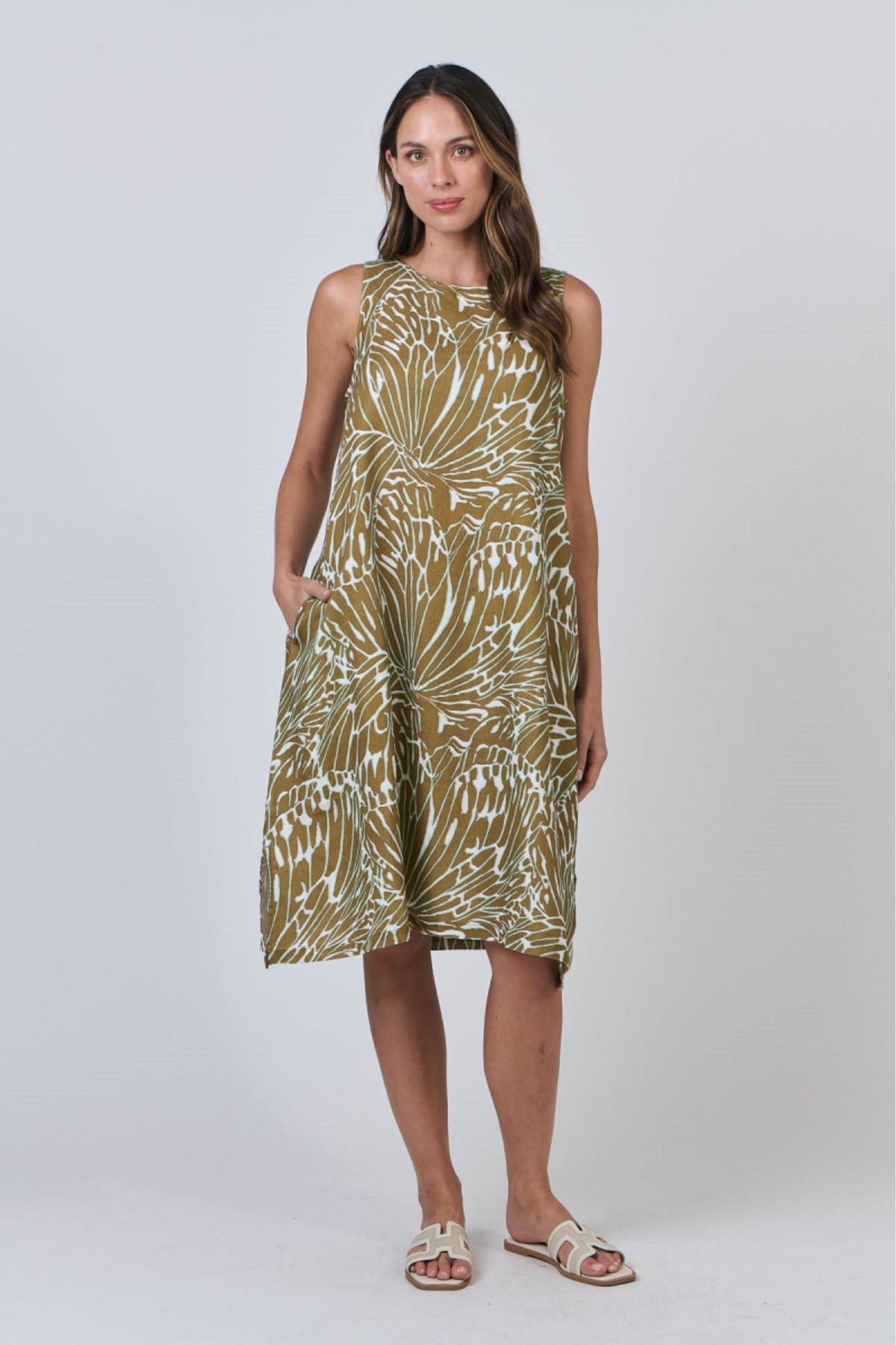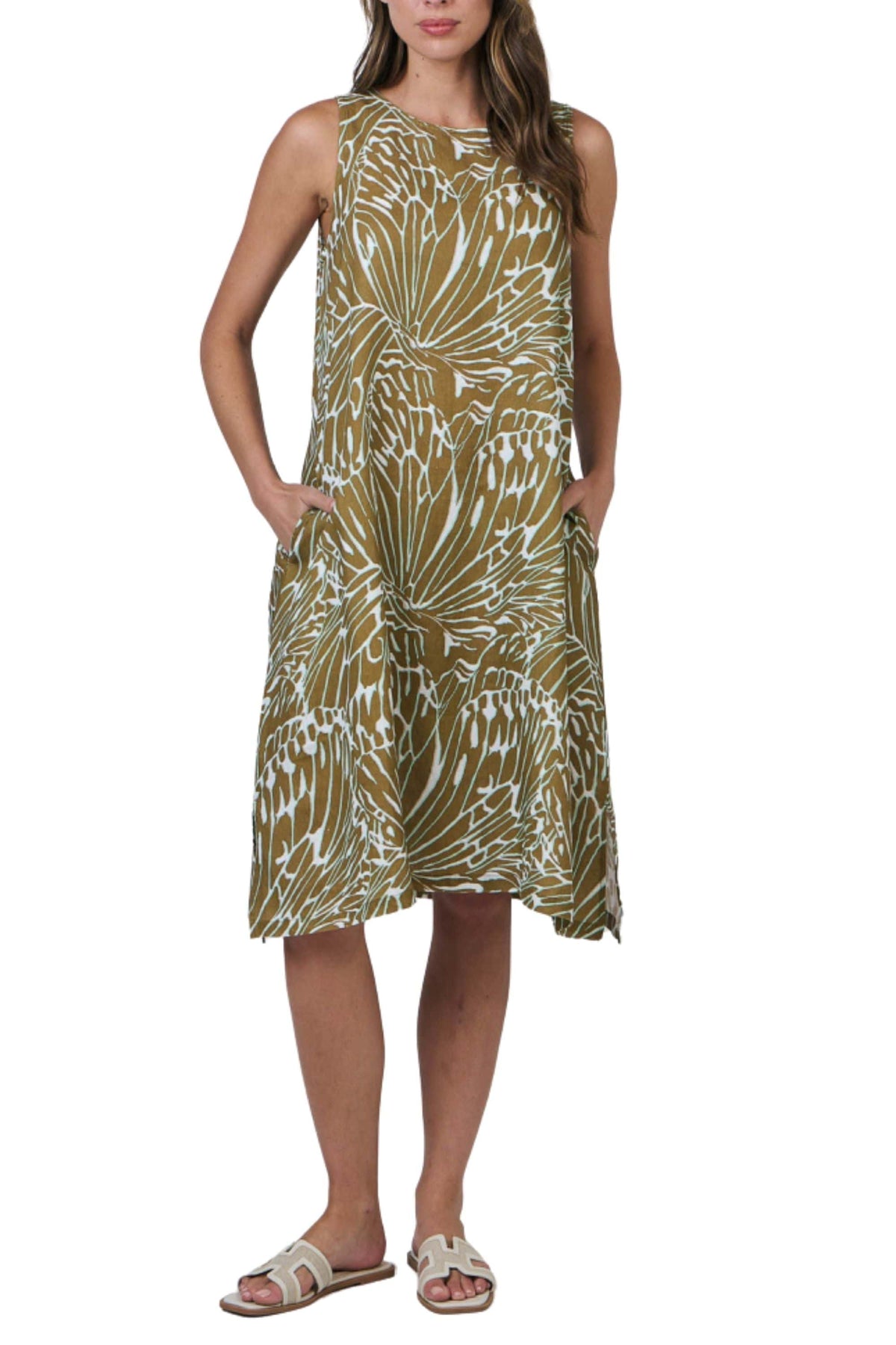 features a relaxed A line silhouette with a round neckline and sleeveless design, perfect for effortless elegance on warmer days. The practical side pockets add functionality to this sophisticated piece, which transitions seamlessly from day to evening with its knee length hemline and subtle side slits.