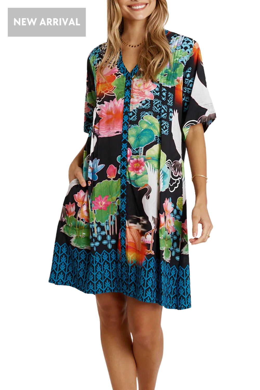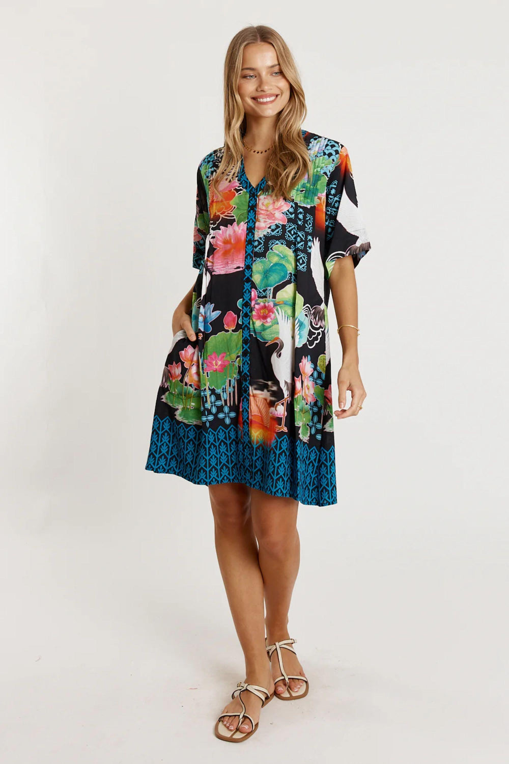 Flowing with effortless charm, the Lula Life Akiko Button Dress is an easy go-to for colourful, everyday style. Made from 100% viscose, it feels soft, cool, and lightweight—perfect for warm days. The Nauru collar with a V-neck, front tab button-through design, and vertical tucks on the front and back bodice create a relaxed yet polished look. With elbow-length sleeves, practical side pockets, and a soft curved hem, it’s finished in a striking Japanese-inspired digital print that adds a fresh, artistic touch. Proudly designed in Australia, it’s ideal for weekends, outings, or effortless daytime dressing.