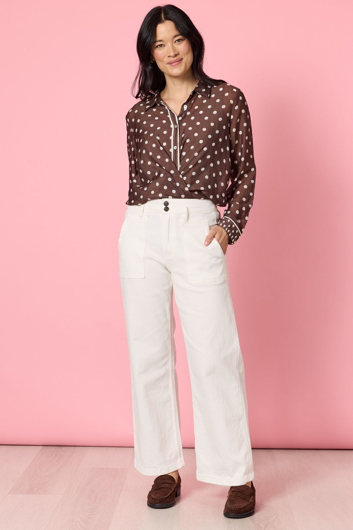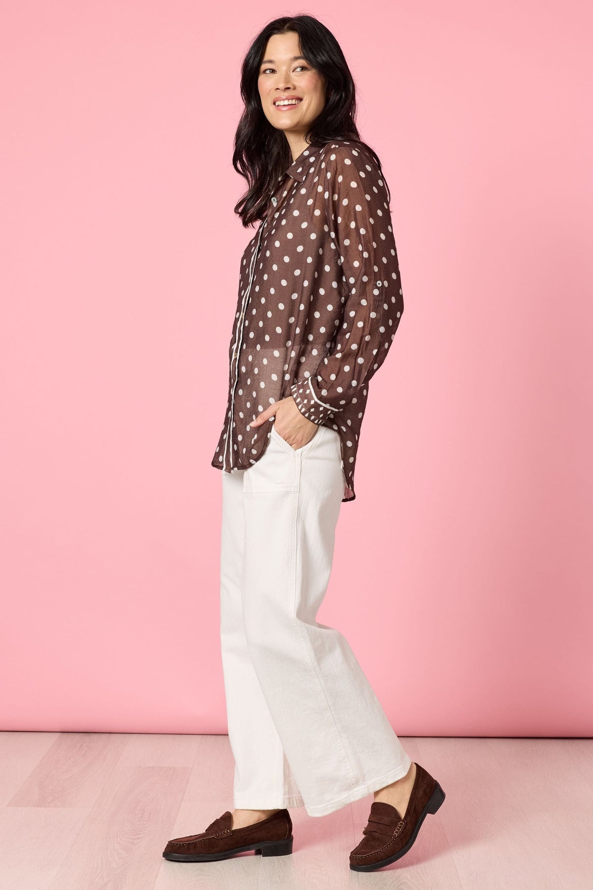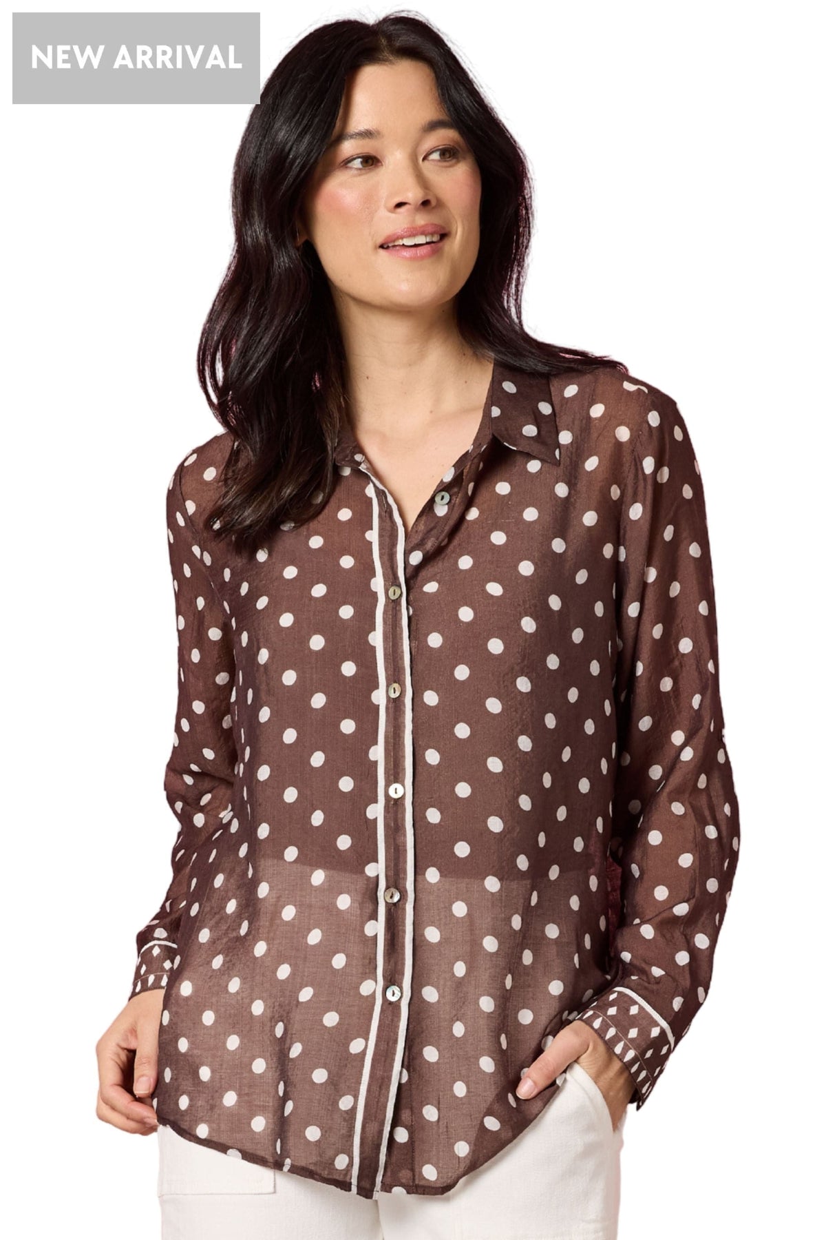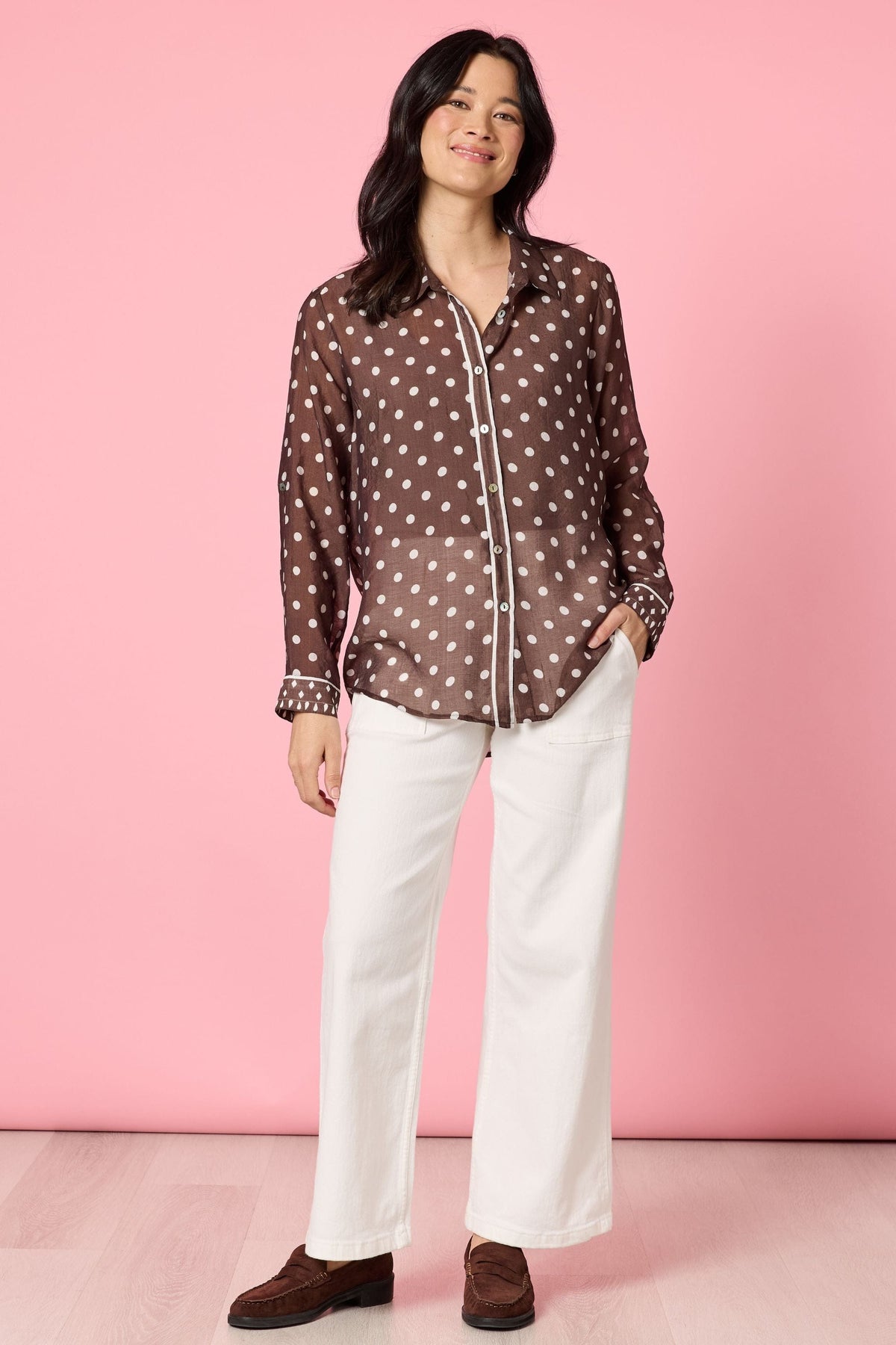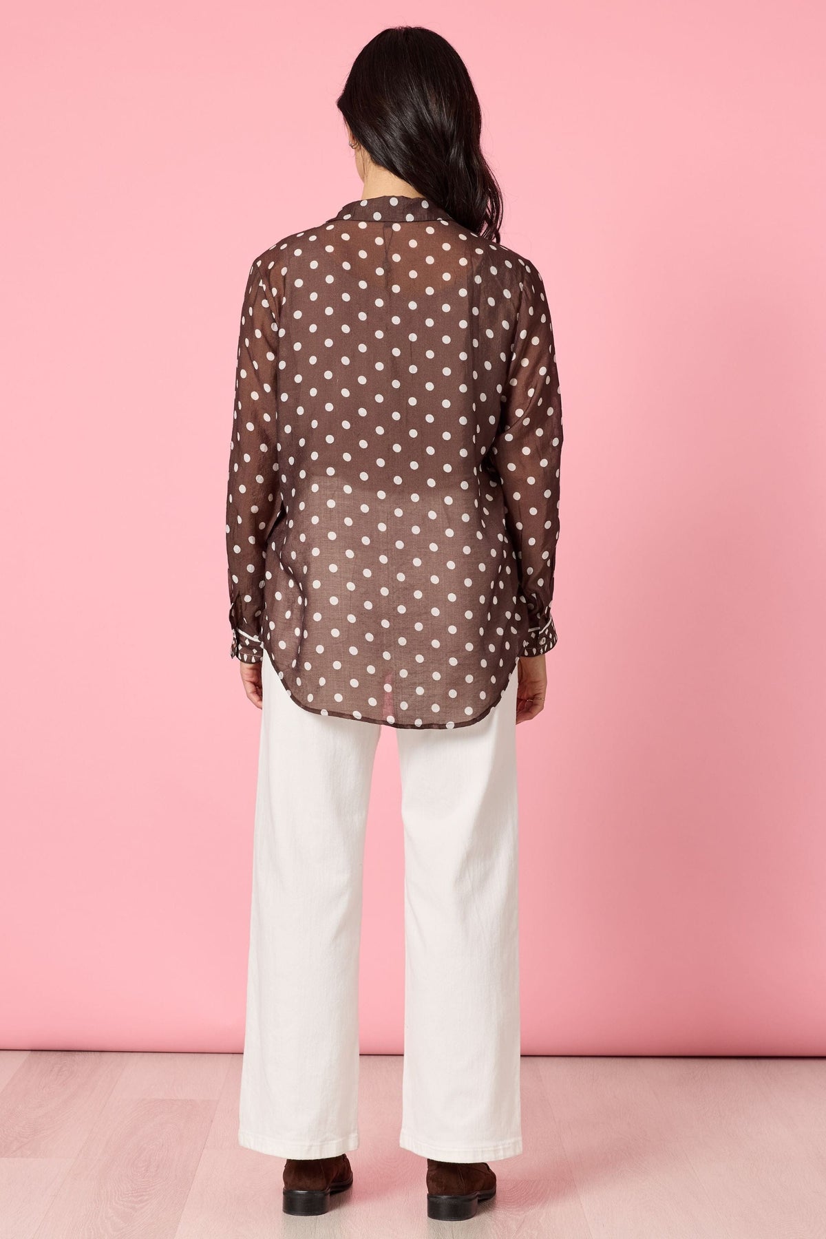 Classic pattern meets modern ease in the Spot Print Shirt, a lightweight, beautifully draped piece designed to elevate everyday dressing. Crafted from a soft, airy fabric, it offers effortless movement and a relaxed yet refined silhouette. Featuring a classic collared neckline, button-through front, and gently rounded hem, this shirt balances easy wear with refined detailing. The playful spot print adds personality and charm, making it a versatile staple that pairs seamlessly with denim, tailored pants, or wide-leg styles for a polished, understated statement.