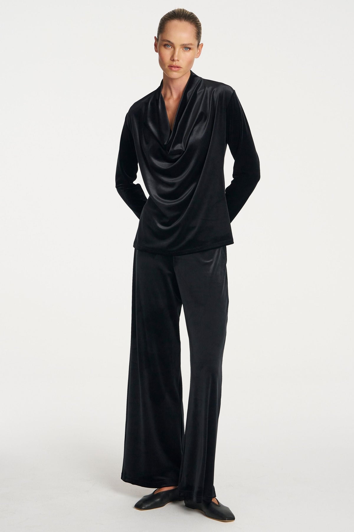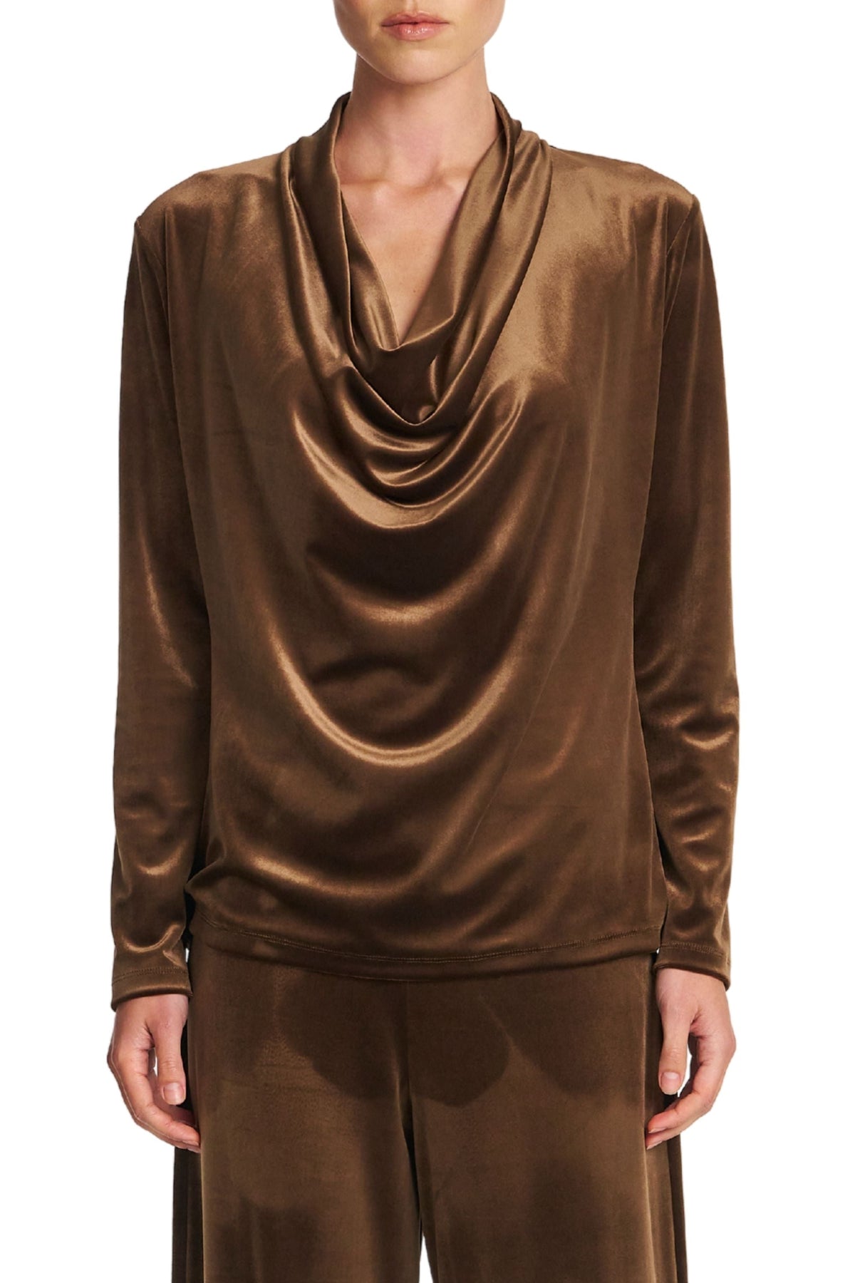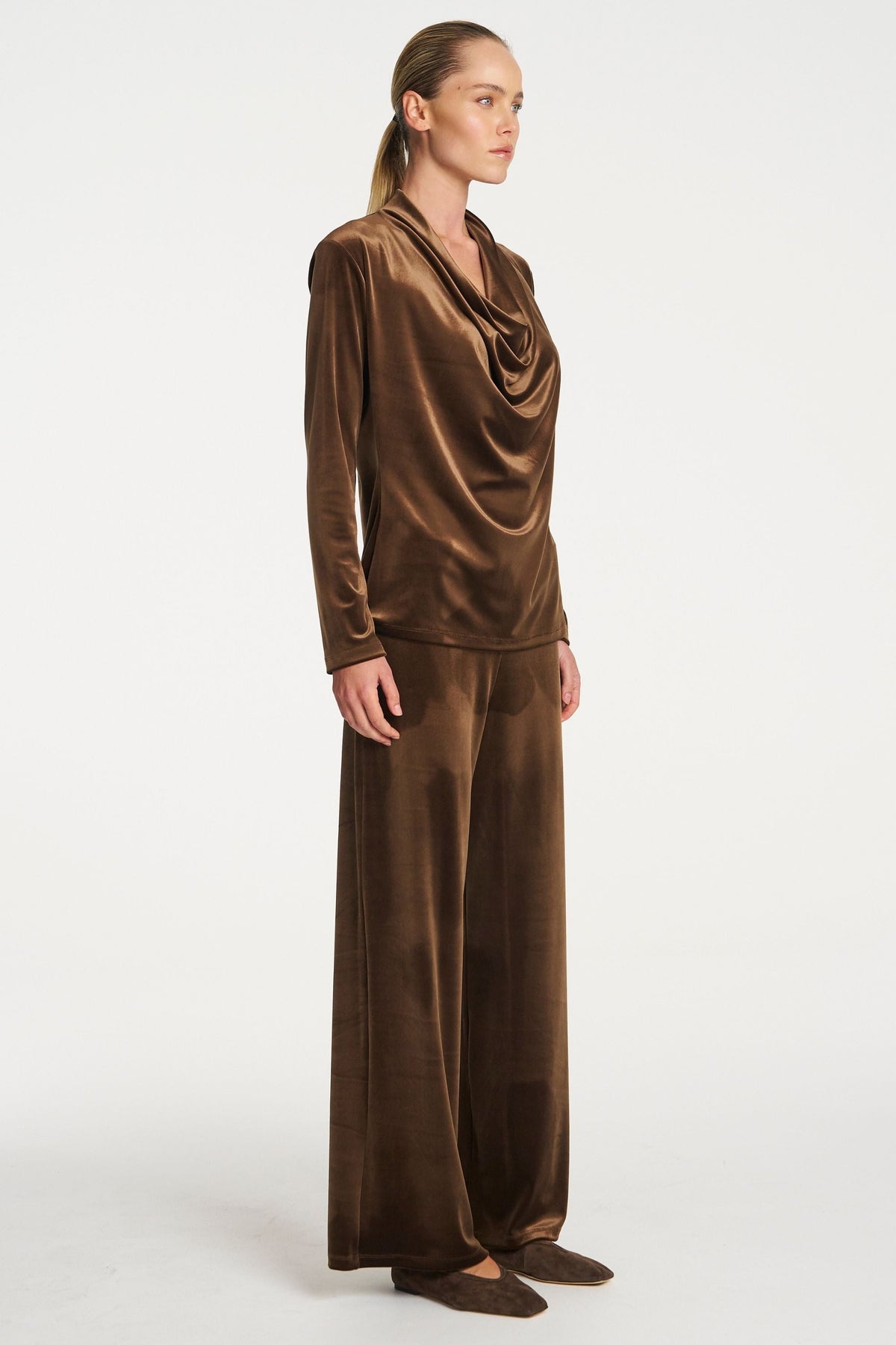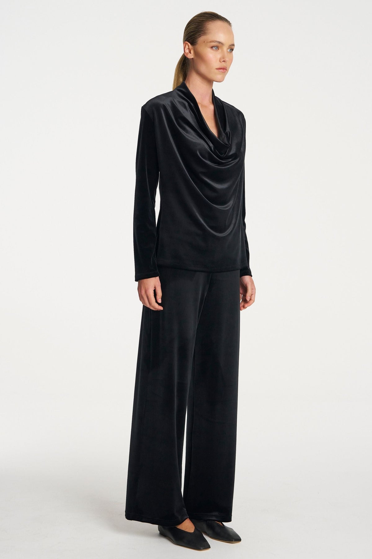 Crafted from Mela Purdie's Stretch Panne, a midweight velvet, featuring a subtle lustre finish. The Drape Top is a elevated piece featuring a draped cowl neckline and long sleeves.