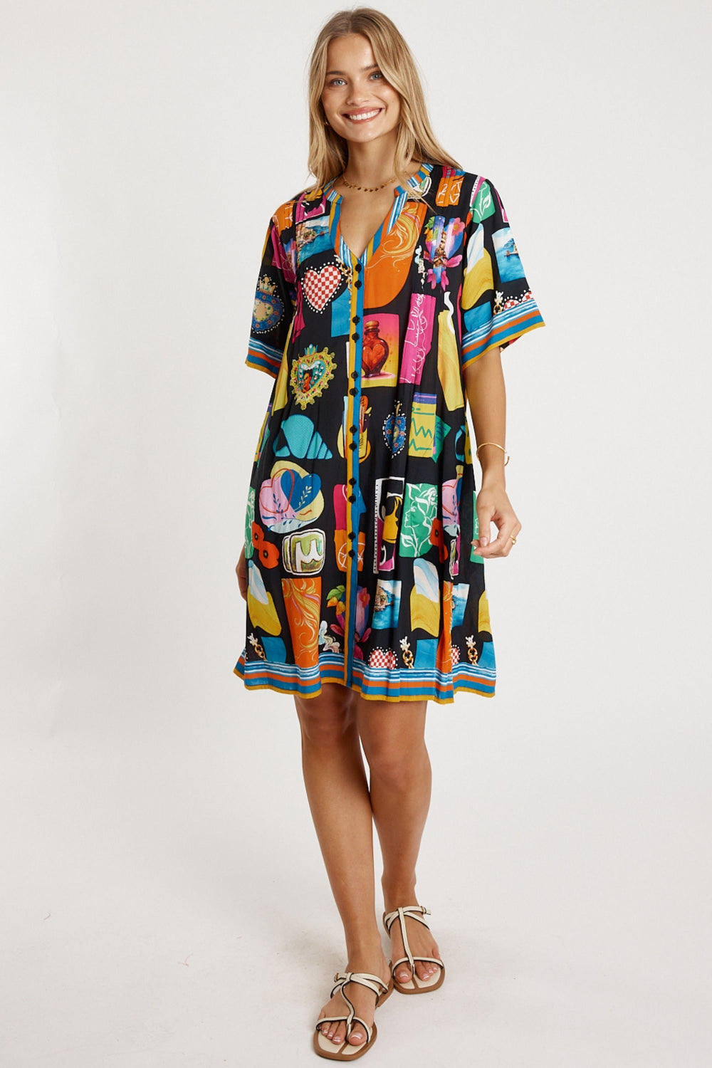 Fresh, flowy, and full of personality, the Lula Life Odette Tuck Dress is an easy everyday favourite with beautiful detail. Made from 100% viscose, it feels soft, lightweight, and perfect for warm days. The Nauru collar flowing into a V-neck and front tab button-through design give it a relaxed, polished look. Soft vertical tucks on the front and back bodice add gentle shaping, while the elbow-length sleeves, side pockets, and curved hem keep the fit effortless and comfortable. Finished in a striking Japanese-inspired digital print, this Australian-designed dress—made in India—offers vibrant, wearable style. Model is 5'8½” for reference.