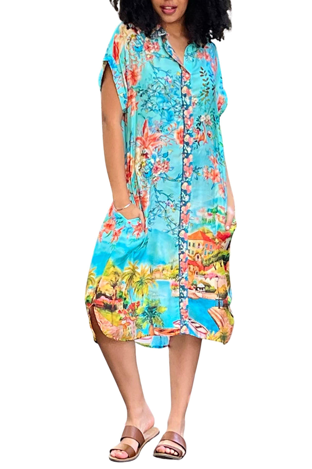 This elegant midi dress features a range of delicate prints crafted from a silk blend fabric, offering a light and breathable feel—ideal for stylish summer outings.