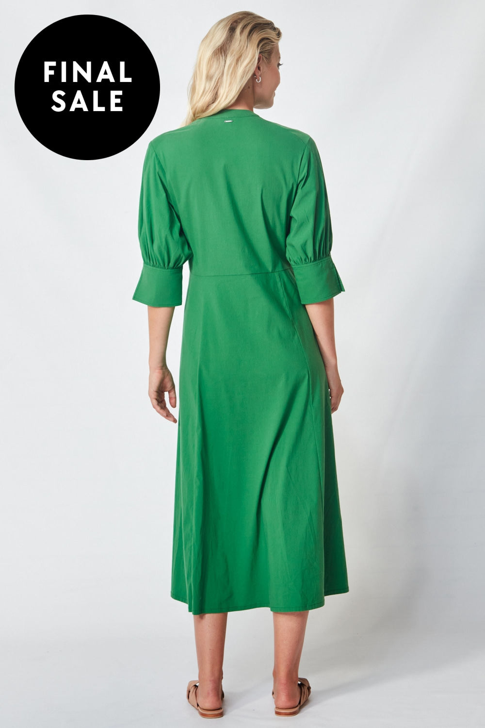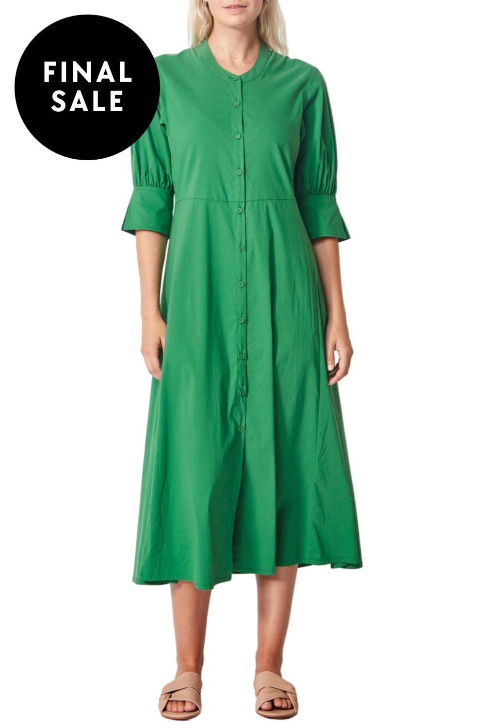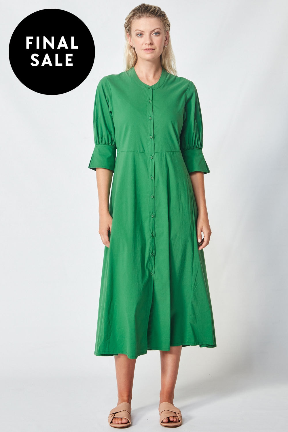 A button through shirt dress in Verge's exclusive European stretch, cotton Acrobat fabric. The Garcia dress has a flat Mandarin collar and buttons through the front with self fabric covered buttons. The Garcia dress is waisted with A line panelled skirt. Set in sleeve falls just below the elbow and is gathered into a turn back cuff. The Garcia dress falls to mid calf.