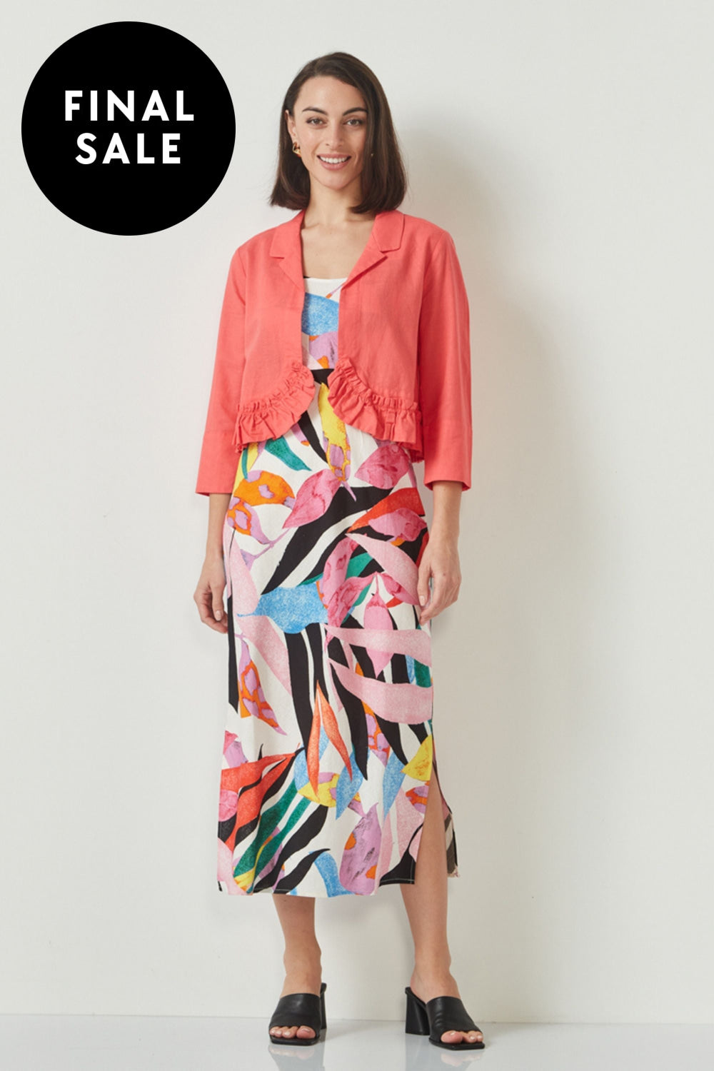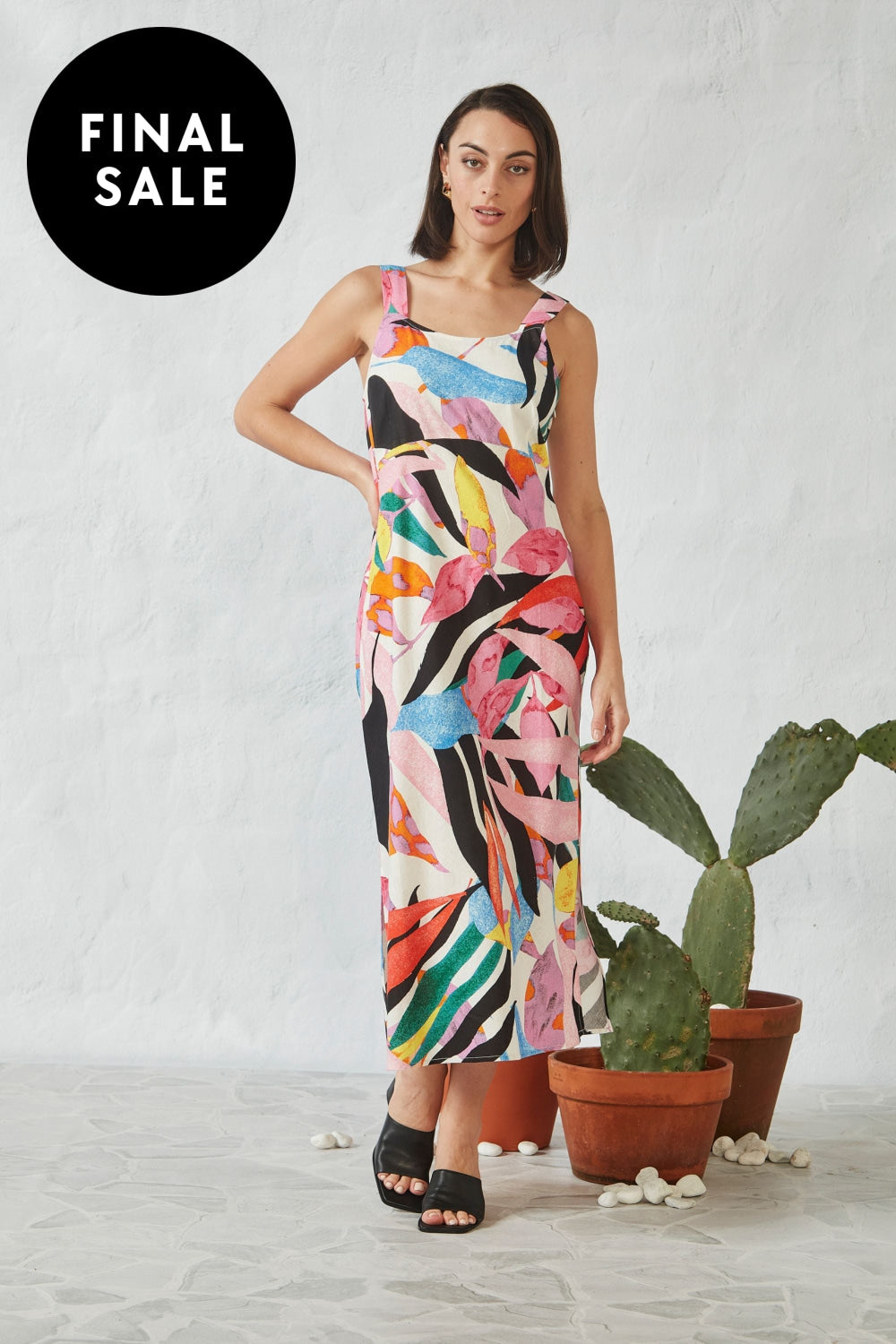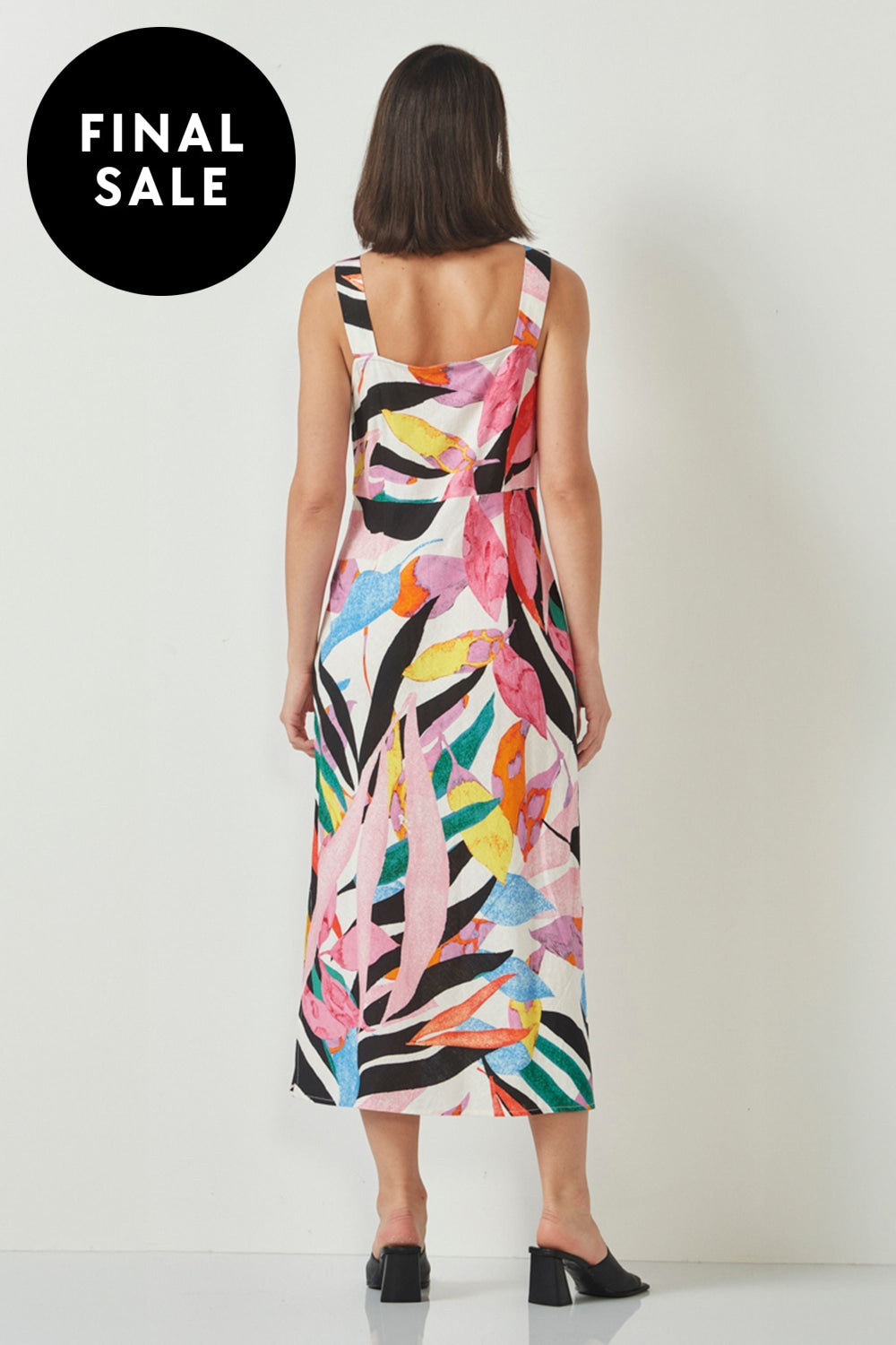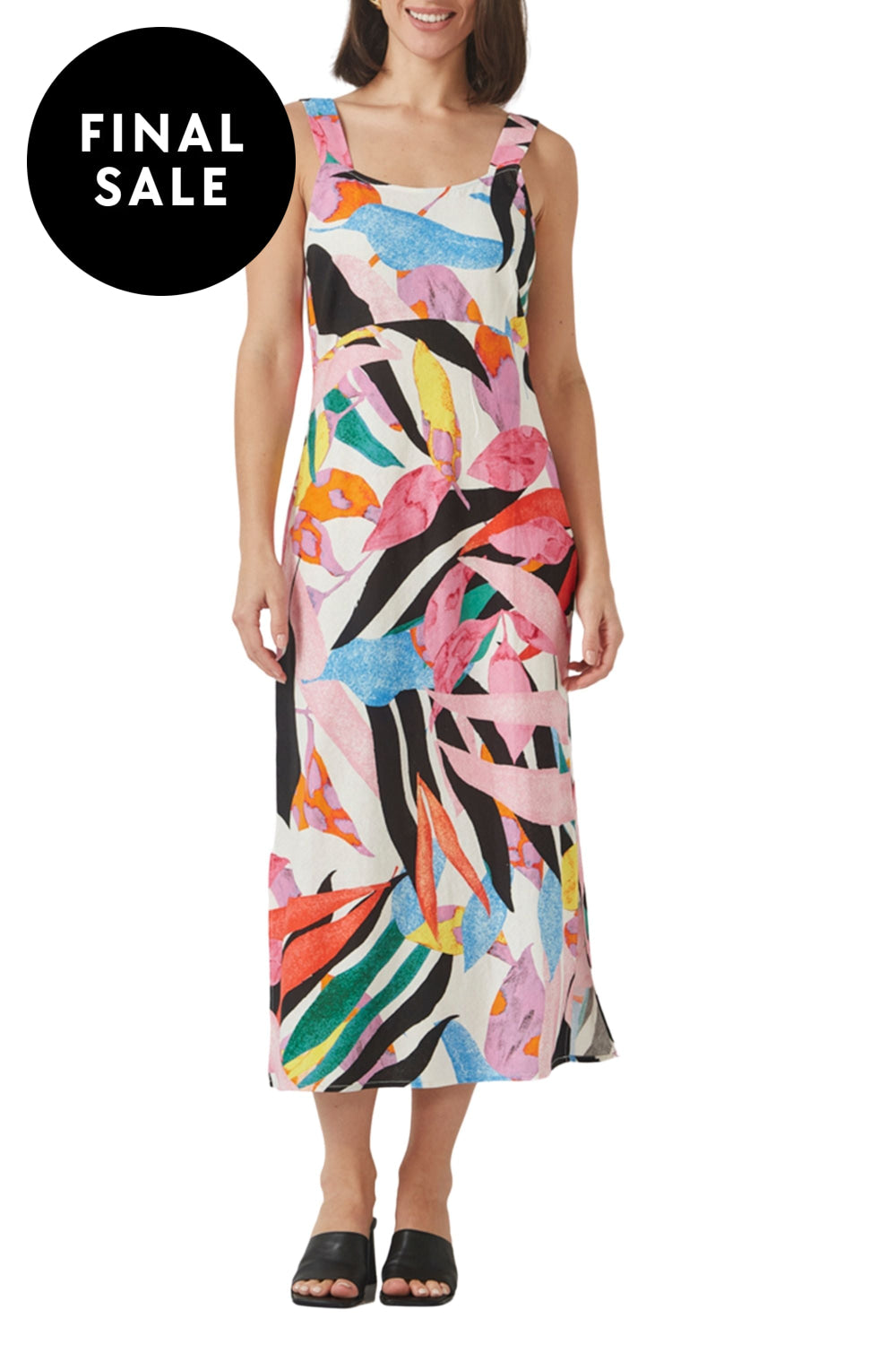 Tango print Linen sundress with wide shoulder straps. The Tango dress has a fitted bodice and bias cut skirt with side split. The Tango dress falls to lower calf.