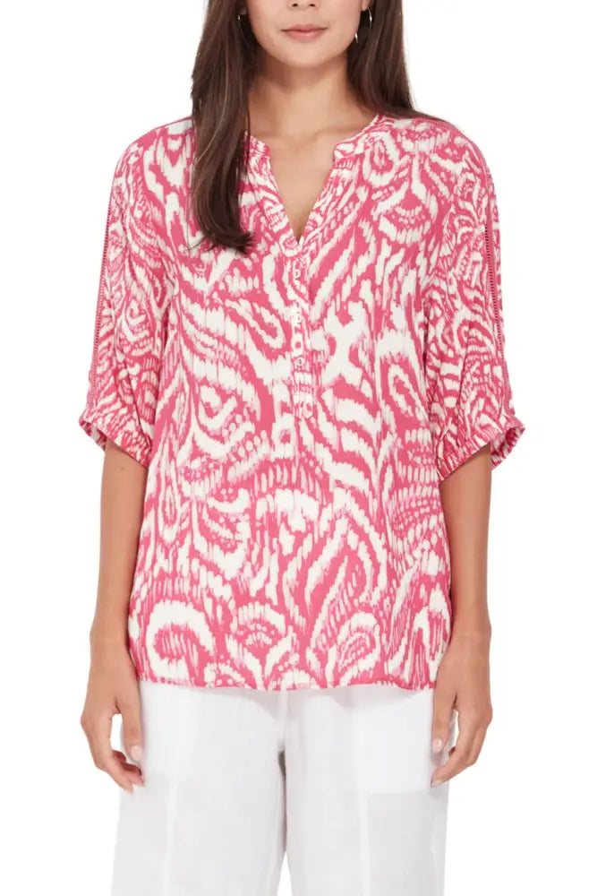 The Vale Top features a structured half placket with a V neckline for a clean, modern finish. Lace insert detailing runs through the shoulder and down the length of the sleeve, adding a feminine touch. The sleeve gathers into a soft elastic cuff for ease and comfort. Crafted from soft-touch rayon, it skims the hip with a curved hem, an effortless piece to dress up or down. Wear with the matching skirt.