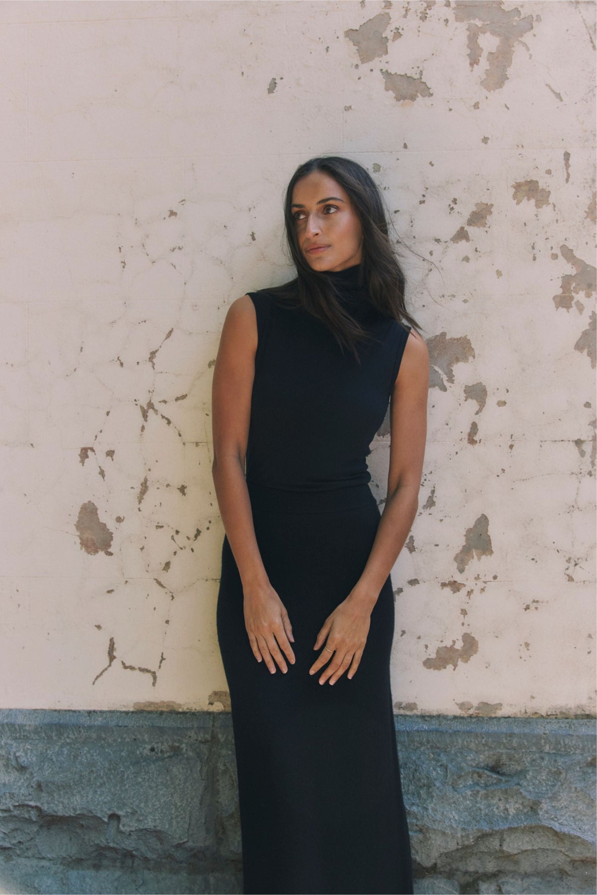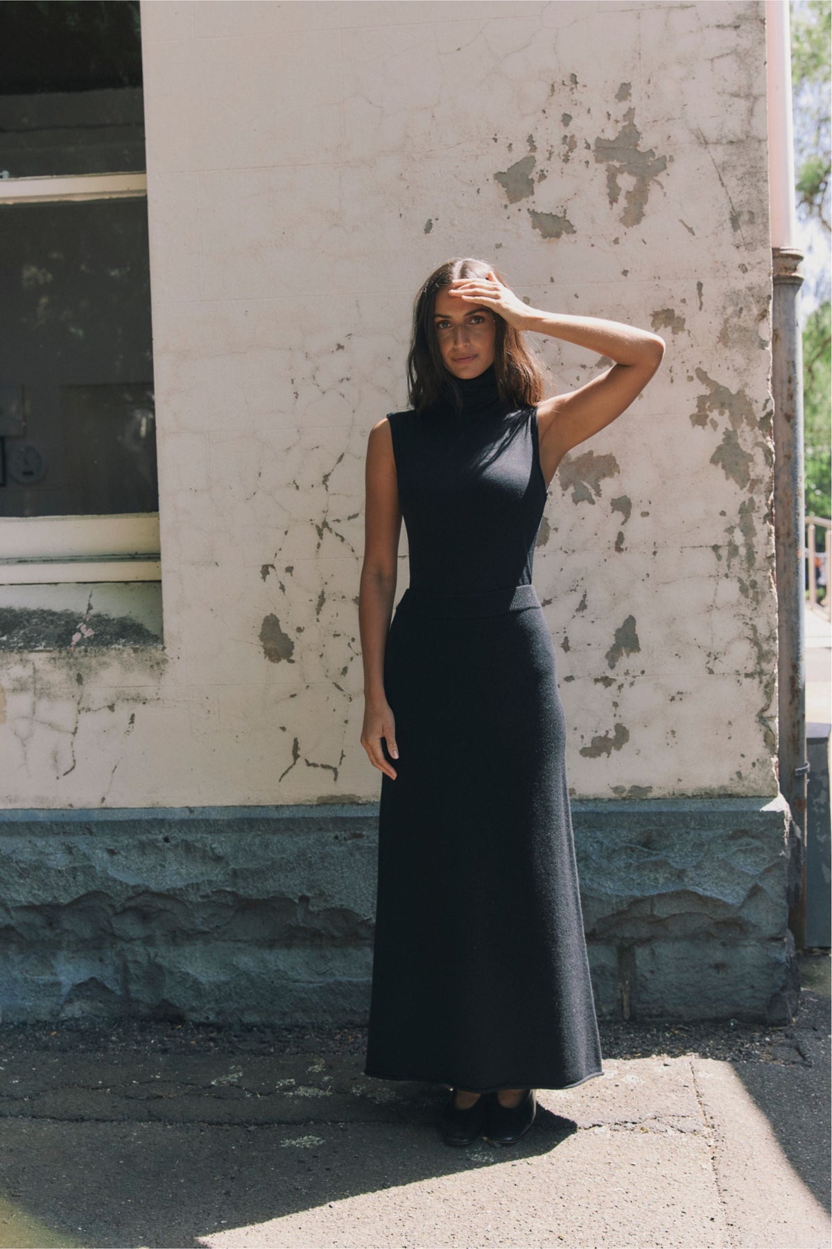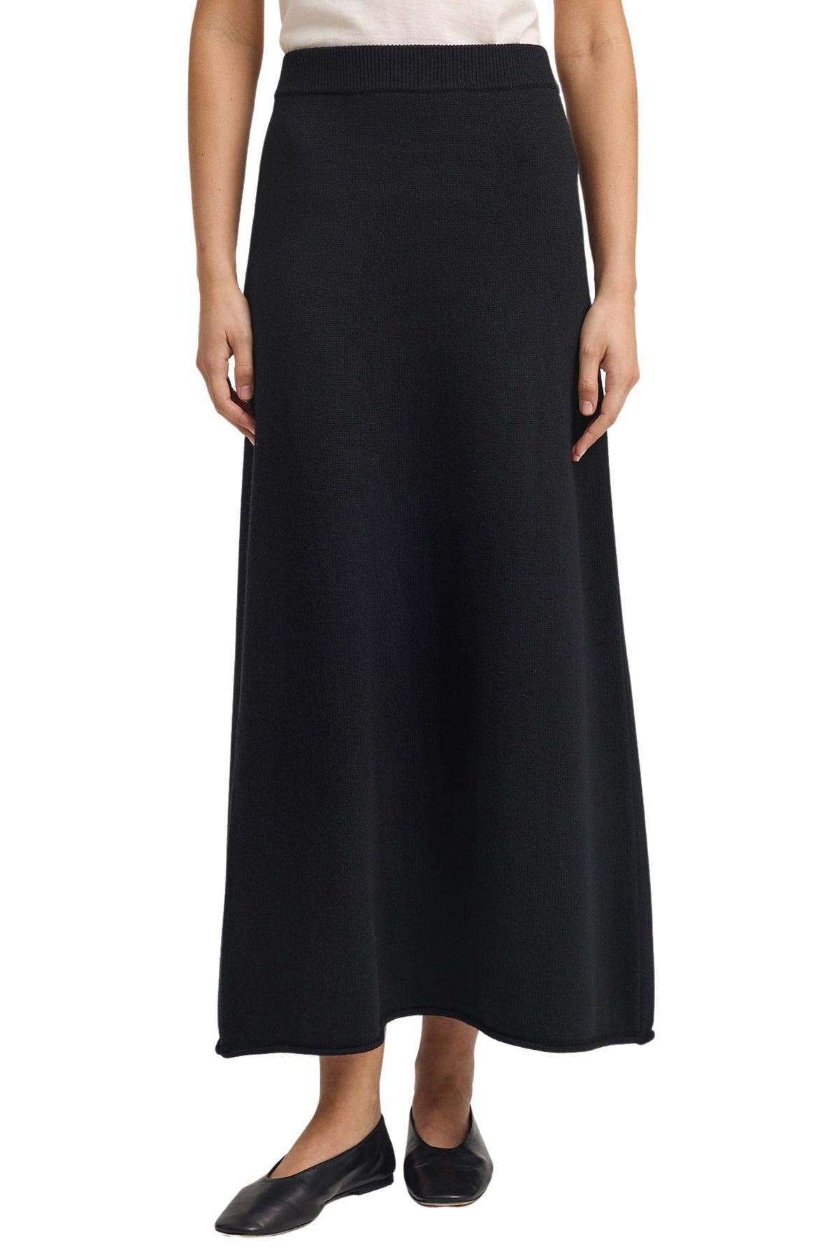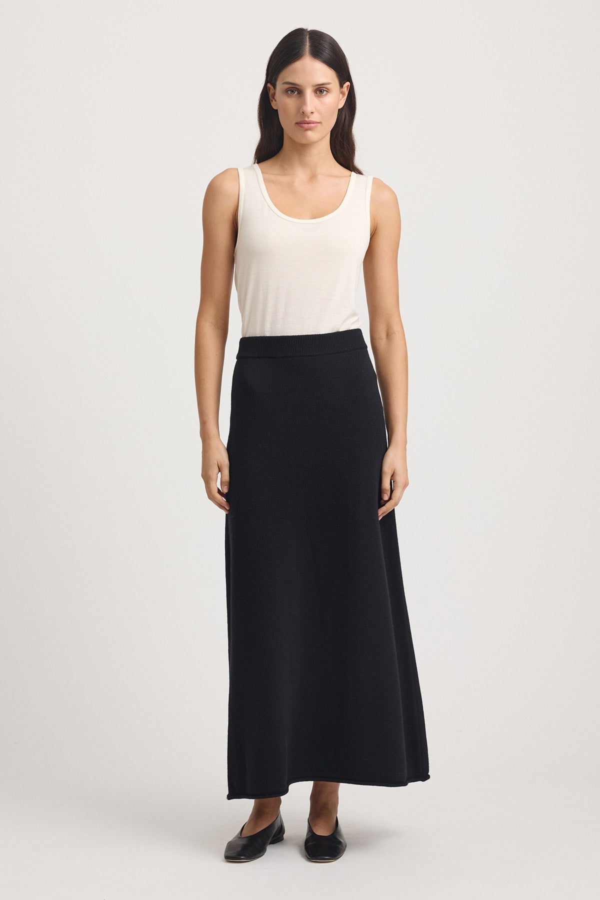 The Lambswool Skirt features an elongated, A-Line silhouette. It has a soft, elasticated waistband and a small roll trim along the hem.