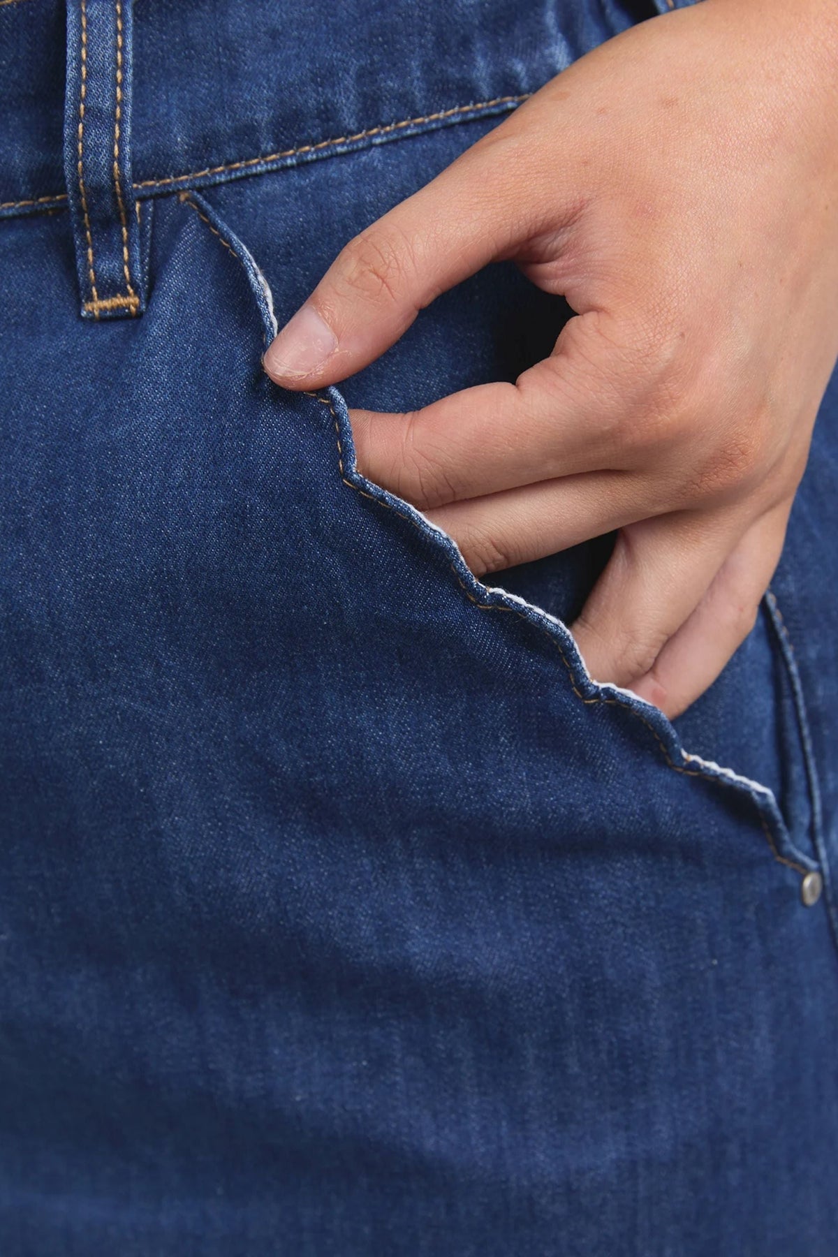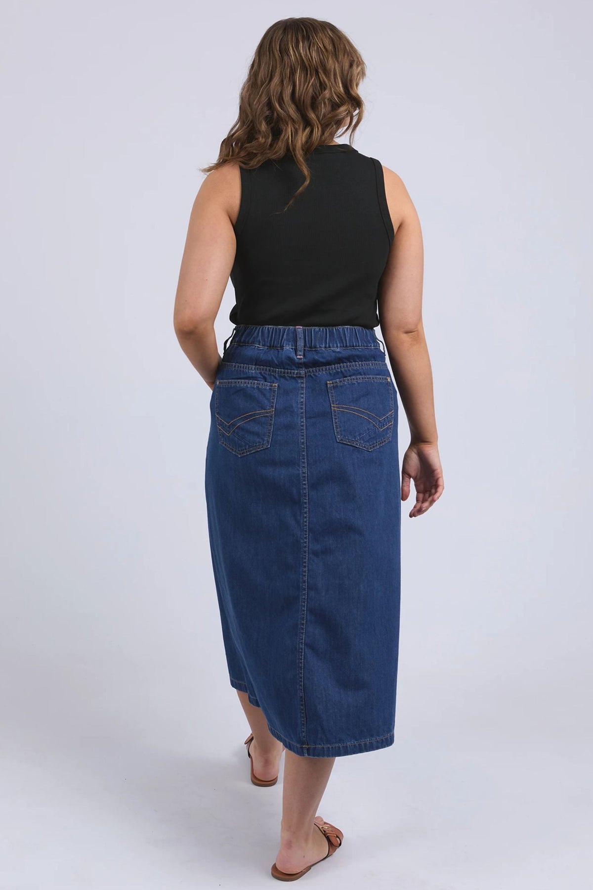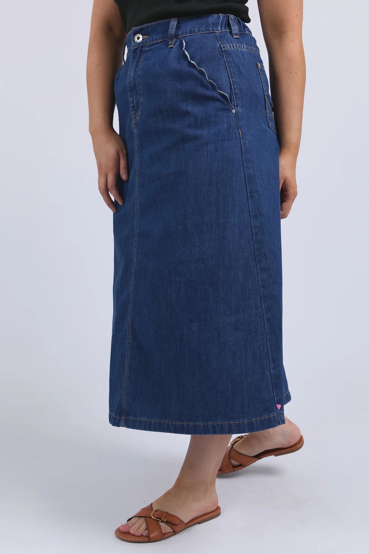 Elm's Scallop Edge Denim Skirt combines classic style with charming details. This mid-blue midi skirt features distinctive scallop-edge pockets and a comfortable elastic back waist, making it effortlessly versatile for everyday wear or weekend outings.
