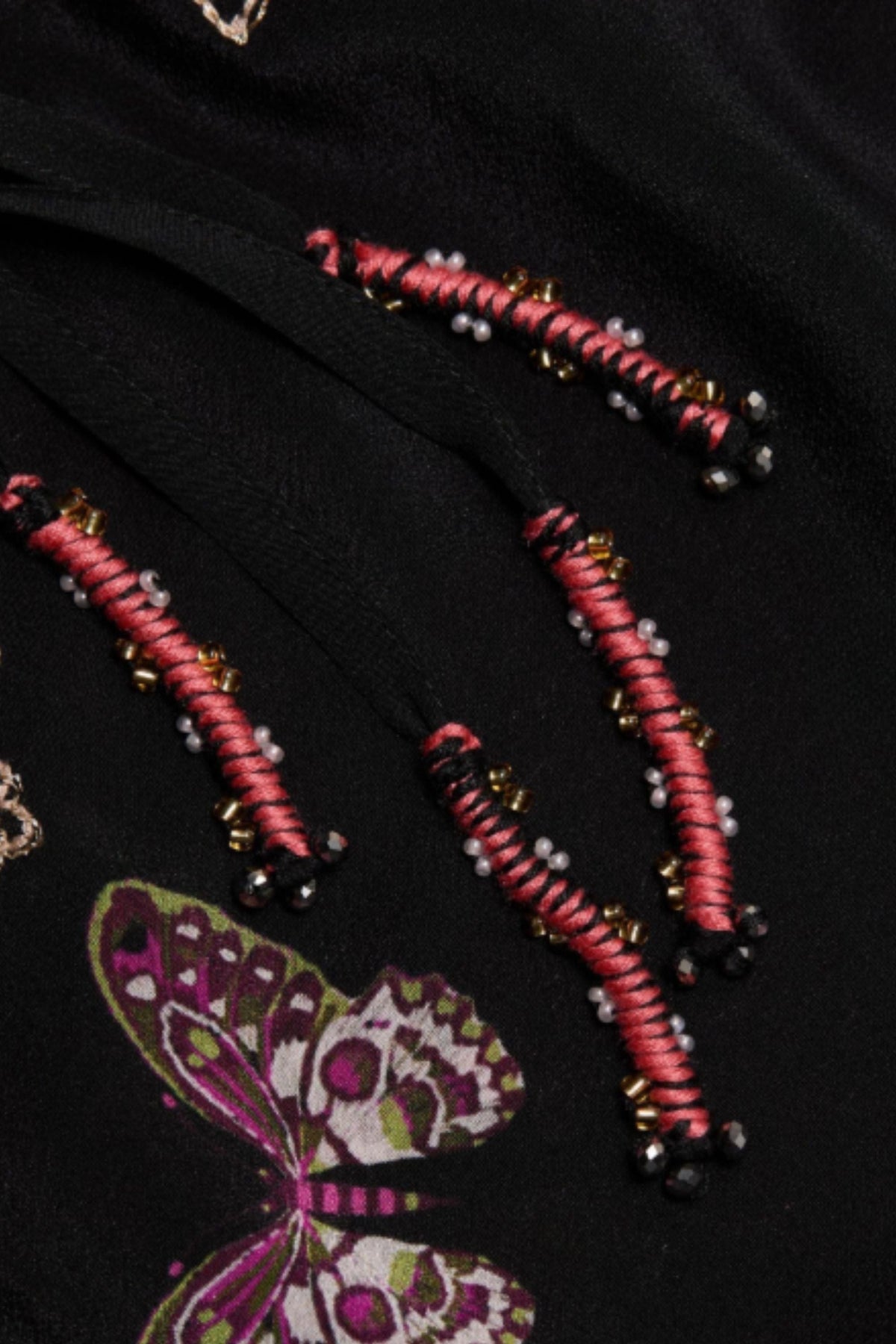 Beautifully crafted from 100% flowing silk, the Margot Blouse is adorned with fresh florals and butterflies in flight. Featuring a split V-neckline with beaded tassels and gathers at the neckline, this elegant blouse offers 3/4 sleeves with cuffs and is finished with side slits for a relaxed fit. Pair with cropped wide-leg pants and easy mule sandals for a modern casual look.