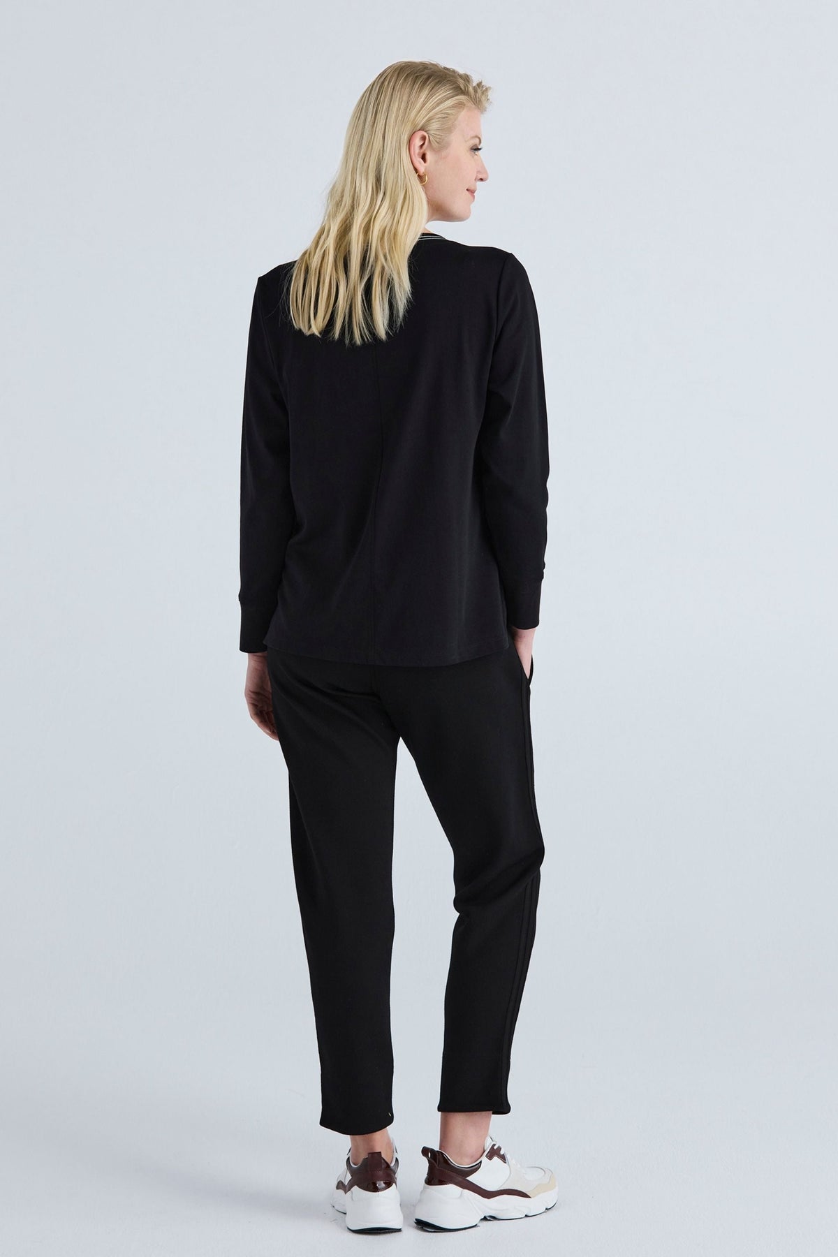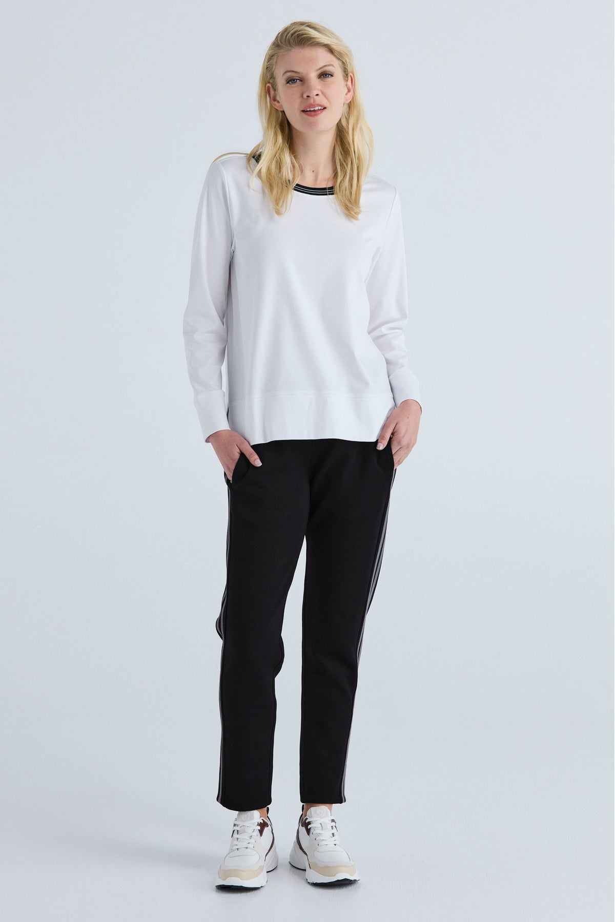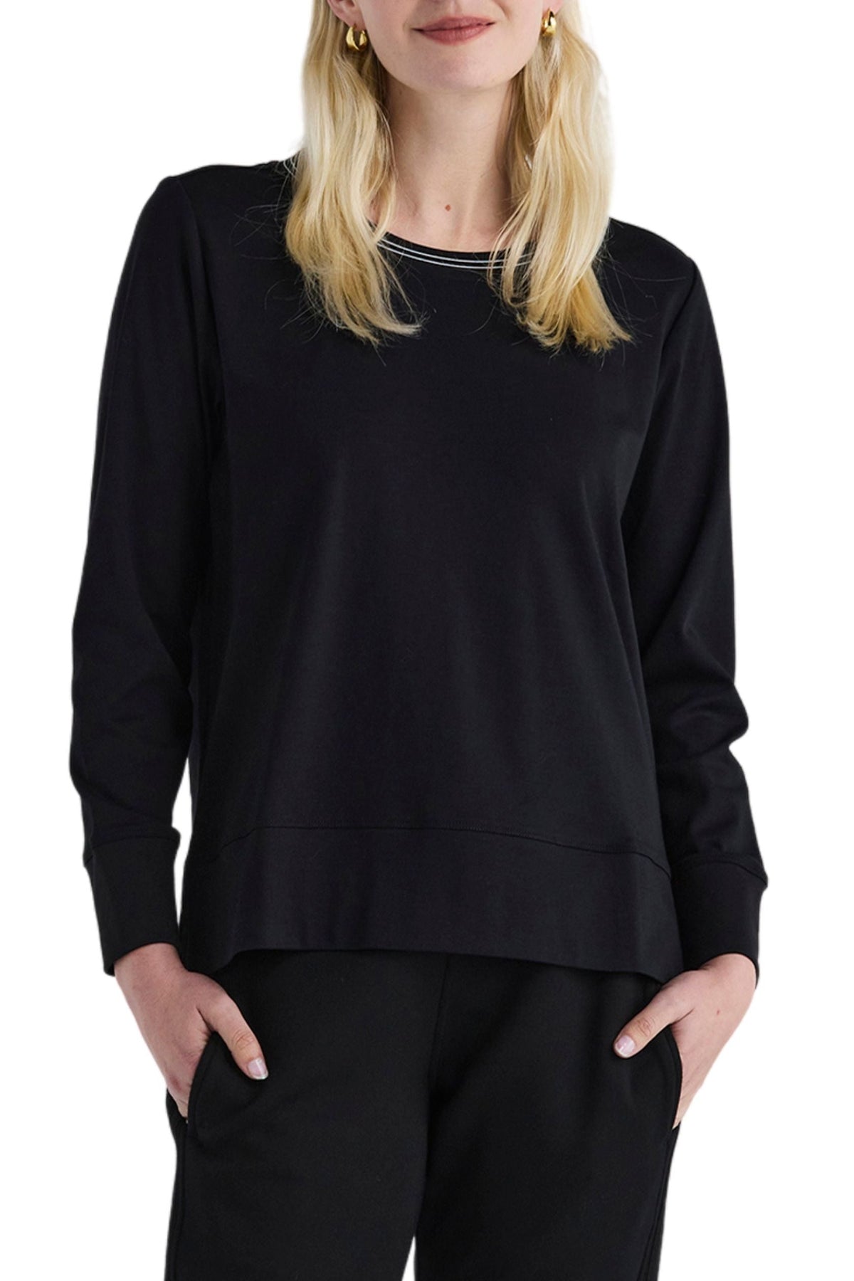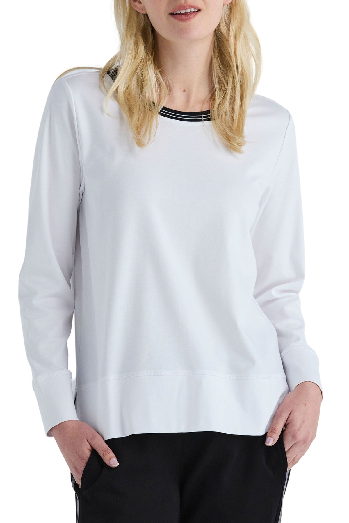 Designed for comfort, the Monty Top is a relaxed-fit cotton long sleeve top with sporty black and white striped tape at the neckline. This piece effortlessly combines style and ease for a laid-back look.