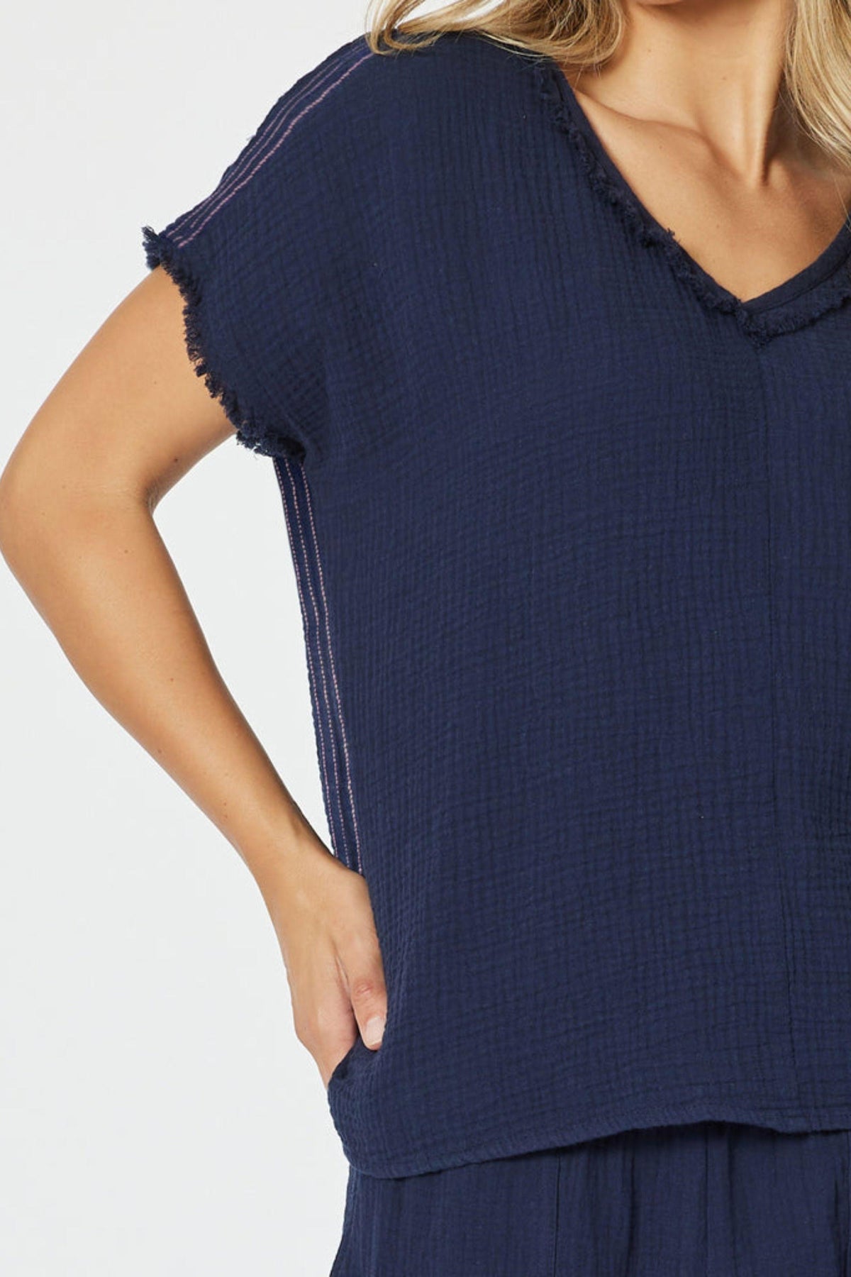 • Pink topstitching on shoulder and side seams