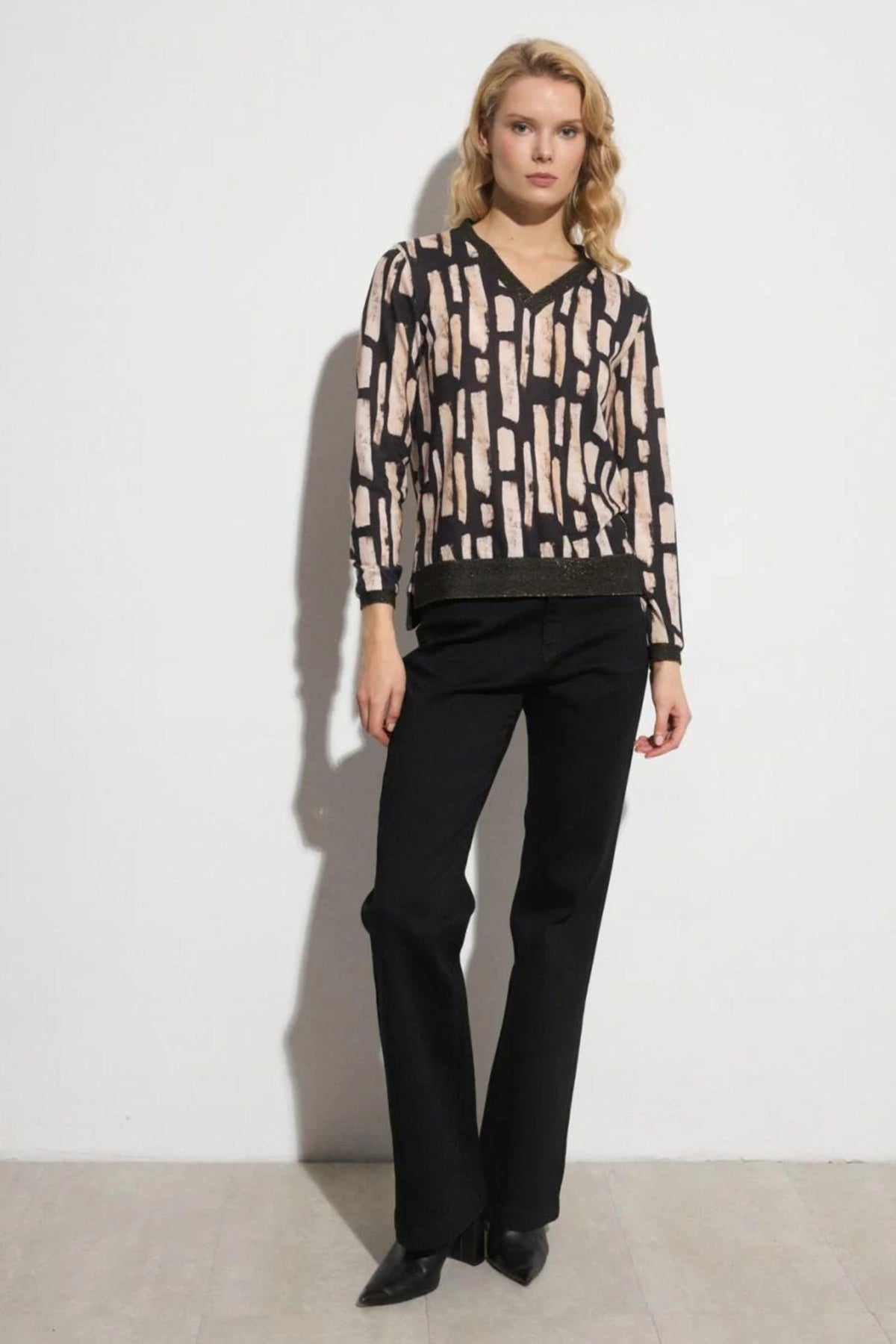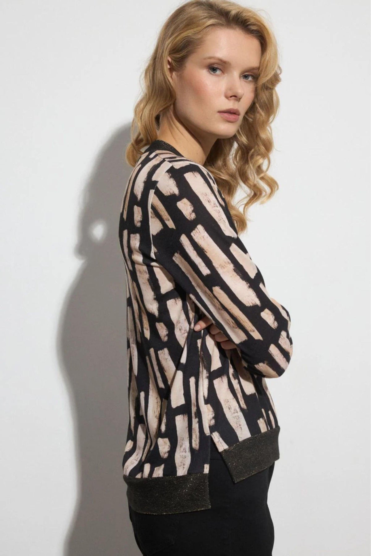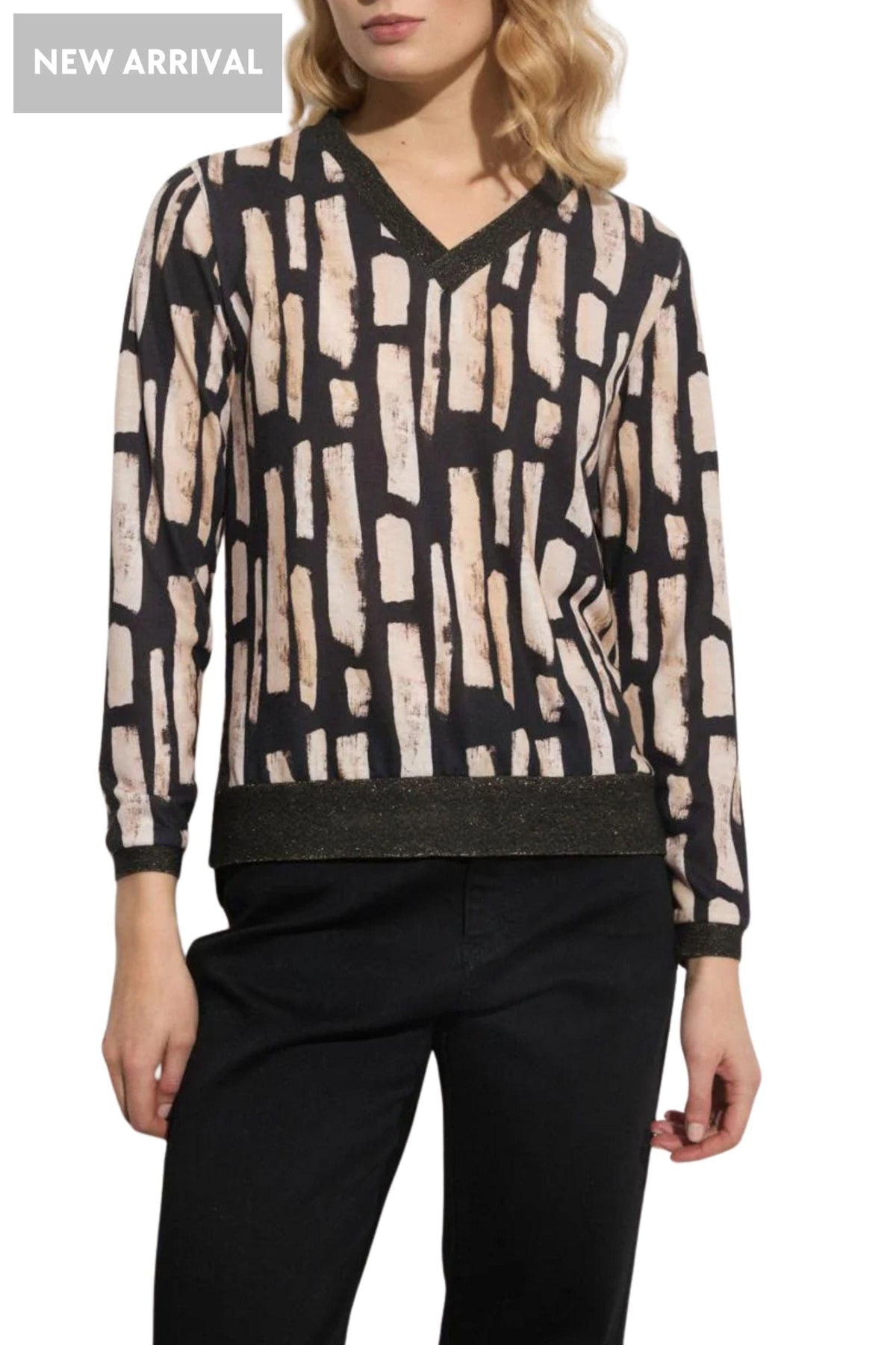 This fine knit Duilia top from Tinta offers a classic v-neck style in a bold print. The cuffs, hem and neckline are in a ribbed black knit with metallic thread running through - adding a hint of sparkle to your wardrobe. We also offer this print in the Clovia A-line maxi skirt that works perfectly as a polished co-ord look.