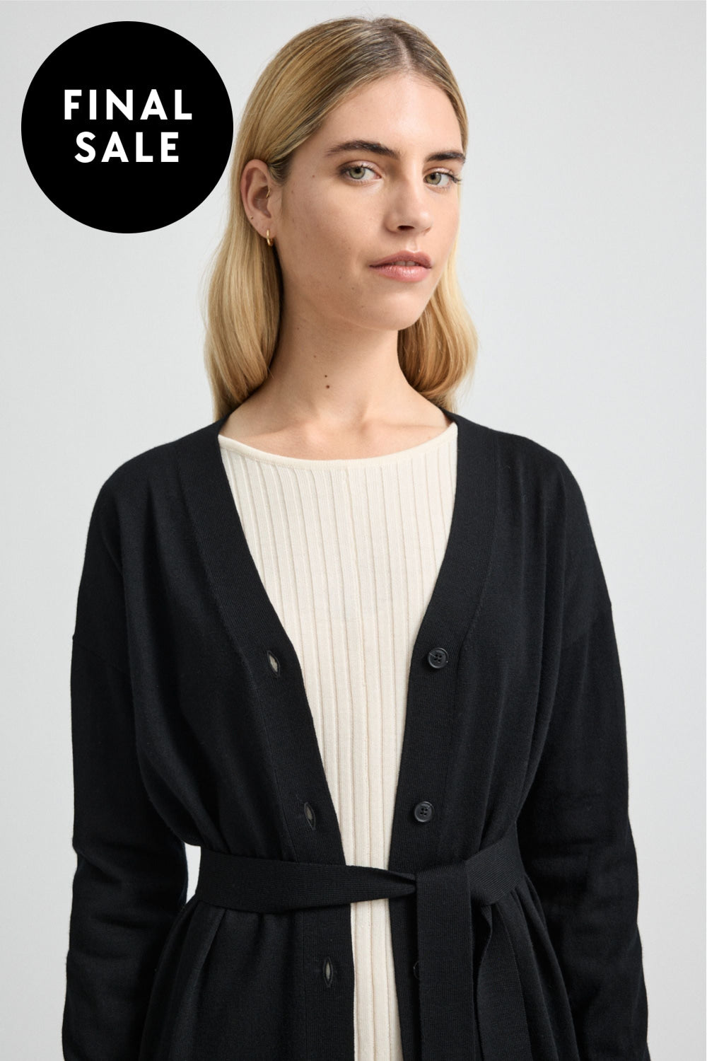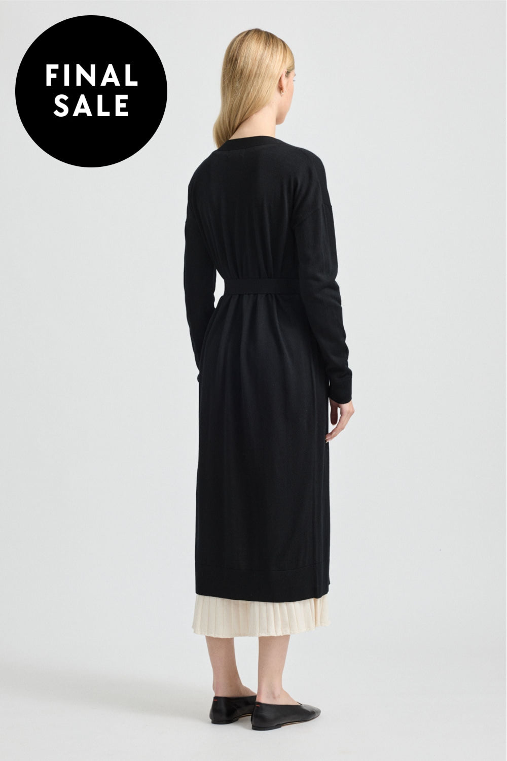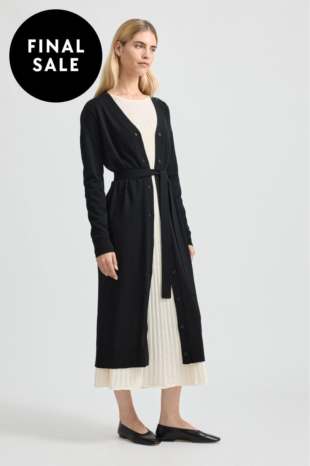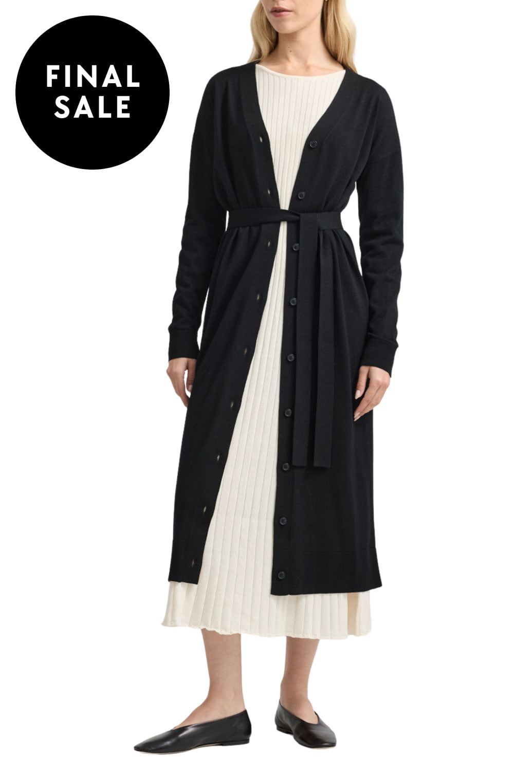 A relaxed fitting, longer line cardigan, crafted in a super fine merino wool. It features a v-neckline and button panel. This adaptable knit can be worn either open as a cardigan or closed as a dress.