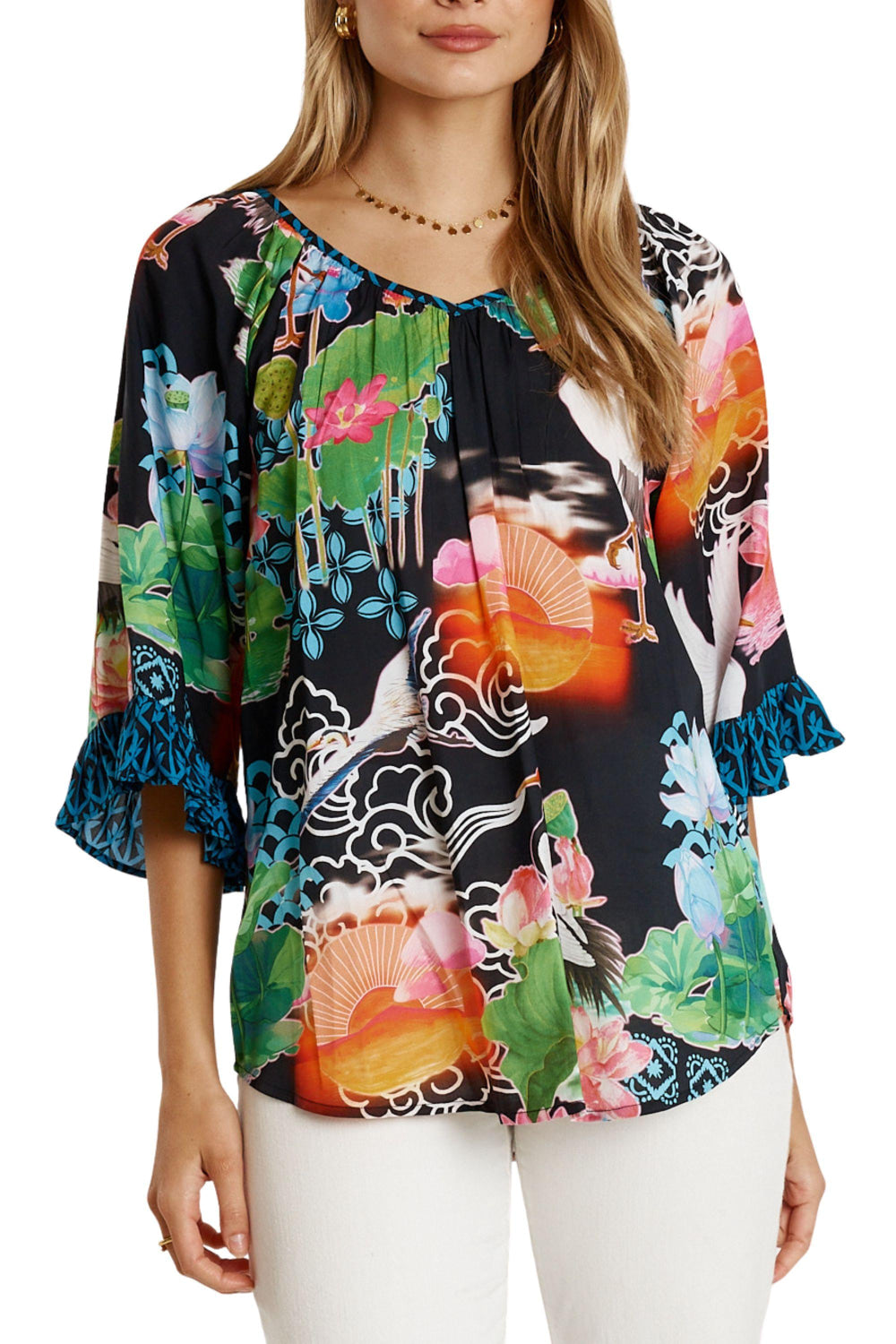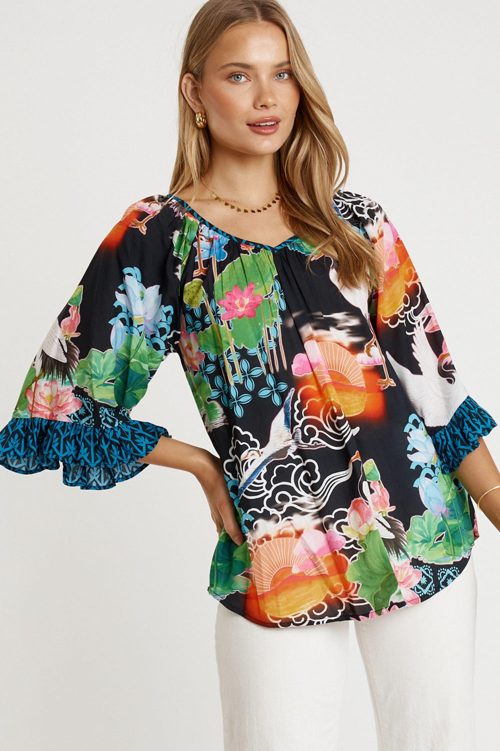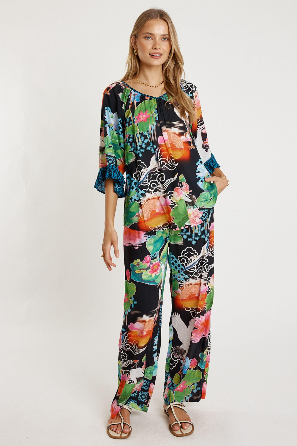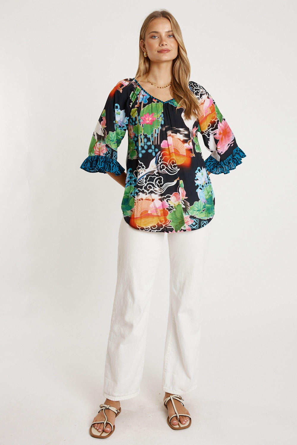 Blending comfort with standout detail, the Lula Life Akiko Top brings easy, everyday style with a touch of charm. Made from 100% viscose, this relaxed top feels soft and lightweight, perfect for warm days or laid-back outings. The V-neckline, gentle gathers, and wide raglan sleeves with a flounce hem give it a flowy, feminine look. Finished with a curved hem and a Japanese-inspired digital print, this Australian-designed piece pairs effortlessly with denim, linen, or your favourite summer pants for a bold yet easy vibe.