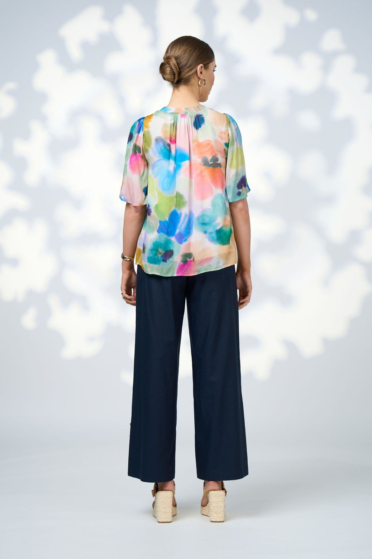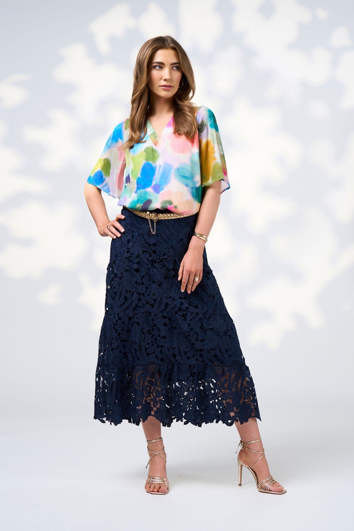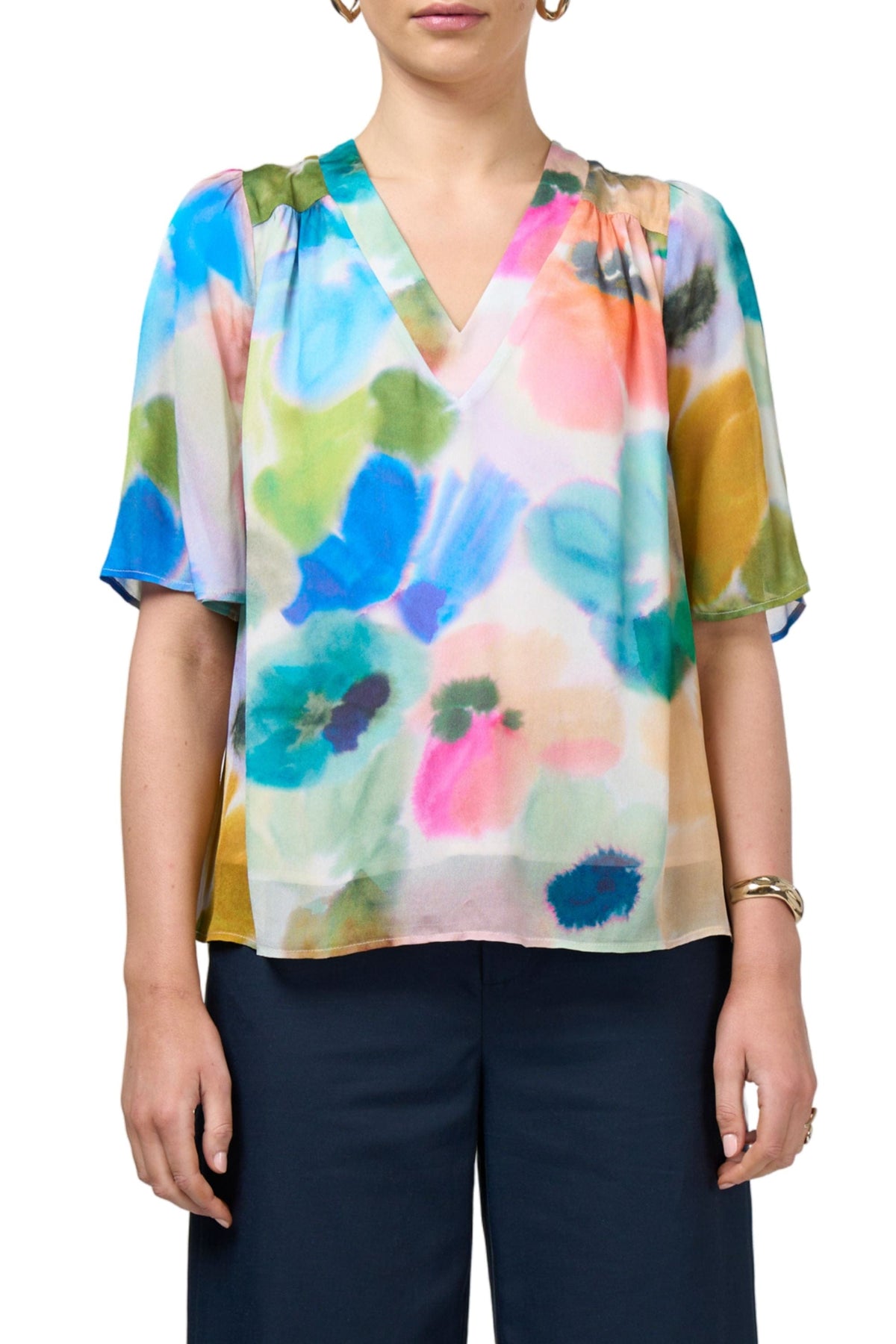 Sheer floaty tee with deep V neckline and floaty sleeves. With a lined body.