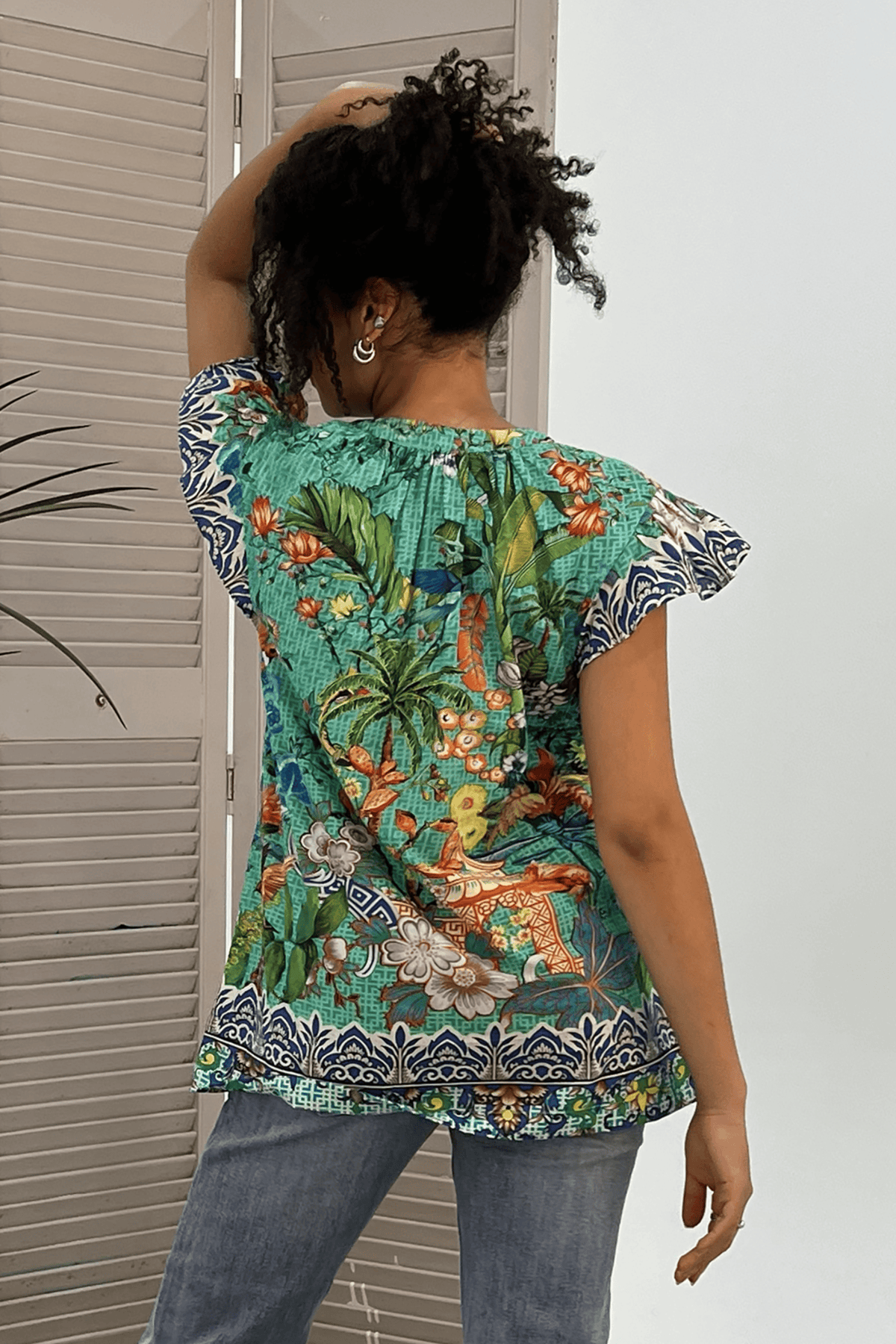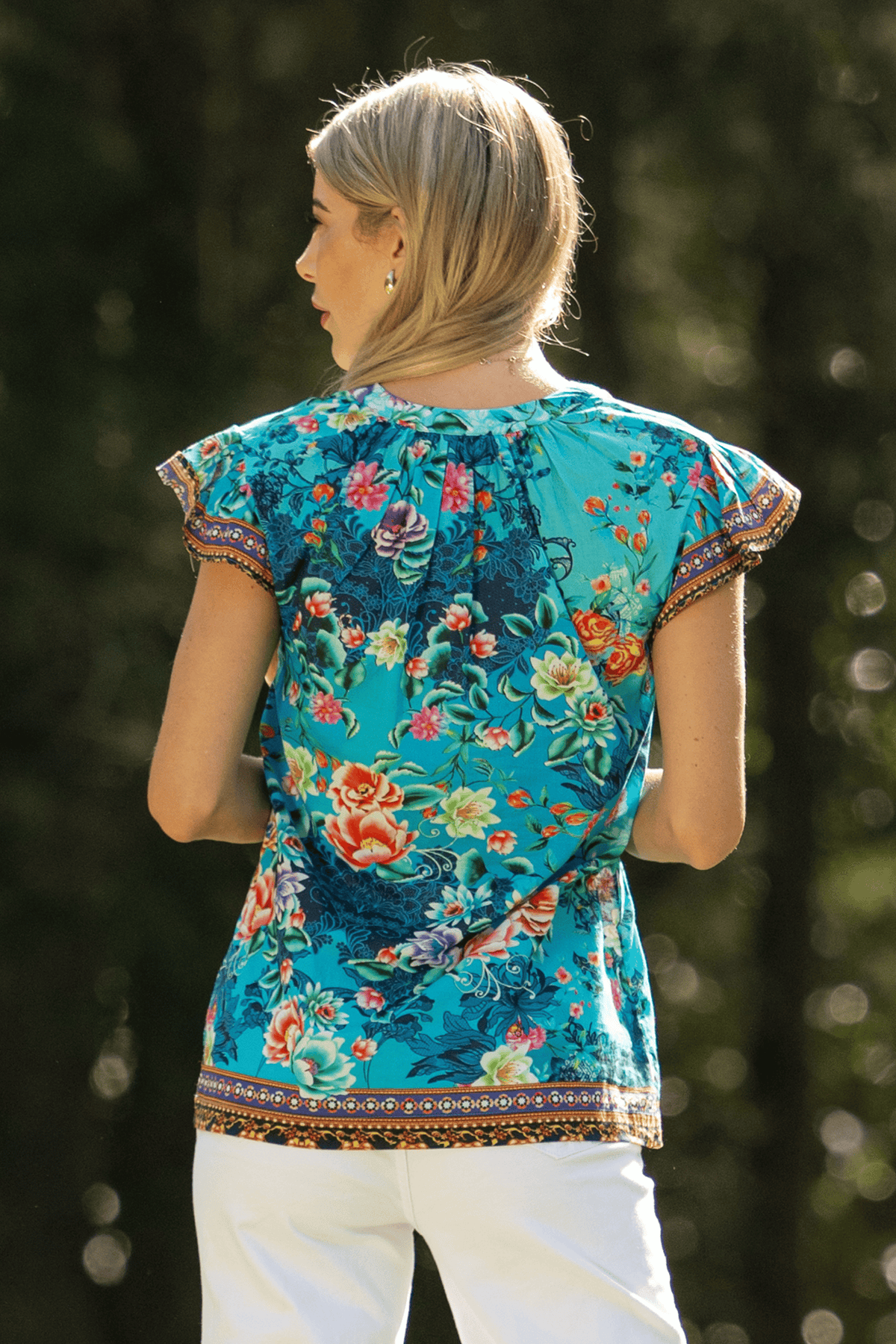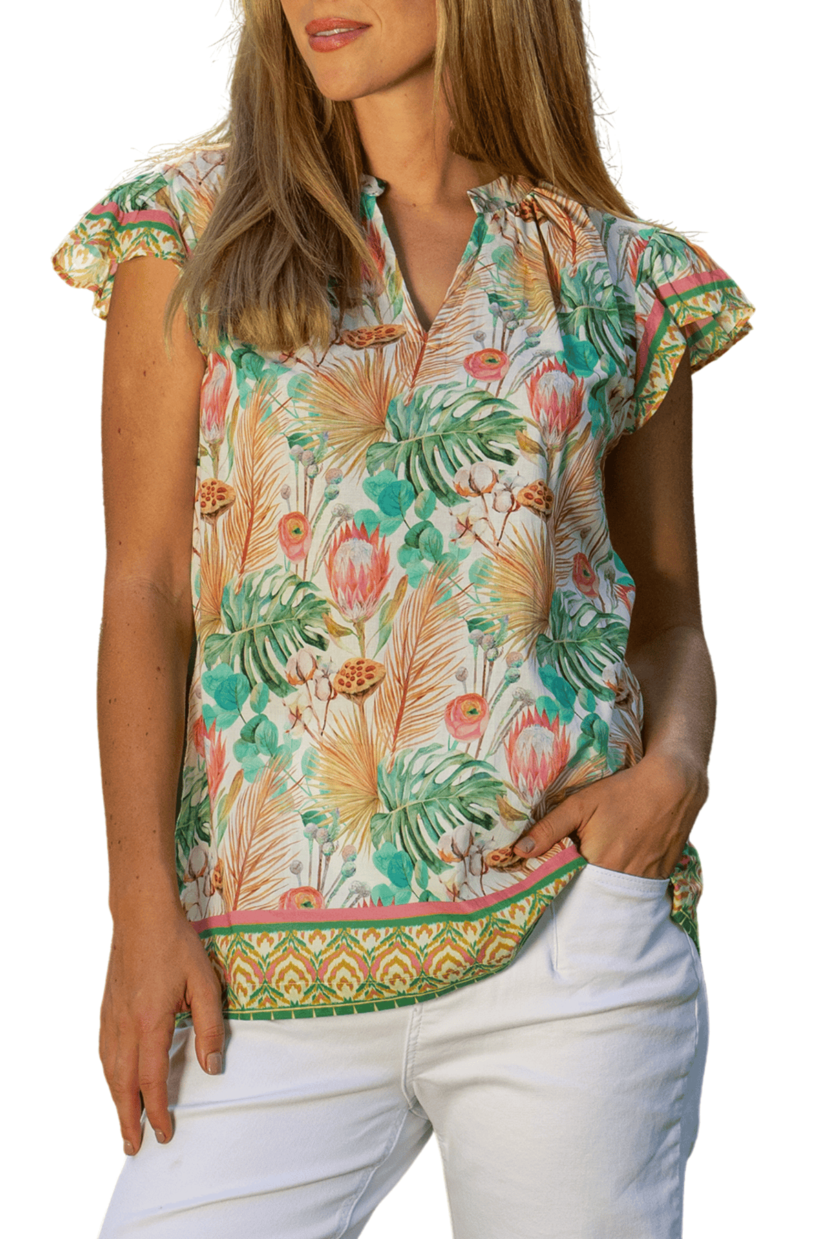 The Sarah Top is a delightful summer style crafted from pure cotton. It features a fun garden scene, perfect with capri jeans and sandals.