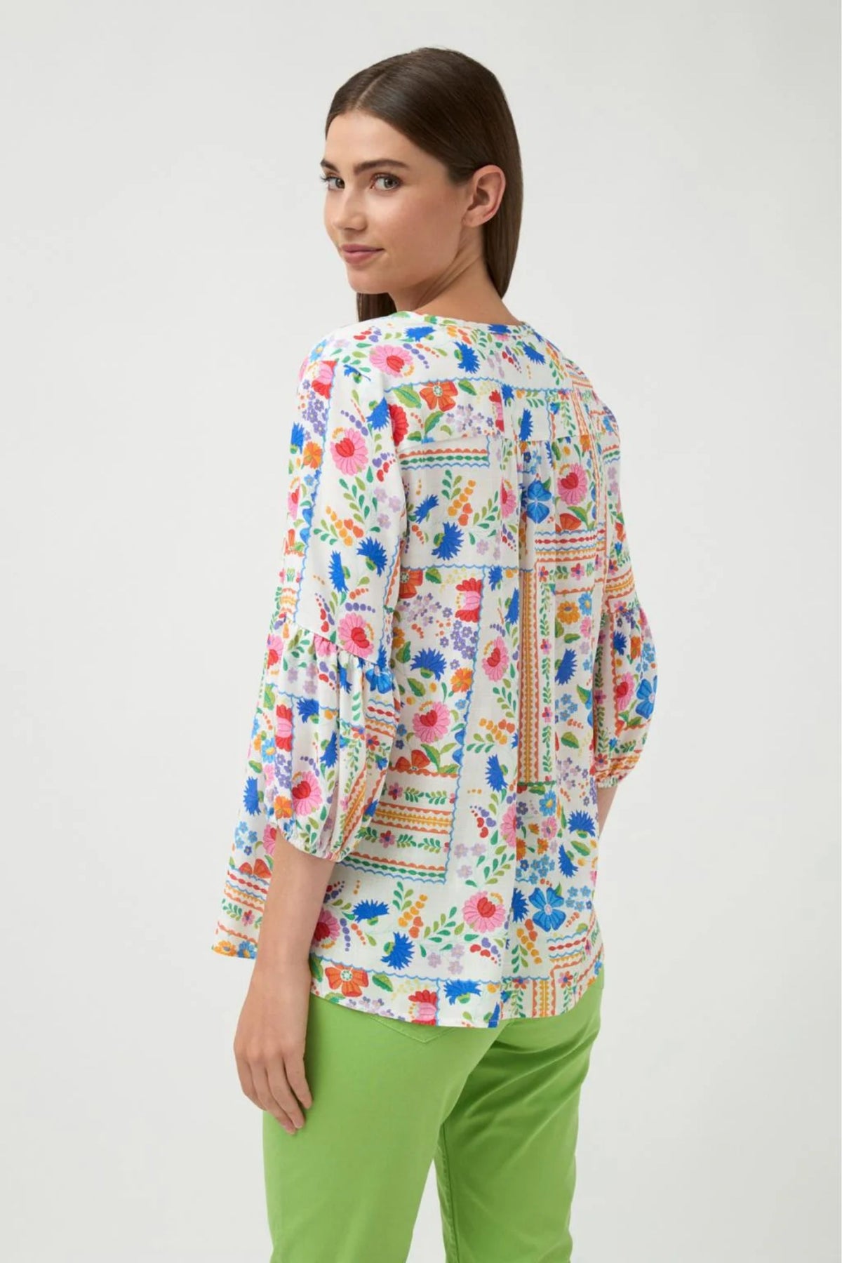 • Slightly puffed three-quarter sleeves with elasticated cuffs