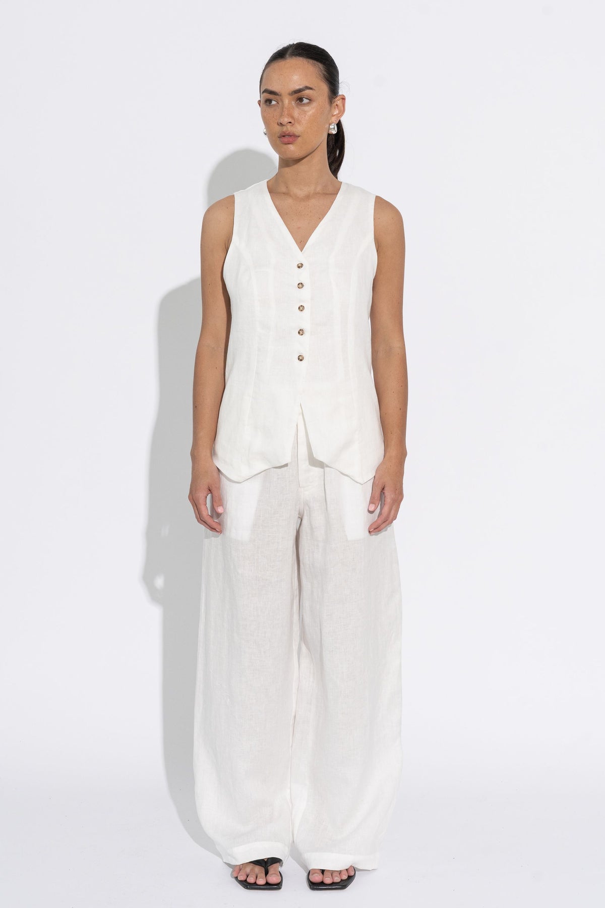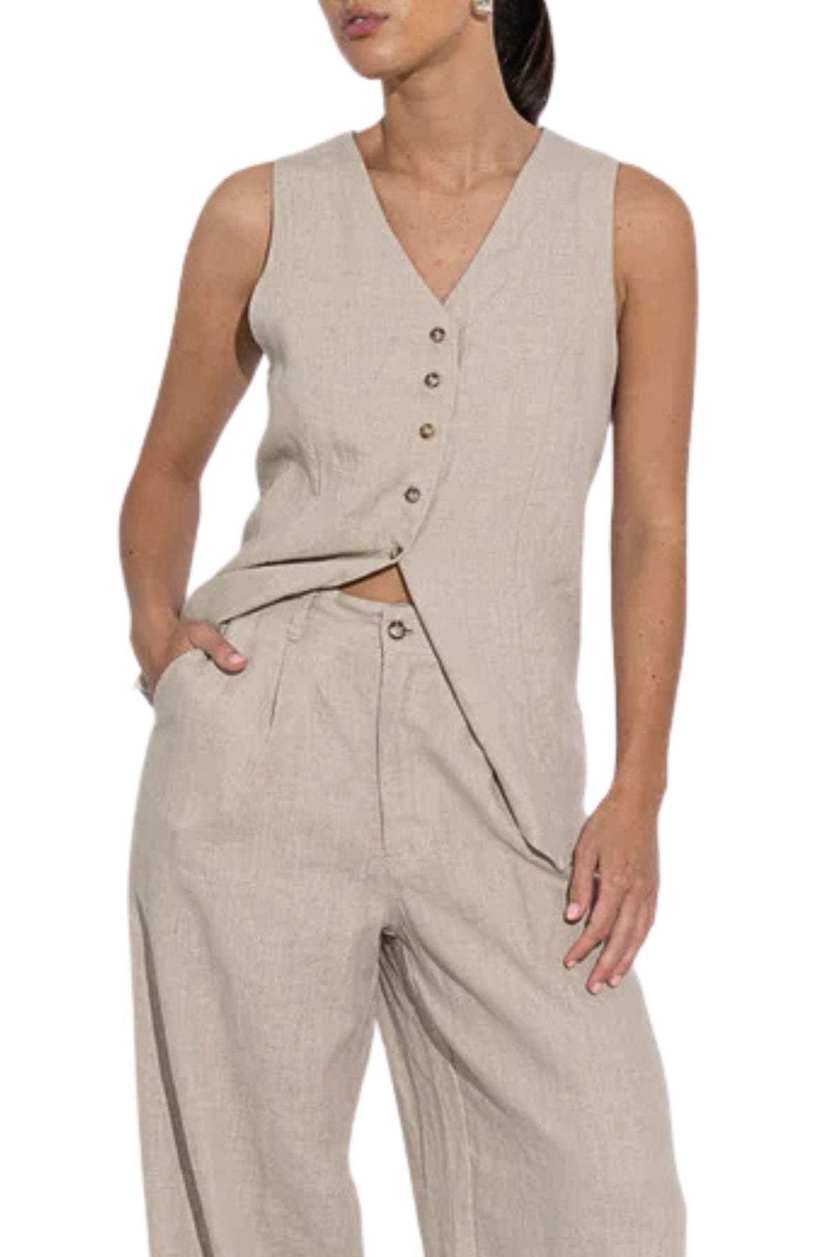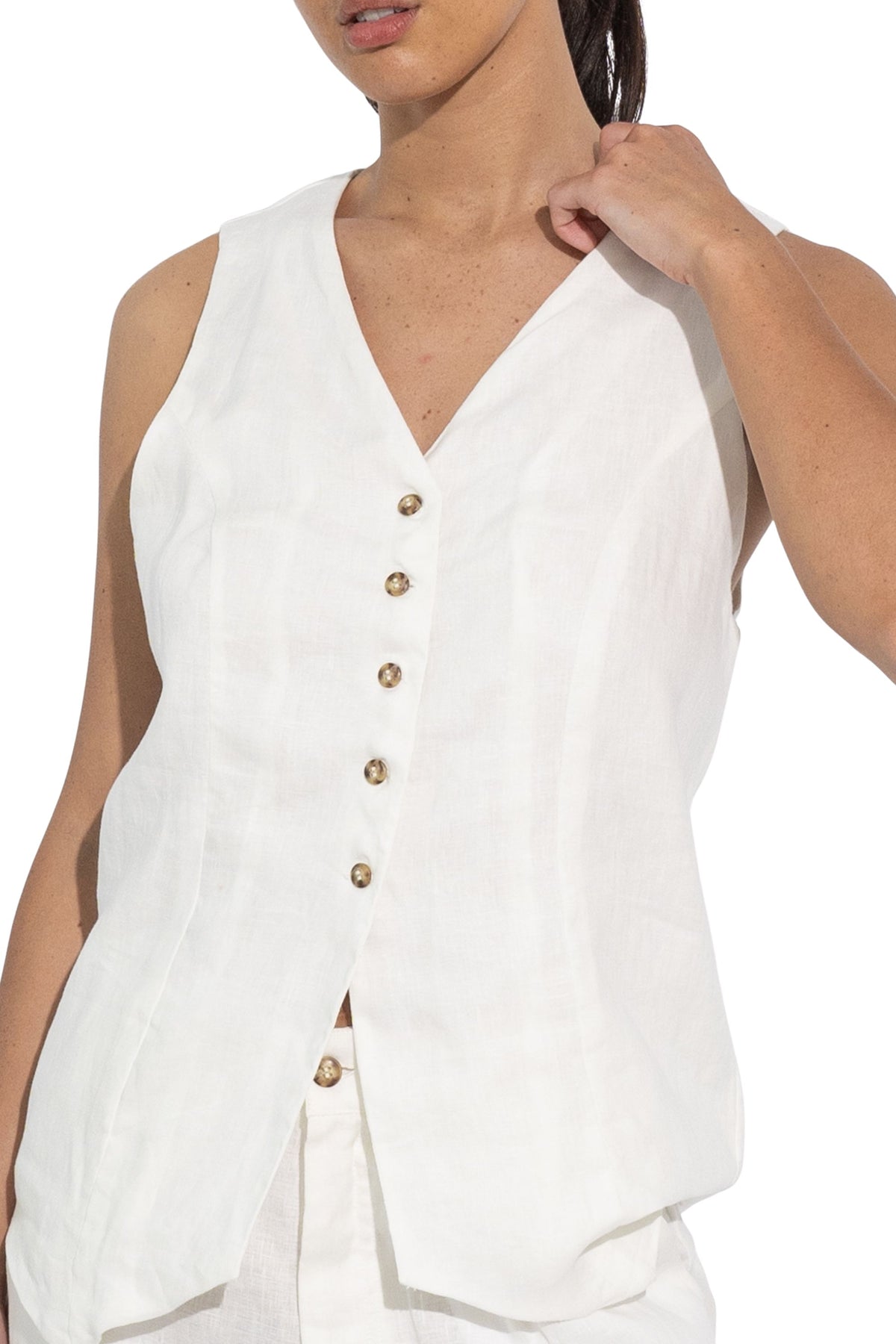 A tailored, fully-lined long line vest style top, featuring a v-neckline and five shell button detail. Crafted from midweight linen.