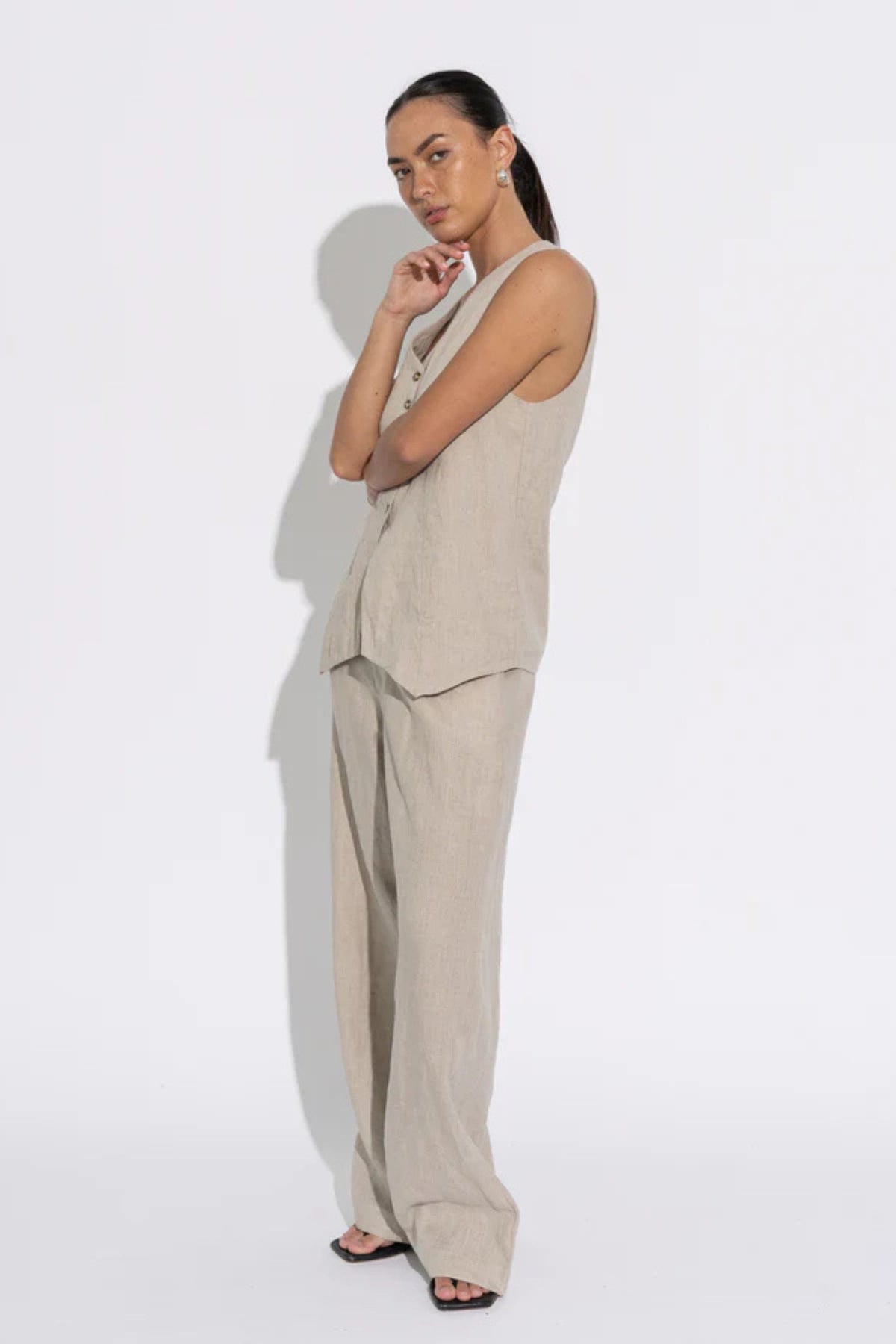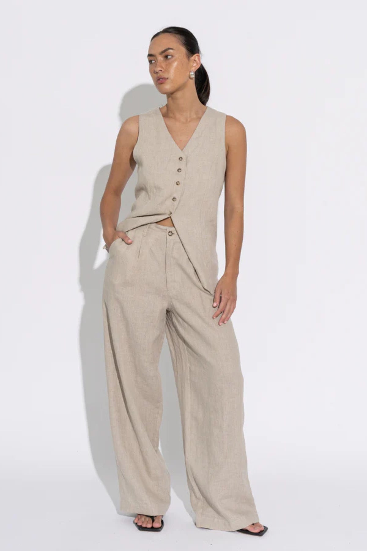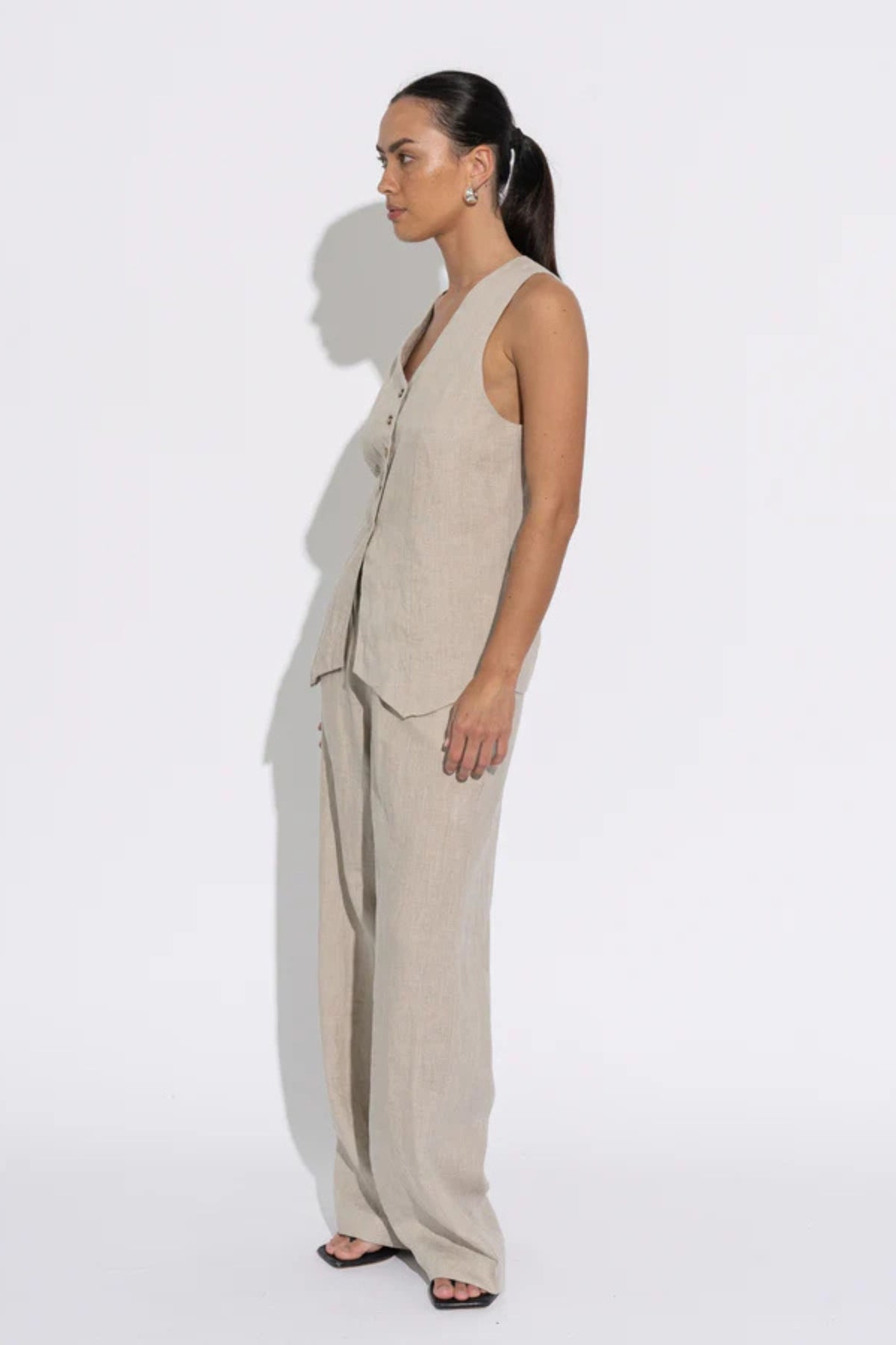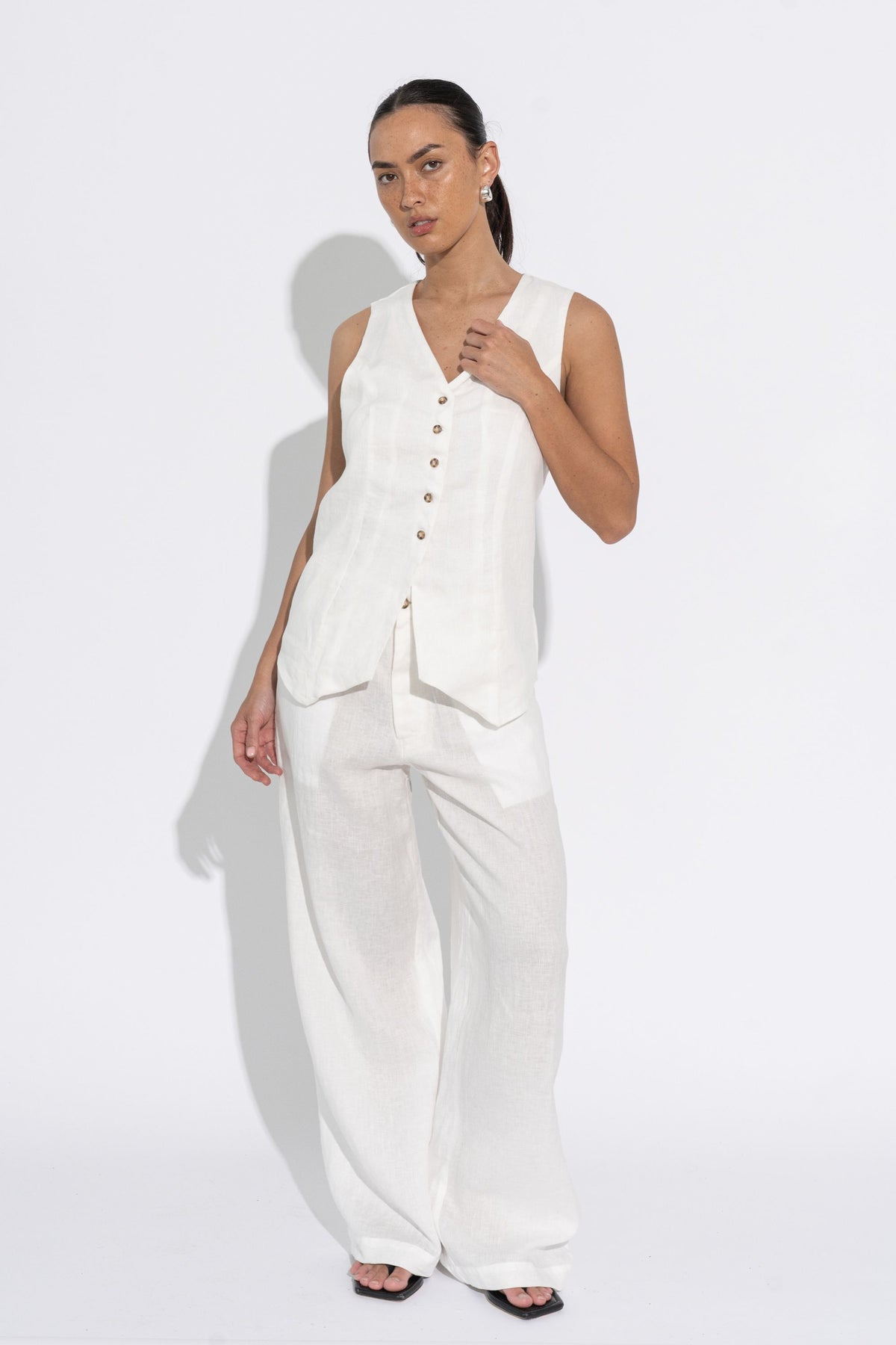 A tailored, fully-lined long line vest style top, featuring a v-neckline and five shell button detail. Crafted from midweight linen.