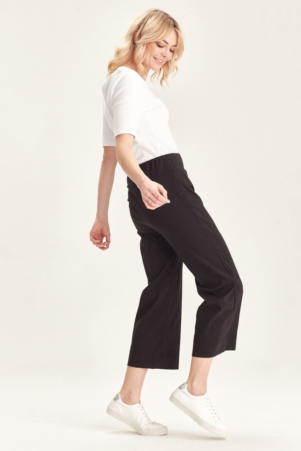 The Acrobat Kennedy Pant features wide leg, 7/8th length with an elasticated Basque waistband for easy pull-on. Made in Verge's exclusive European lightweight stretch cotton Acrobat fabric for comfort, breathability, and easy care.
