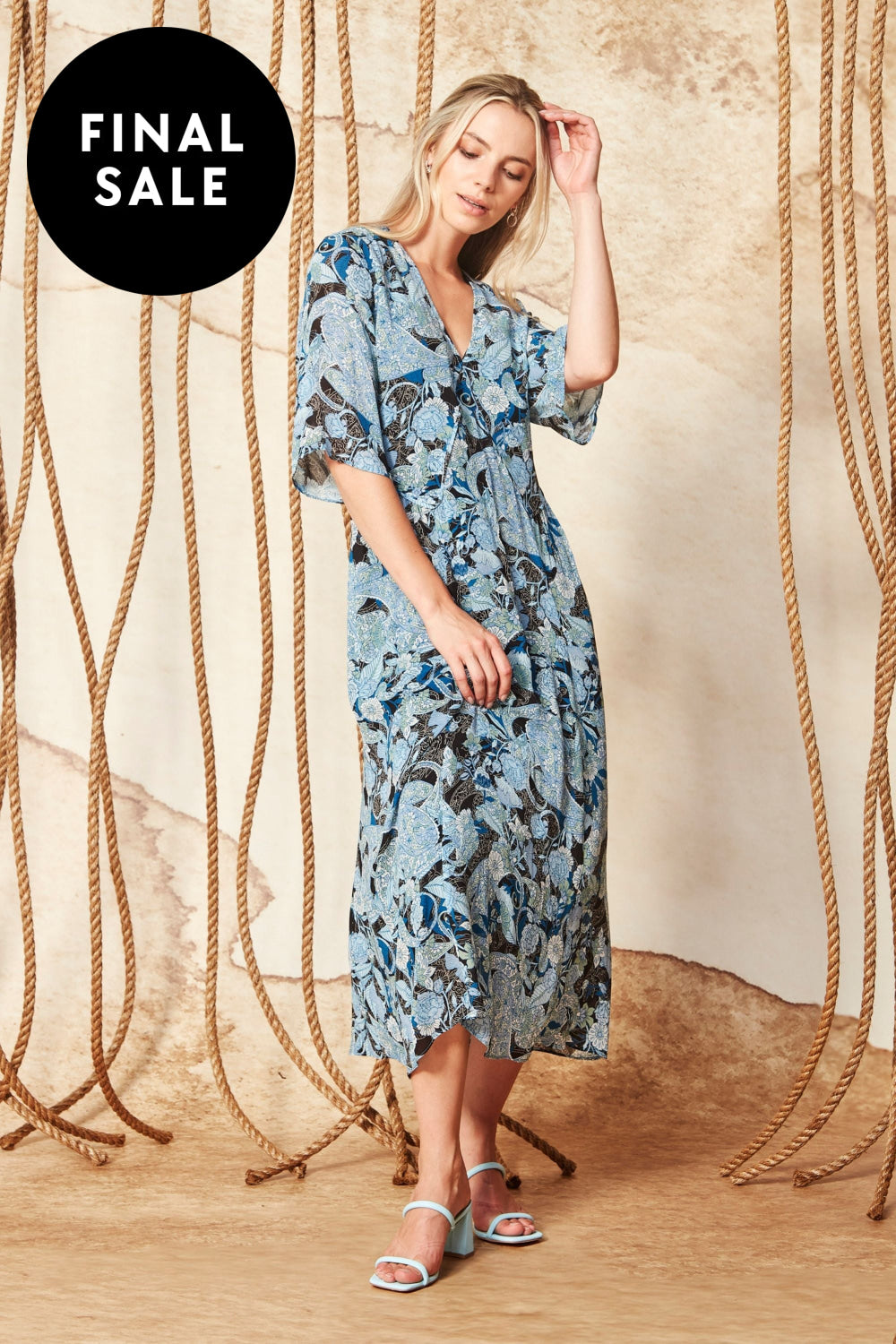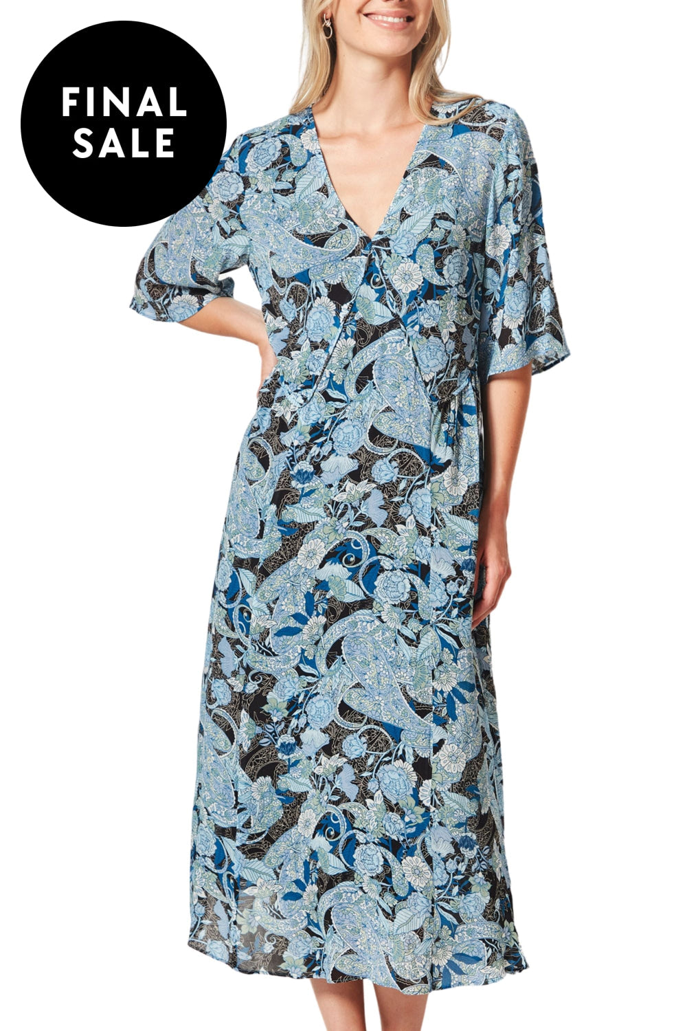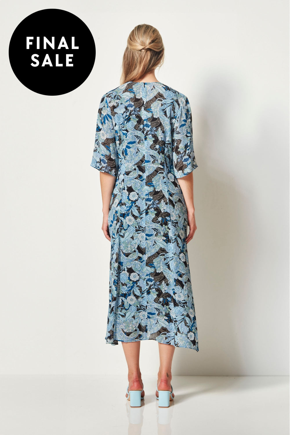 Stunning Aria print dress with V neckline. Panelled detail on front with panelled skirt. Zip back entry. Set in sleeve is slightly fluted and falls below just below the elbow. Back is shaped and waisted. The Aria dress falls to lower calf.
