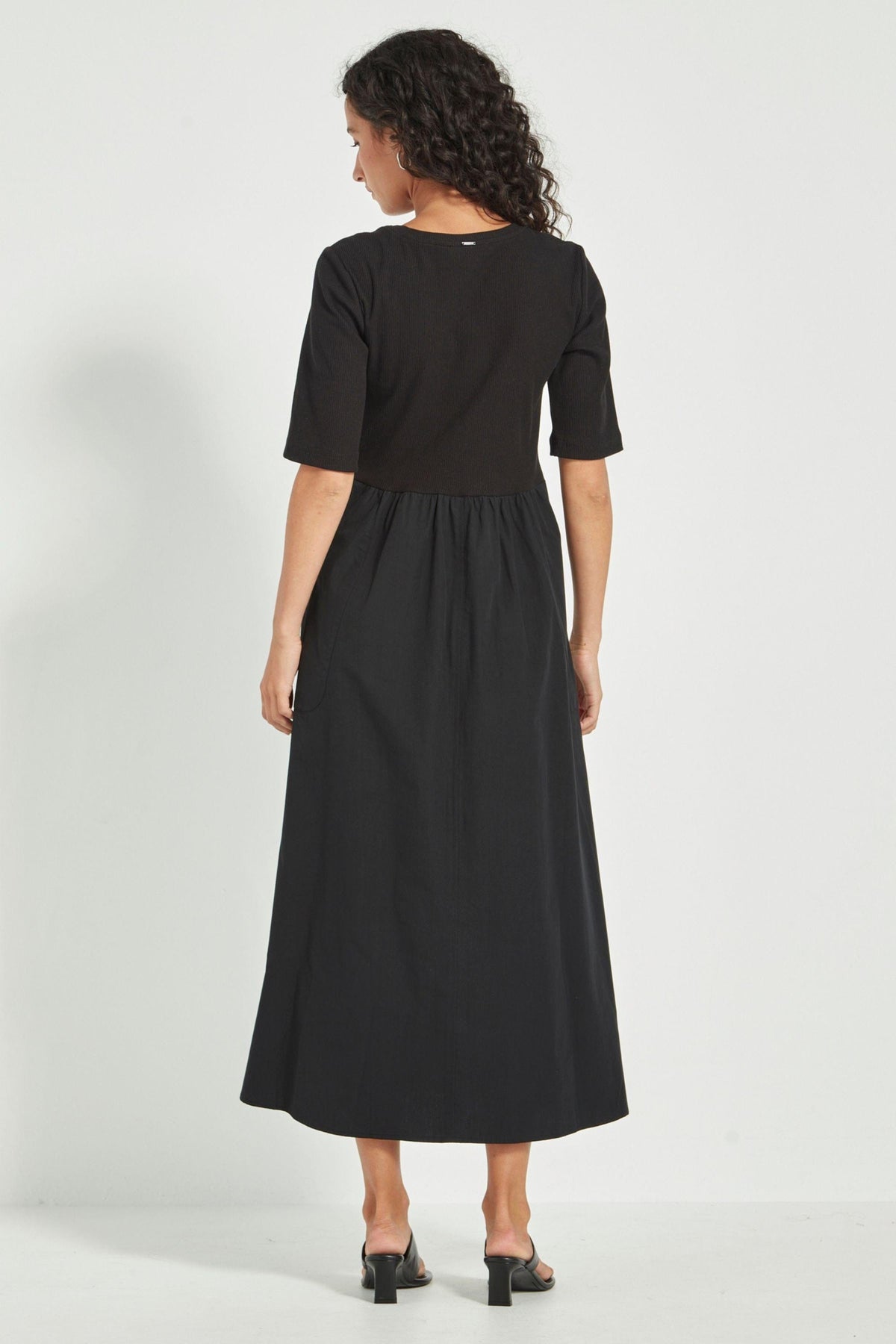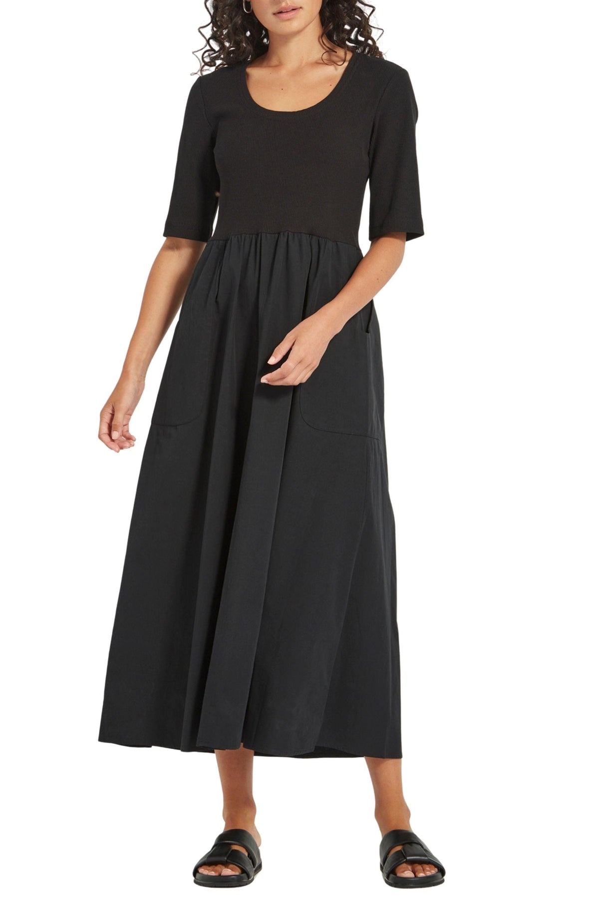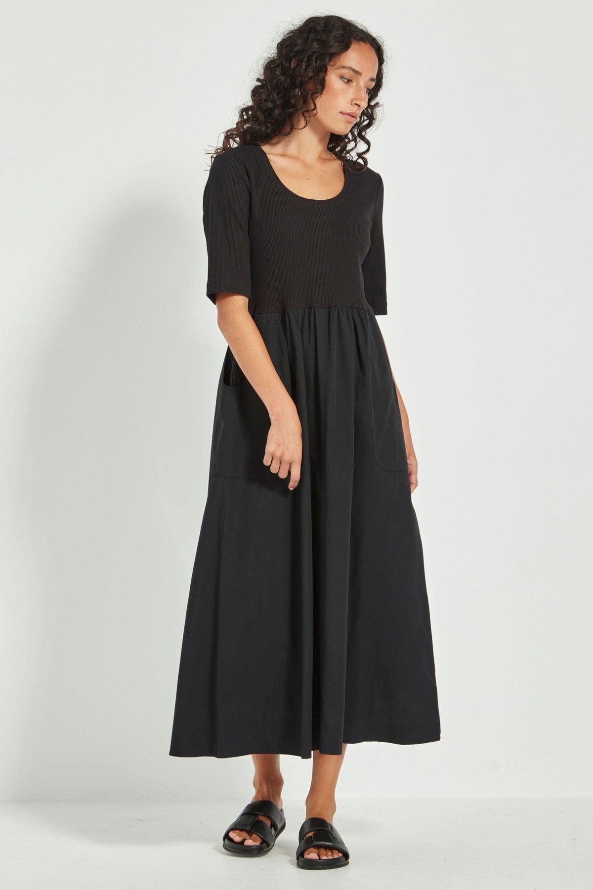 Effortlessly elegant, the Contessa Dress is designed to take you from day to night with ease. A high-waisted poplin skirt gathers softly to skim the hips, complemented by curved front pockets for a flattering, functional finish. The fitted ribbed bodice offers comfortable stretch, with a scoop neckline and slim elbow-length sleeves to balance the silhouette. Finished at a midi length, with a side zip for function,  it’s the kind of piece you’ll reach for again and again.