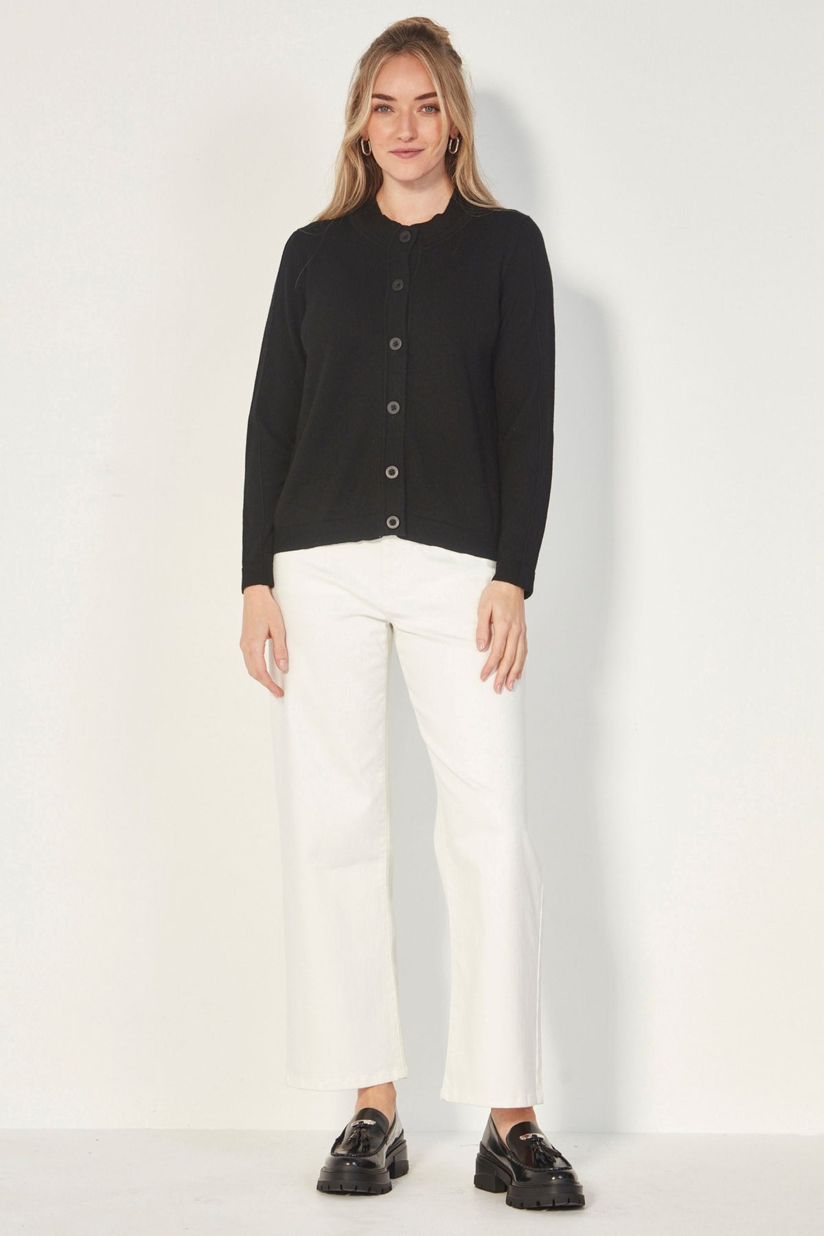 100% Merino cardigan with ribbed Mandarin collar. Ribbed  button through front placket. Bracelet length sleeve with ribbed cuff and panel detail on sleeve. The Luca cardigan falls to the hip. Mandarin collar. Panel detail through body and sleeve. Button through front. Bracelet length sleeve.