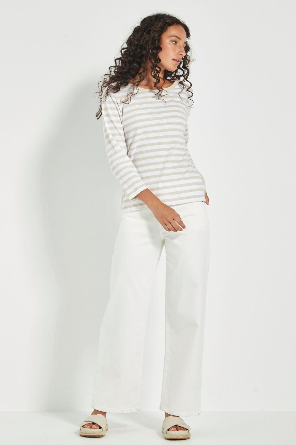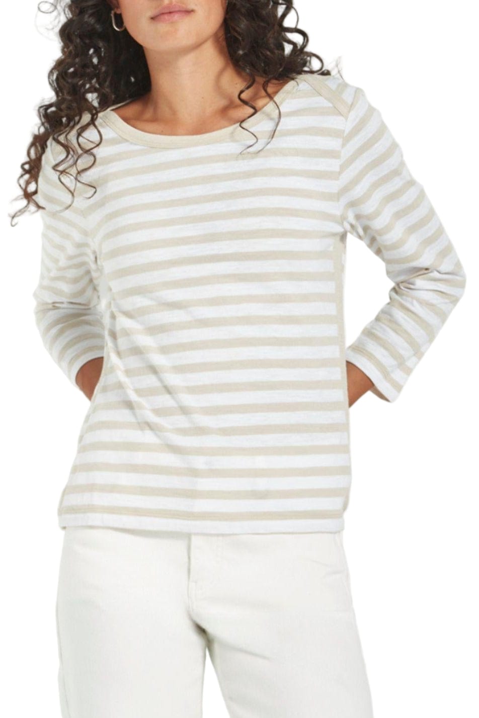The Horizon top is a sophisticated and modern addition to any wardrobe. Made from a comfortable and soft Stripe 100% Cotton, it features a unique angled stripe detail on the shoulders and a flattering rounded neckline. With elevated tape trim detail on the neckline, shoulder and each side of the top for interest. The full length sleeves and hip-length hem make it versatile for any occasion.
