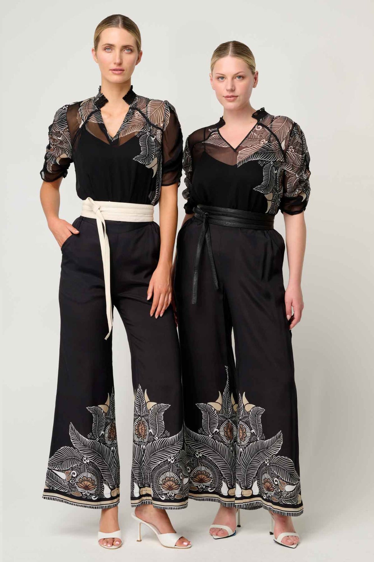 The Onyx Casablanca print, designed exclusively in Melbourne, showcases intricate botanical motifs in elegant neutral tones against a deep black base — a timeless palette that exudes refined glamour. The delicately gathered neckline and lace trim detailing highlight OnceWas’s signature craftsmanship, while the semi-sheer yoke and sleeve contrast add an alluring feminine touch.
