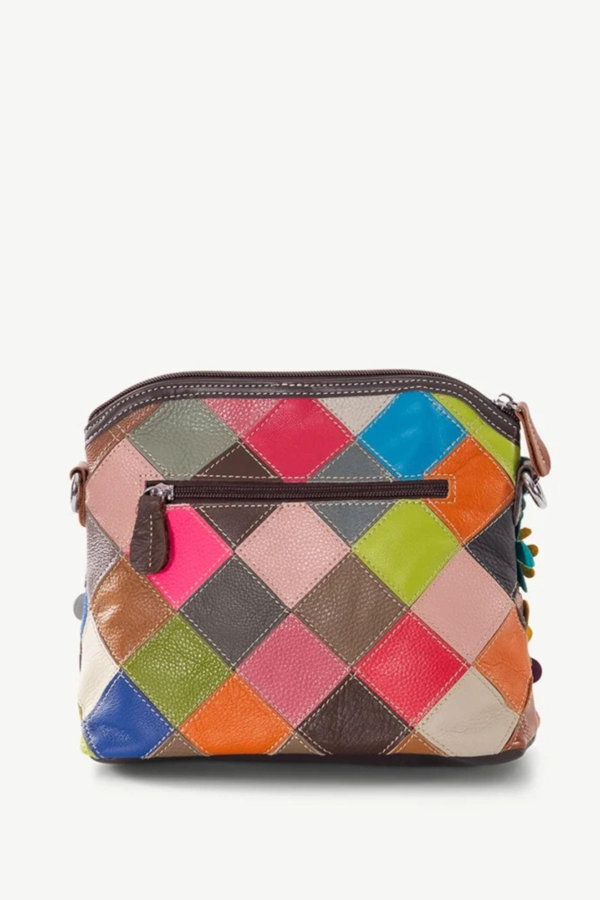 External Features: Front encrusted with multicolour leather flowers, each with central silver studs. Back is multicolour diamond leather patchwork. Zip pocket on back. All silver hardware