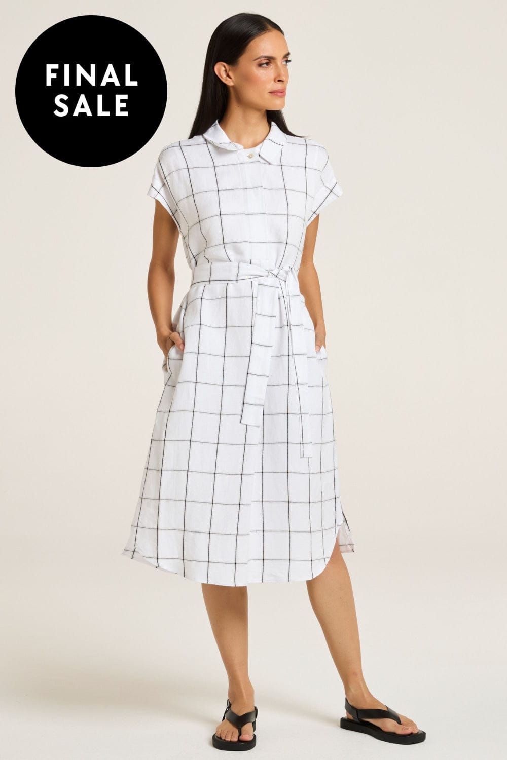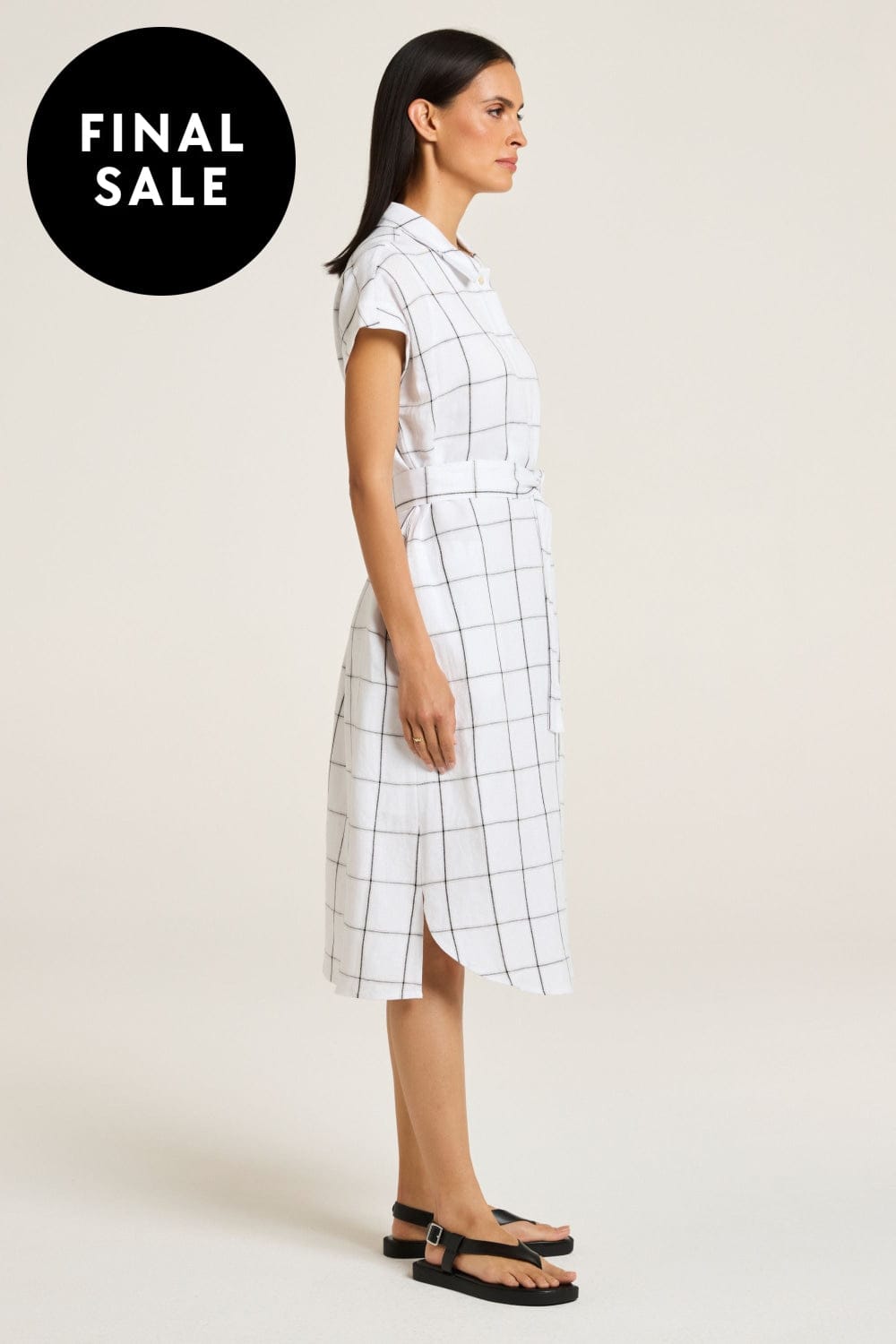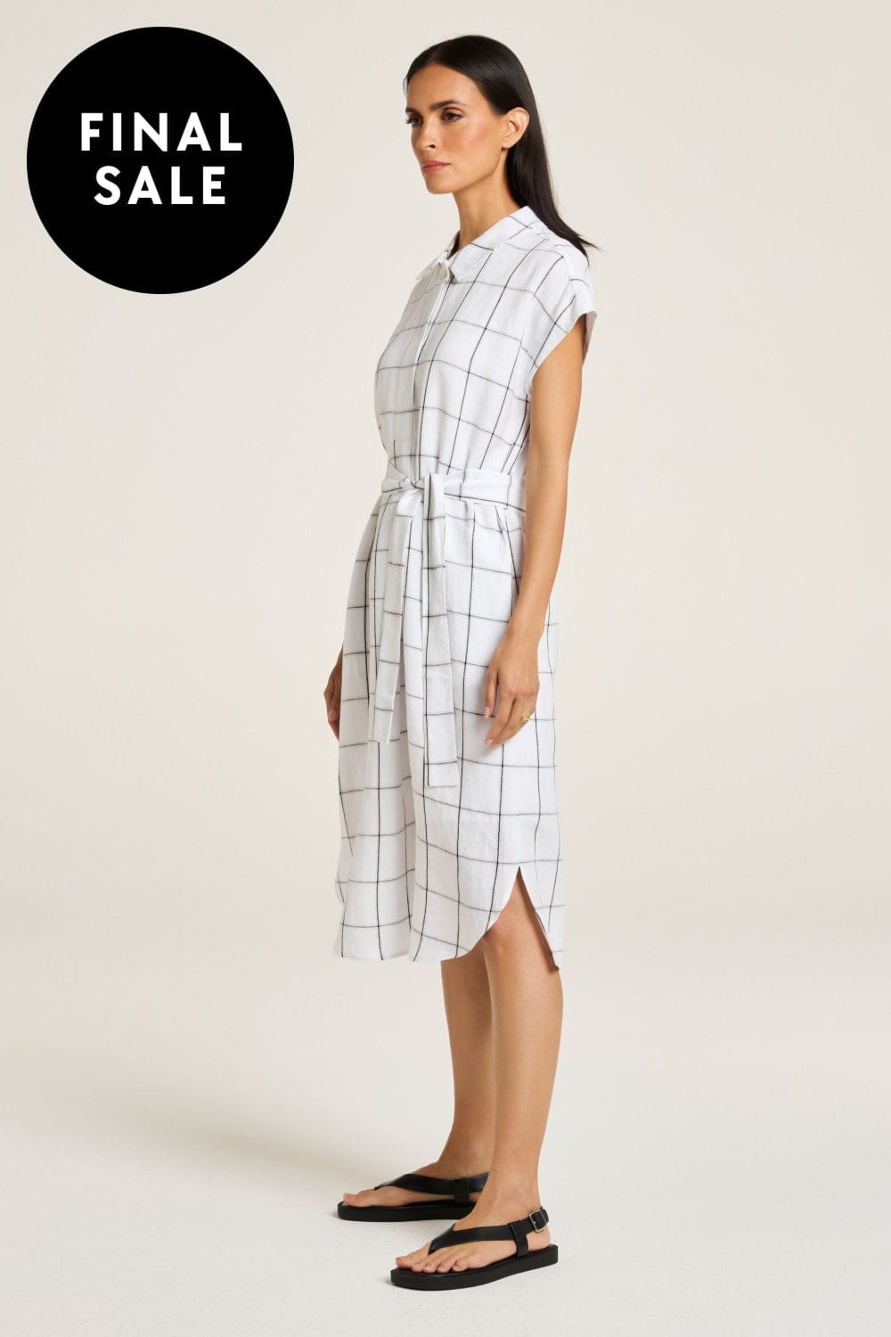 The Sentosa Dress epitomises minimal elegance with its exclusive yarn-dyed check pattern. Featuring a convertible collar and a concealed placket with a pleat, it includes extended sleeves and a waist tie for a relaxed fit. The knee-length design has a curved front hem with a split, while side pockets add practicality. Fully lined, it combines modern simplicity with timeless style, perfect for your summer wardrobe.