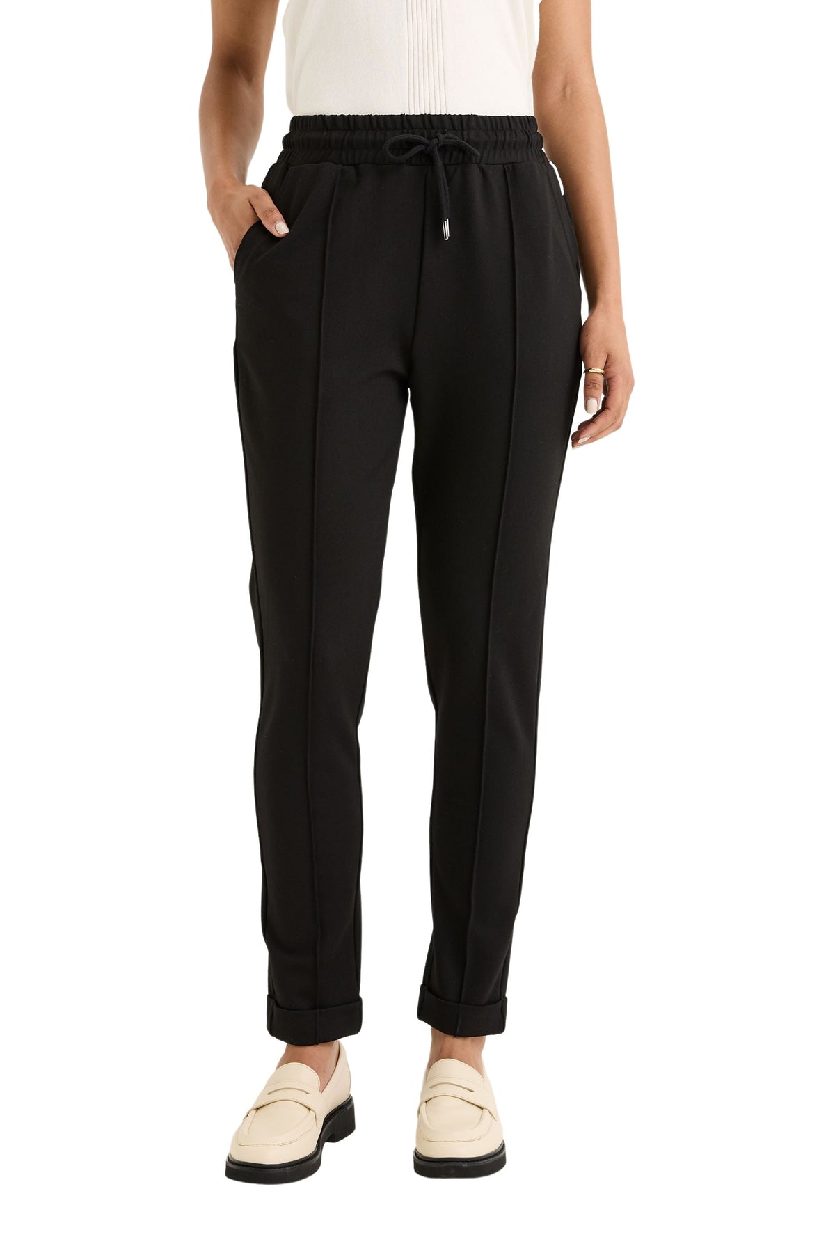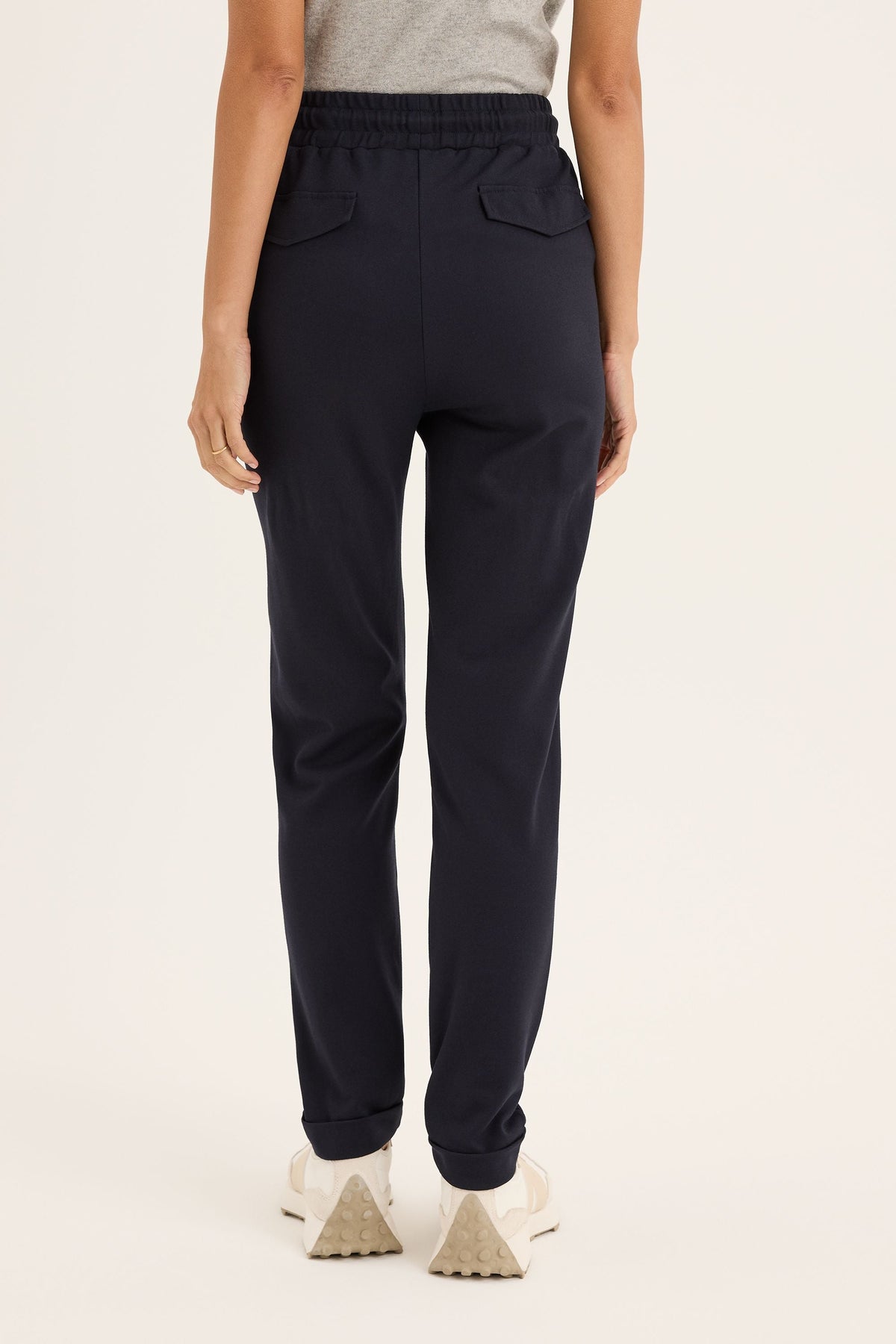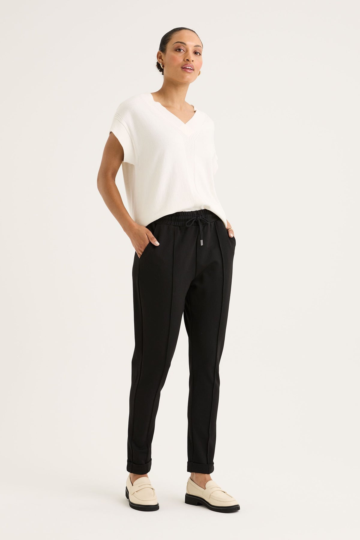 The Vine Jogger combines comfort and style with its elasticated waistband, offering a secure and flexible fit. It features functional front slant pockets for practical storage, along with mocked back flap pockets for added detail. The turned-up hem gives the jogger a trendy finish, while the easy fit silhouette flatters the figure. With a full-length cut, this jogger is perfect for creating a sleek, comfortable look that can easily transition from casual to more polished outfits.