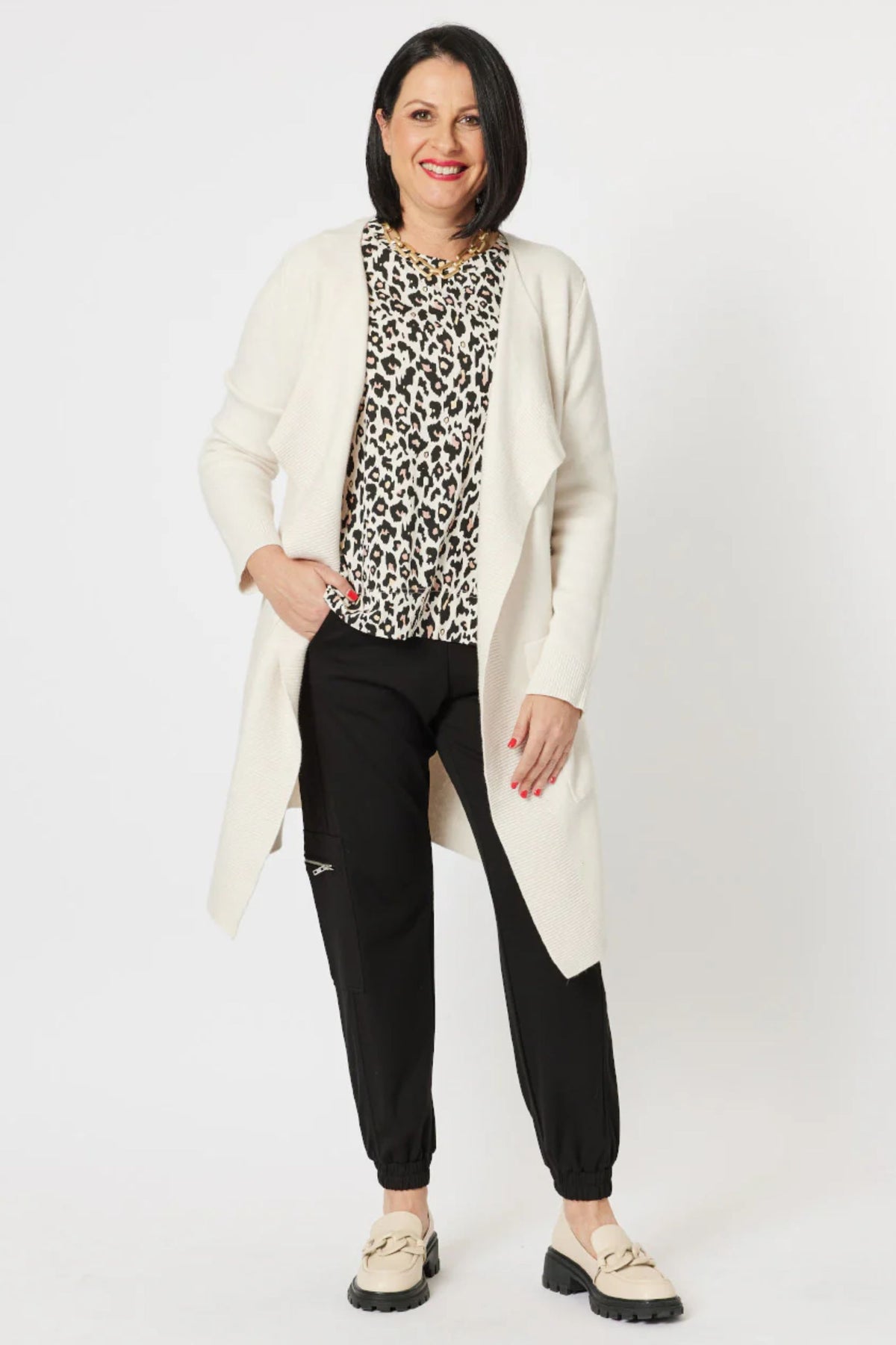 The Animal Print Top is lightweight and super comfy, great for layering under the Leigh Waterfall Cardigan or the Brighton Puffer Vest. Add a ponte pant for workday style or make it casual with the Distressed Jean in natural or black.