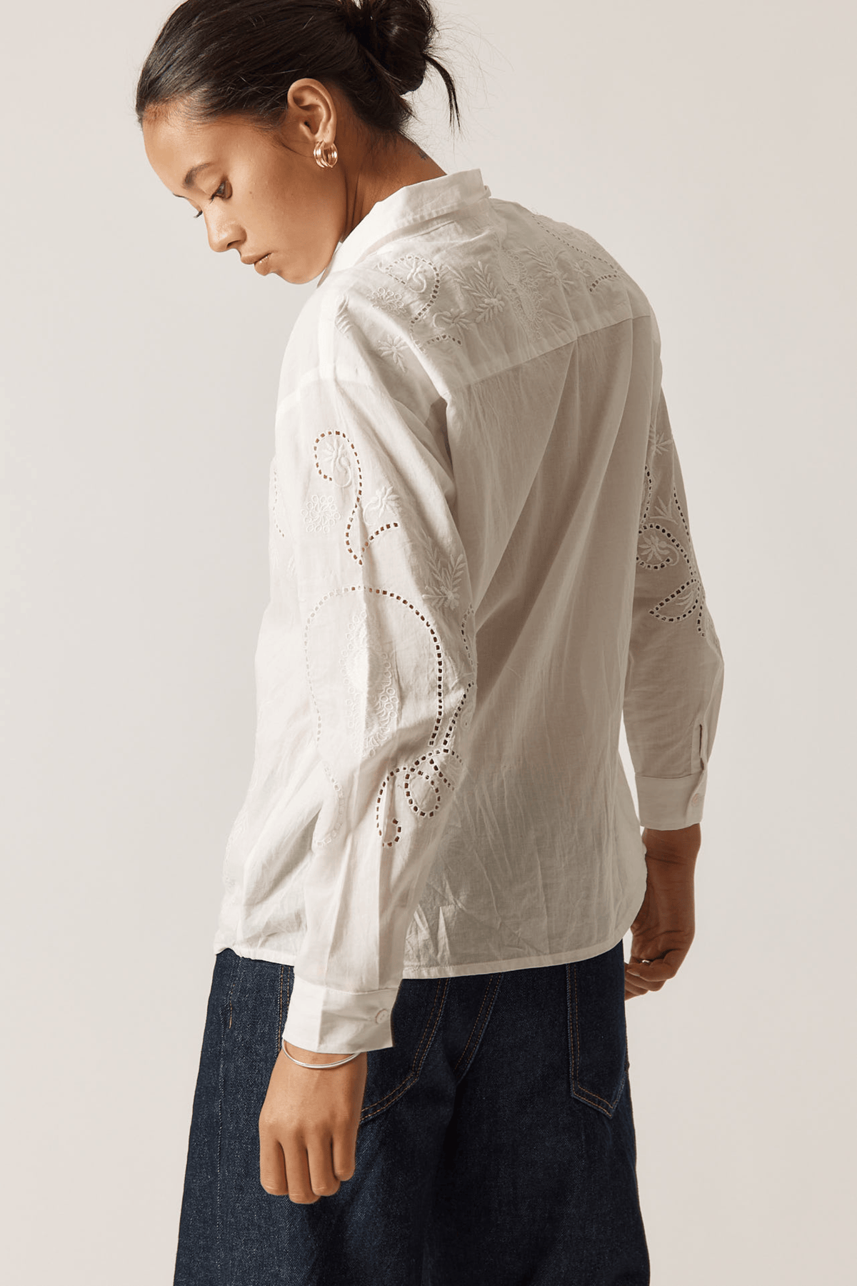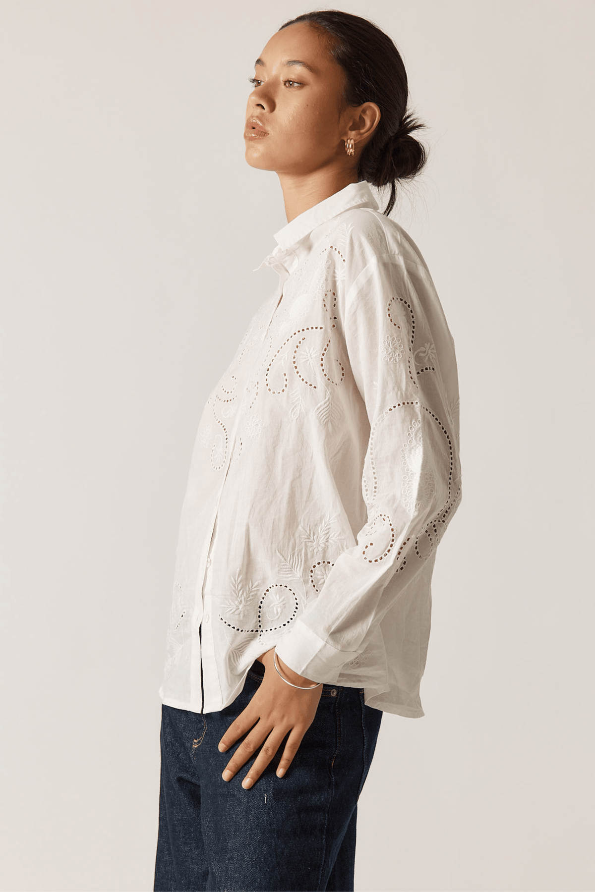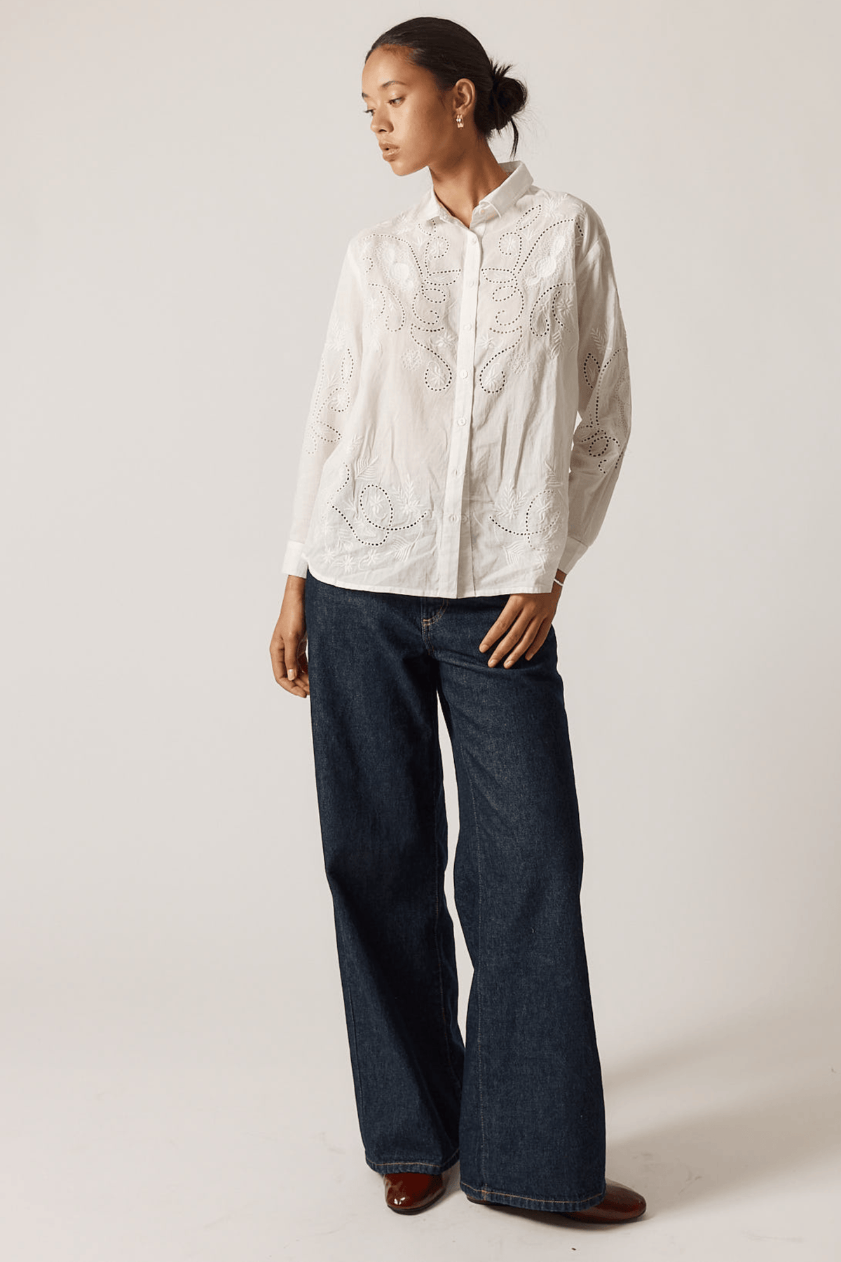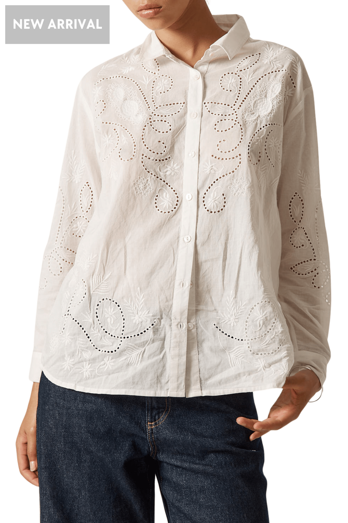 The Driftwood Shirt is a versatile white button-front piece crafted from 100% cotton. Featuring delicate embroidered detailing, this classic wardrobe essential transitions effortlessly from casual to polished. Pair it with jeans for relaxed weekend style or layer it under tailored trousers for a refined look.